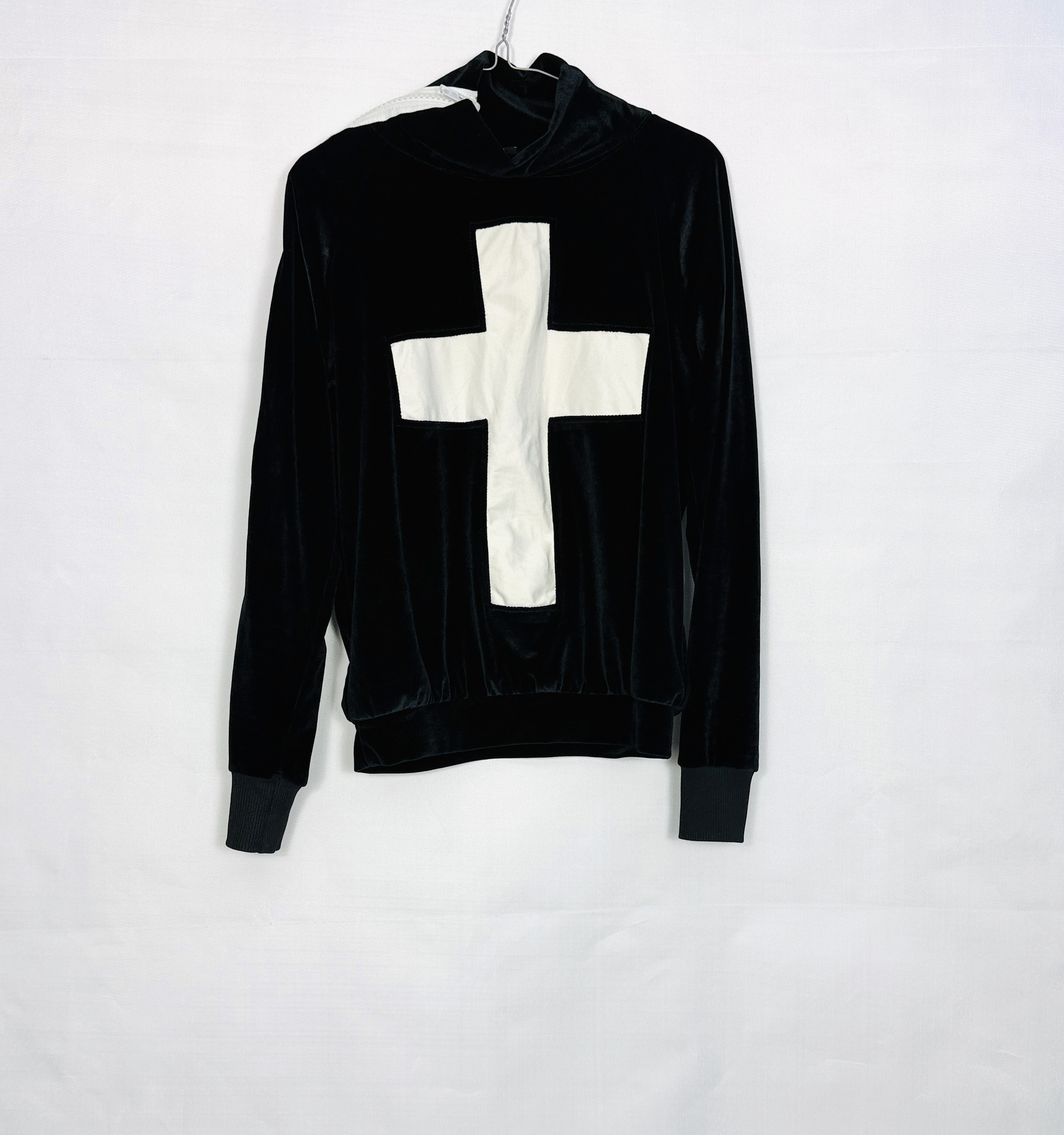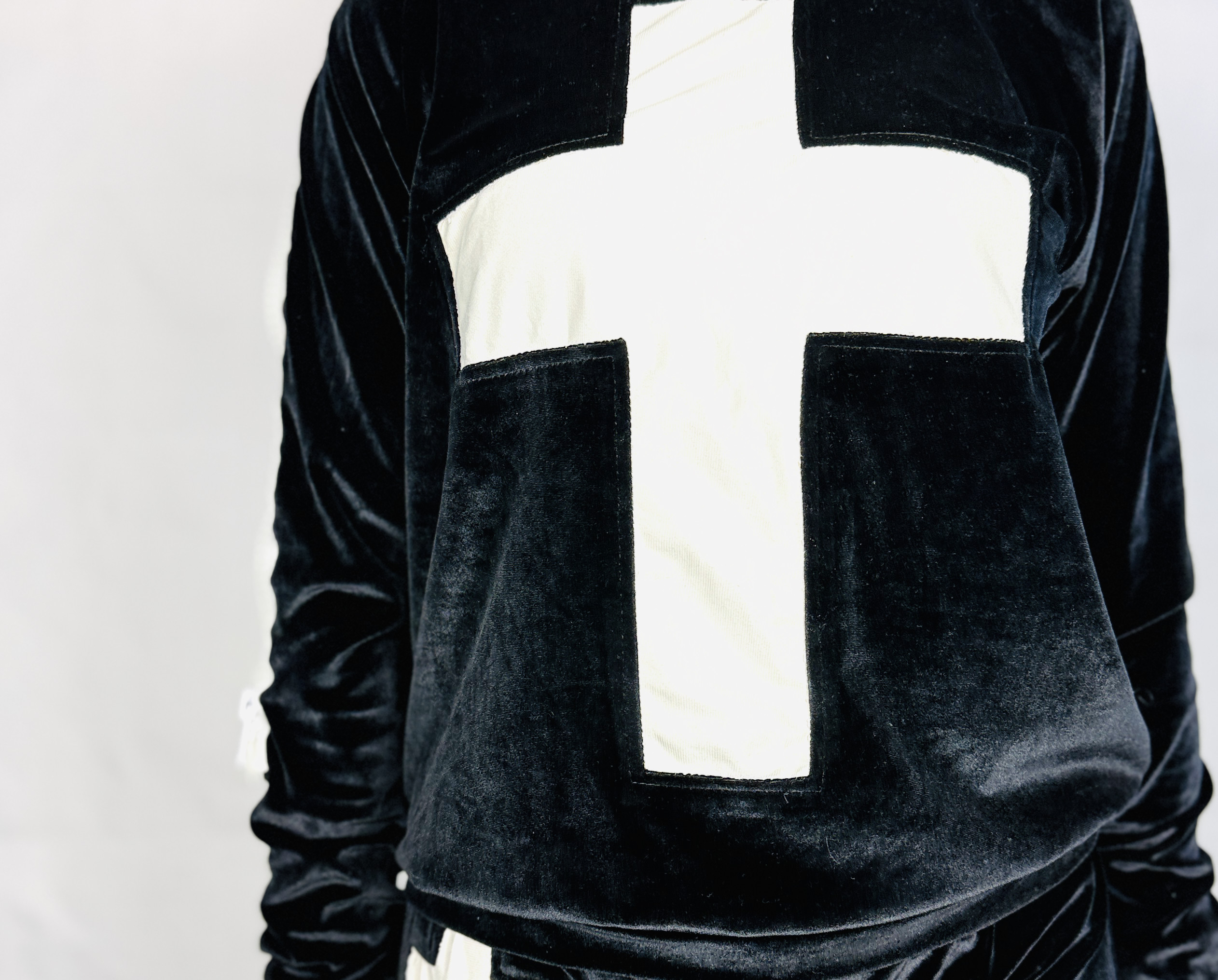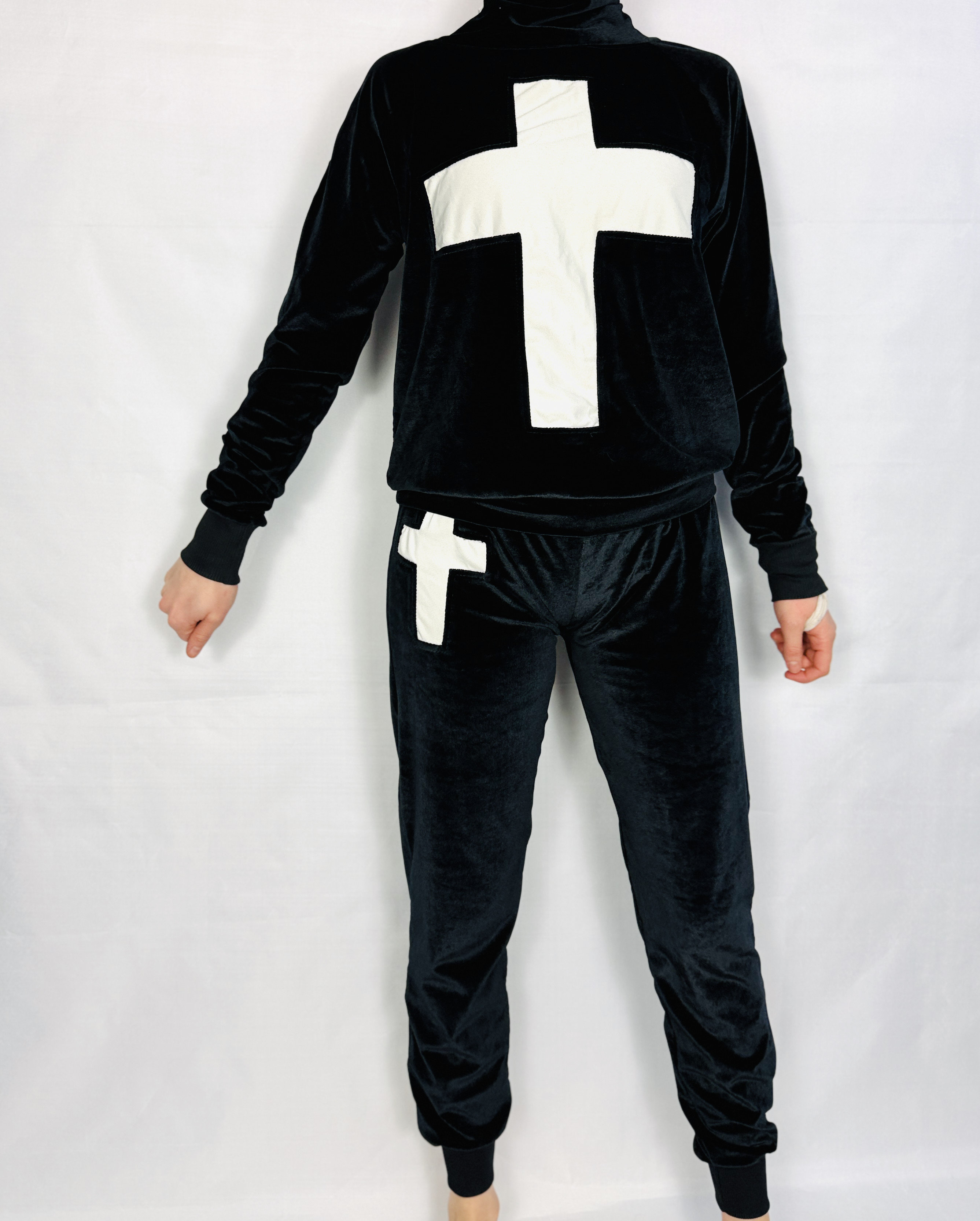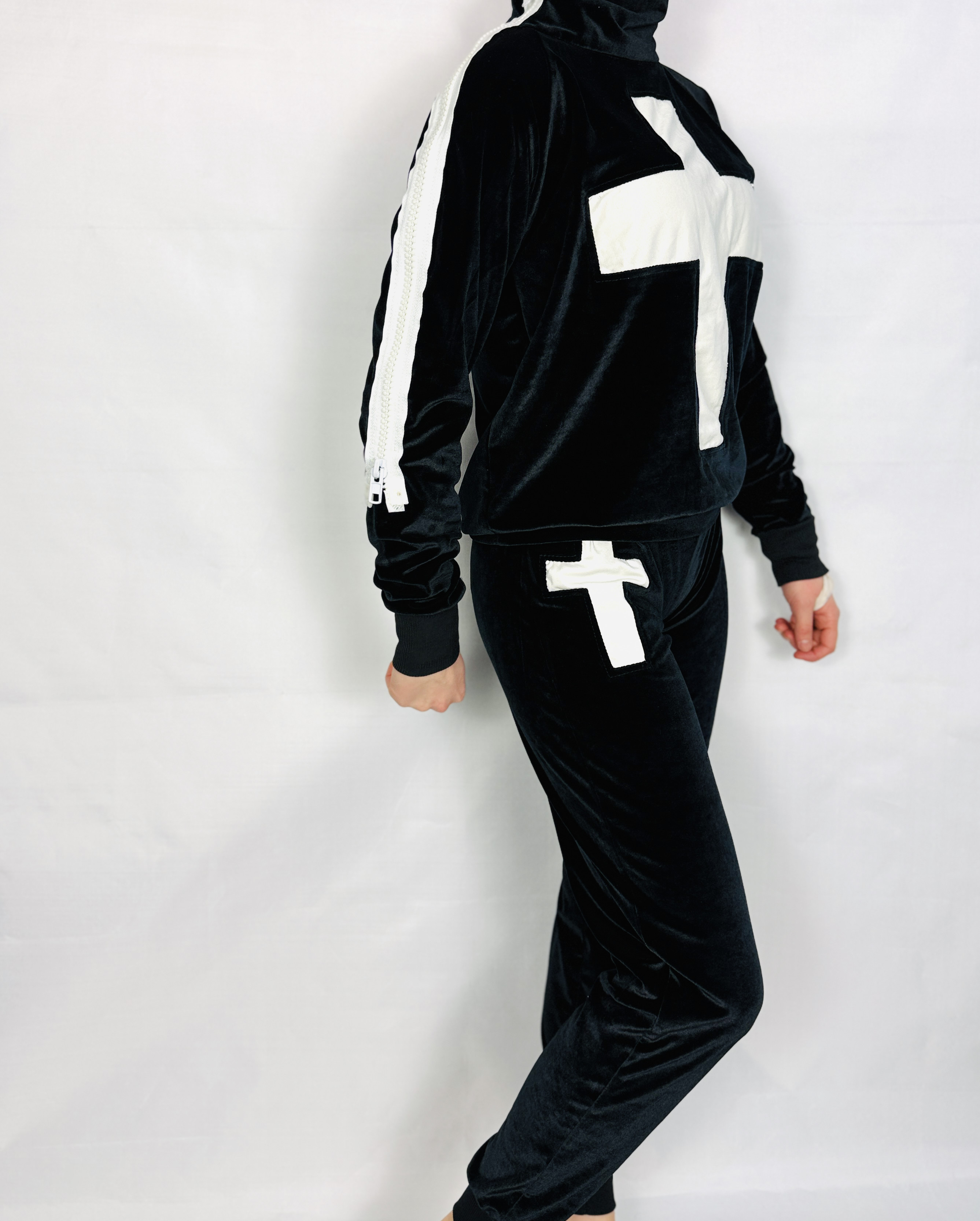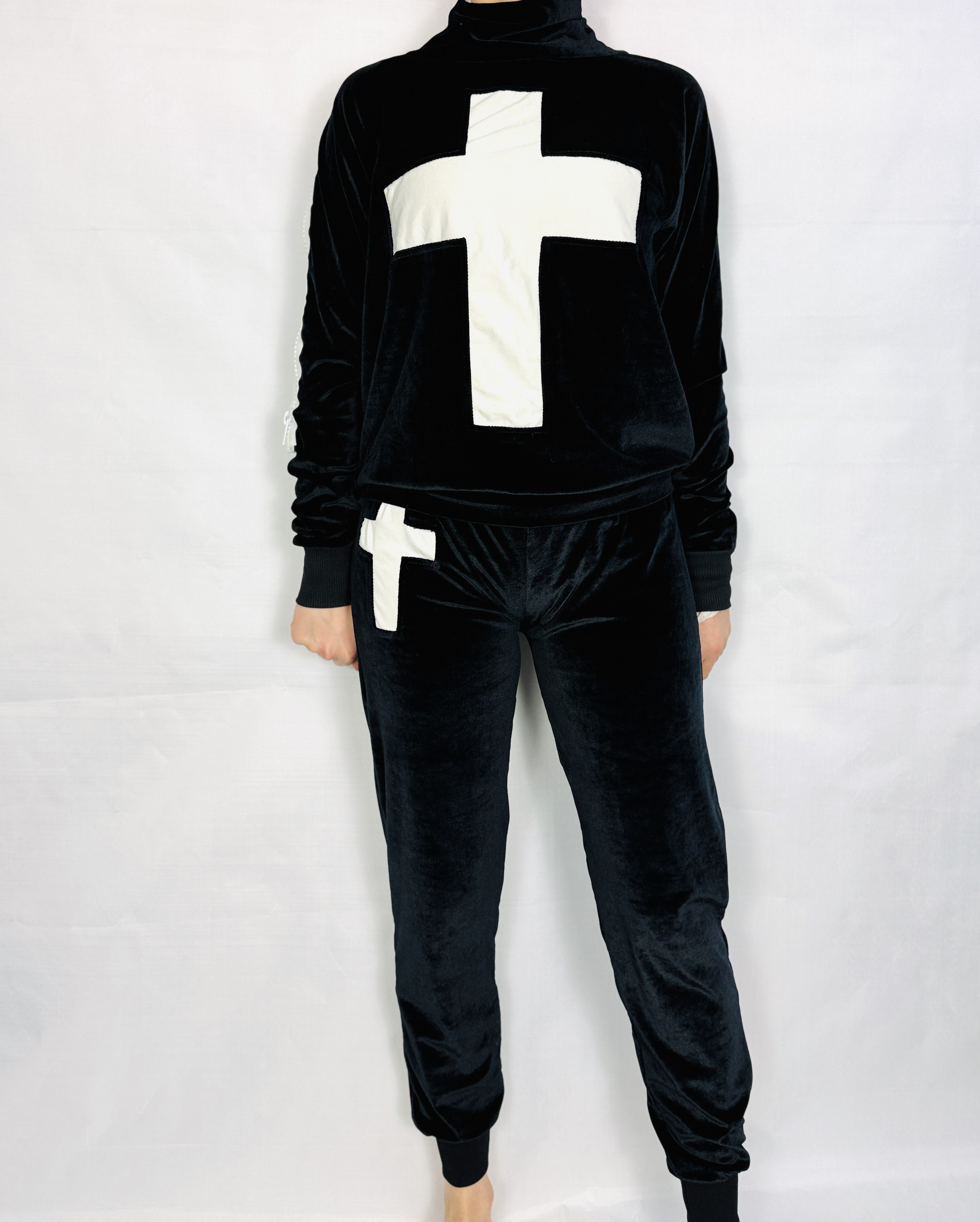 Ten komplet dresowy to połączenie miejskiego luzu i aksamitnej elegancji; głęboka czerń w kontrastowym zestawieniu z białym krzyżem nadaje mu wyrazisty, modowy charakter, a jednocześnie zachowuje przytulny, kobiecy nastrój. Projekt brzmi świeżo i zdecydowanie — jest to zestaw, który łączy komfort codziennego dresu z bardziej dopracowaną, aksamitną fakturą, co sprawia, że całość zyskuje lekko luksusowy akcent bez nadmiernej dekoracyjności.