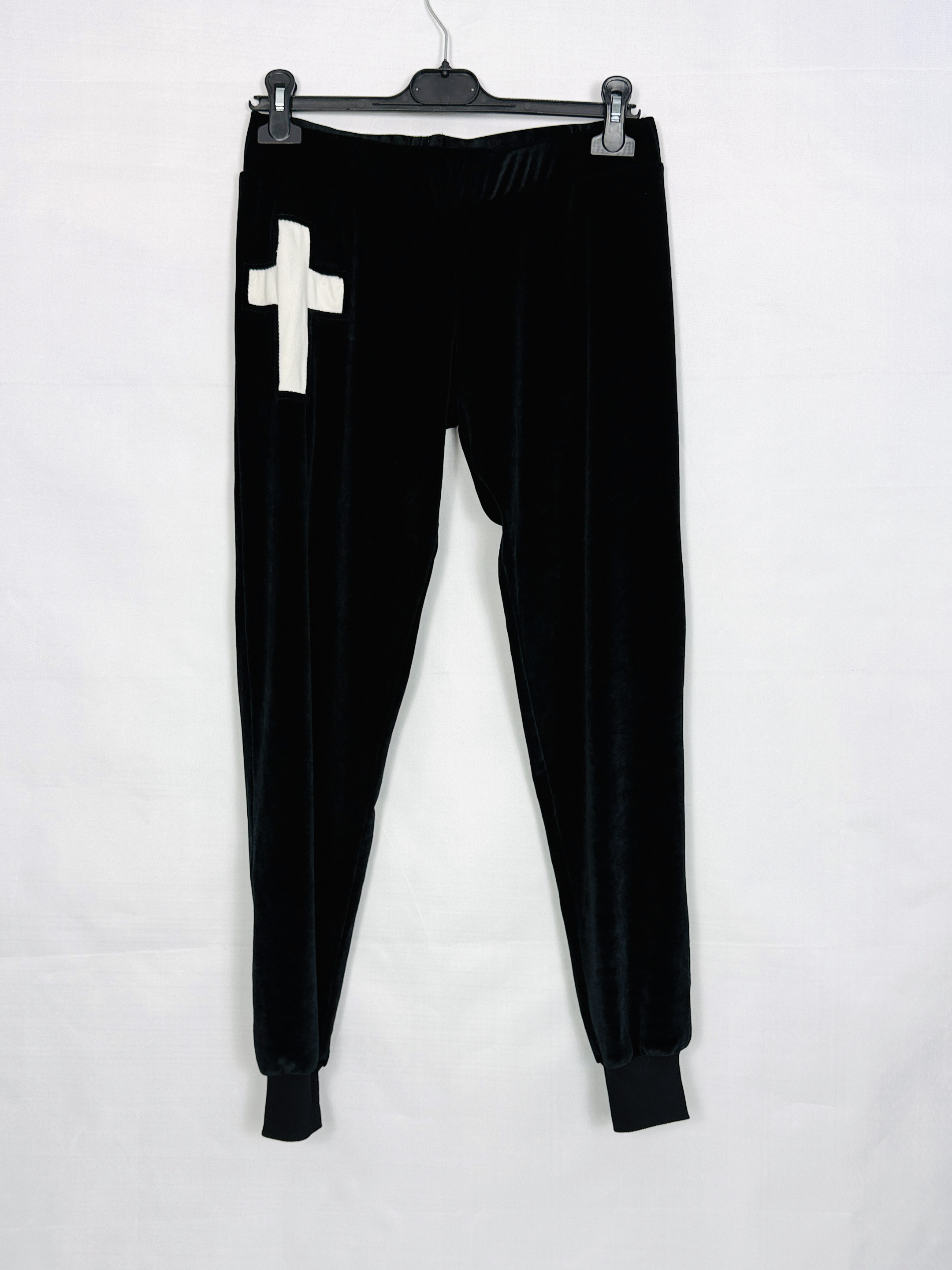 Spodnie mają klasyczny joggingowy fason z dopasowanymi ściągaczami przy kostkach, dzięki czemu linia nogi jest wydłużona, a sylwetka zyskuje sportowy, ale schludny kontur. Wysoka lub średnia talia jest subtelnie zarysowana, a nogawki układają się z lekkimi fałdami, dodając całości miękkości. Na górnej części nogawki widoczny jest mniejszy biały krzyż jako spójny detal, który nawiązuje do ozdoby bluzy i podkreśla przemyślaną estetykę kompletu.