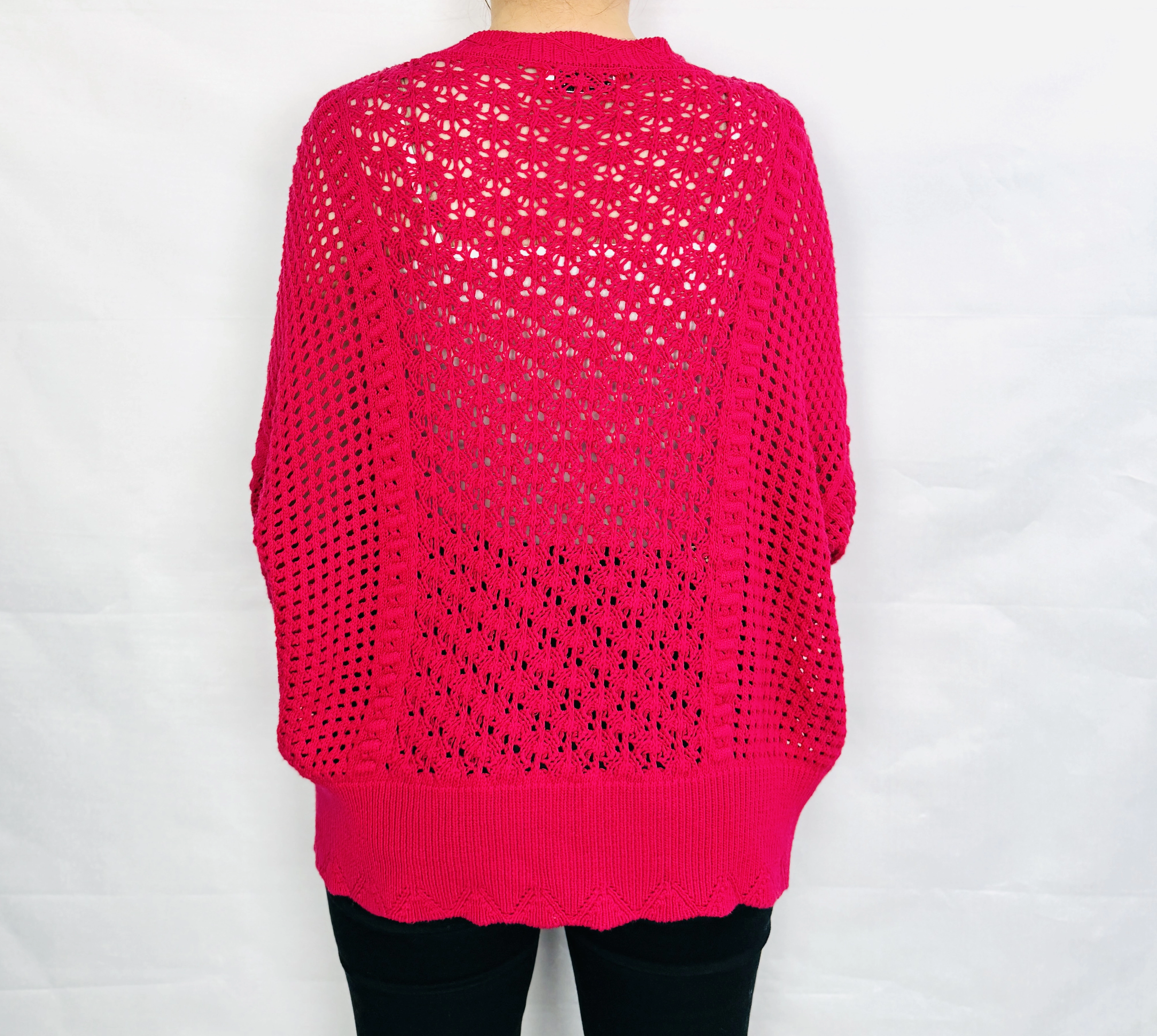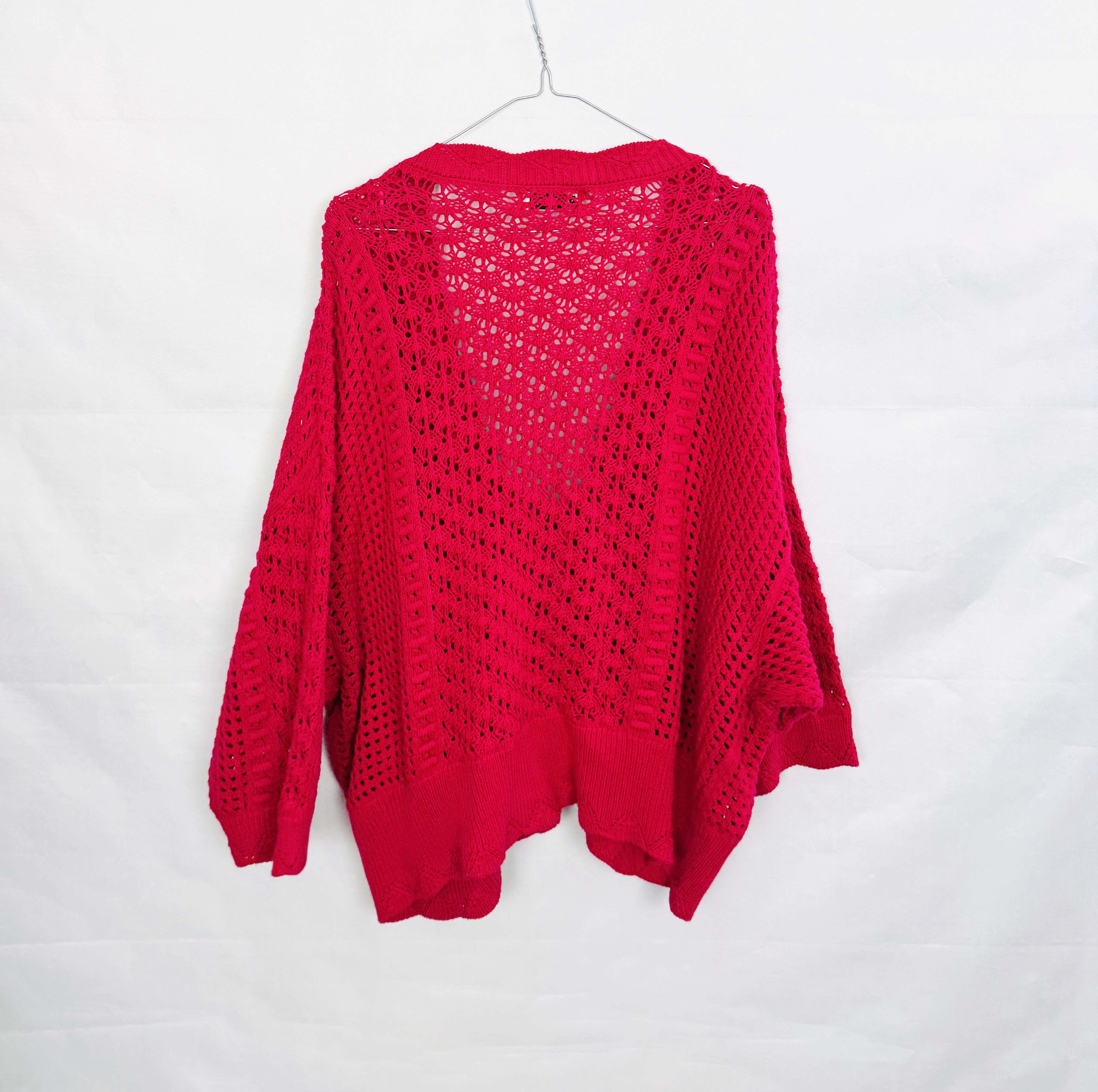 To kardigan o romantycznym i kobiecym charakterze, który natychmiast dodaje stylizacji lekkości i świeżości. Intensywny amarantowy kolor nadaje mu energetyczny, a jednocześnie elegancki wyraz, a ażurowy splot wprowadza delikatną, niemal rzeźbioną fakturę. Całość ma naturalny, rękodzielniczy urok — idealny, gdy chcesz podkreślić swoją kobiecość w nieformalny, ale przemyślany sposób.