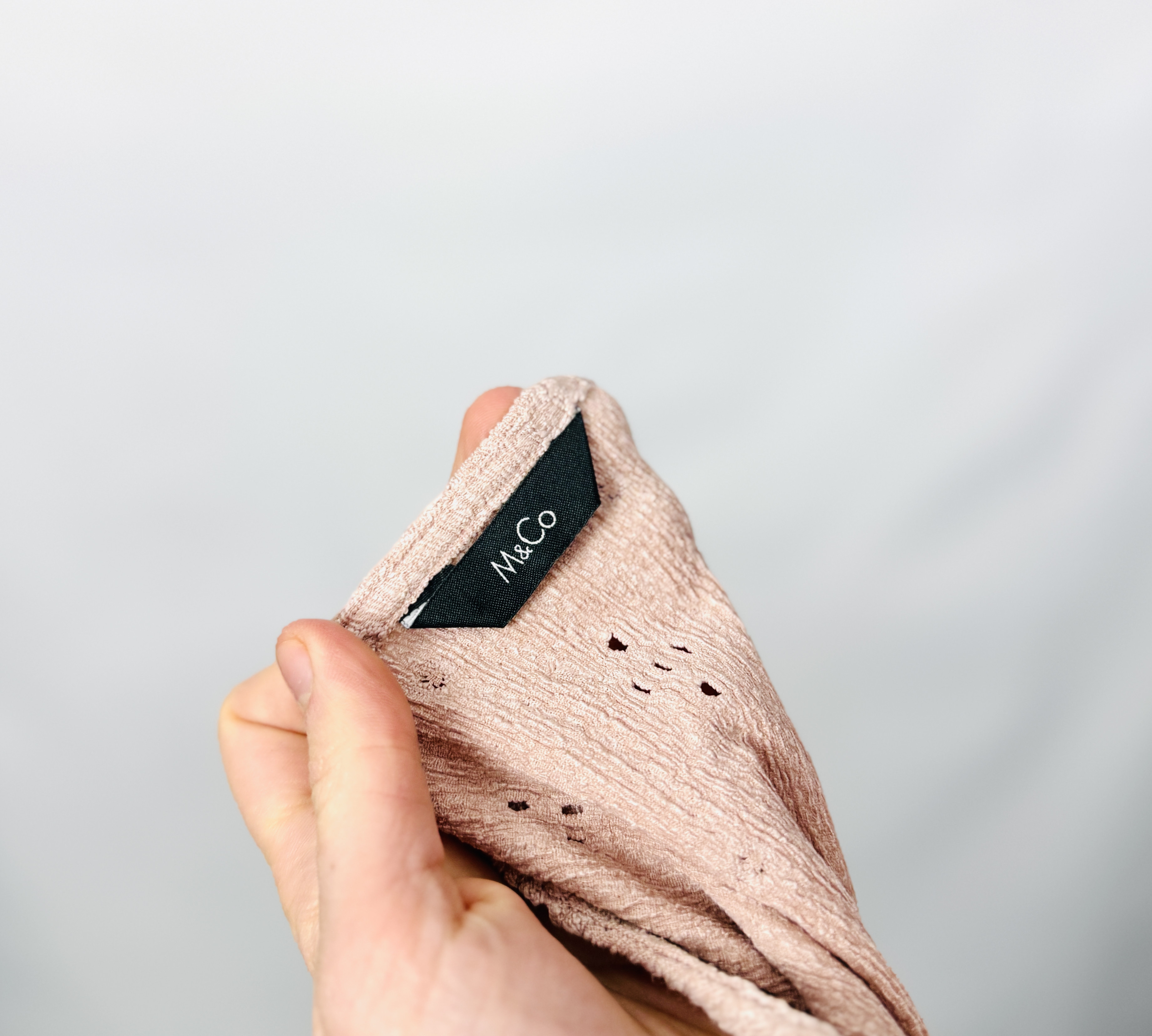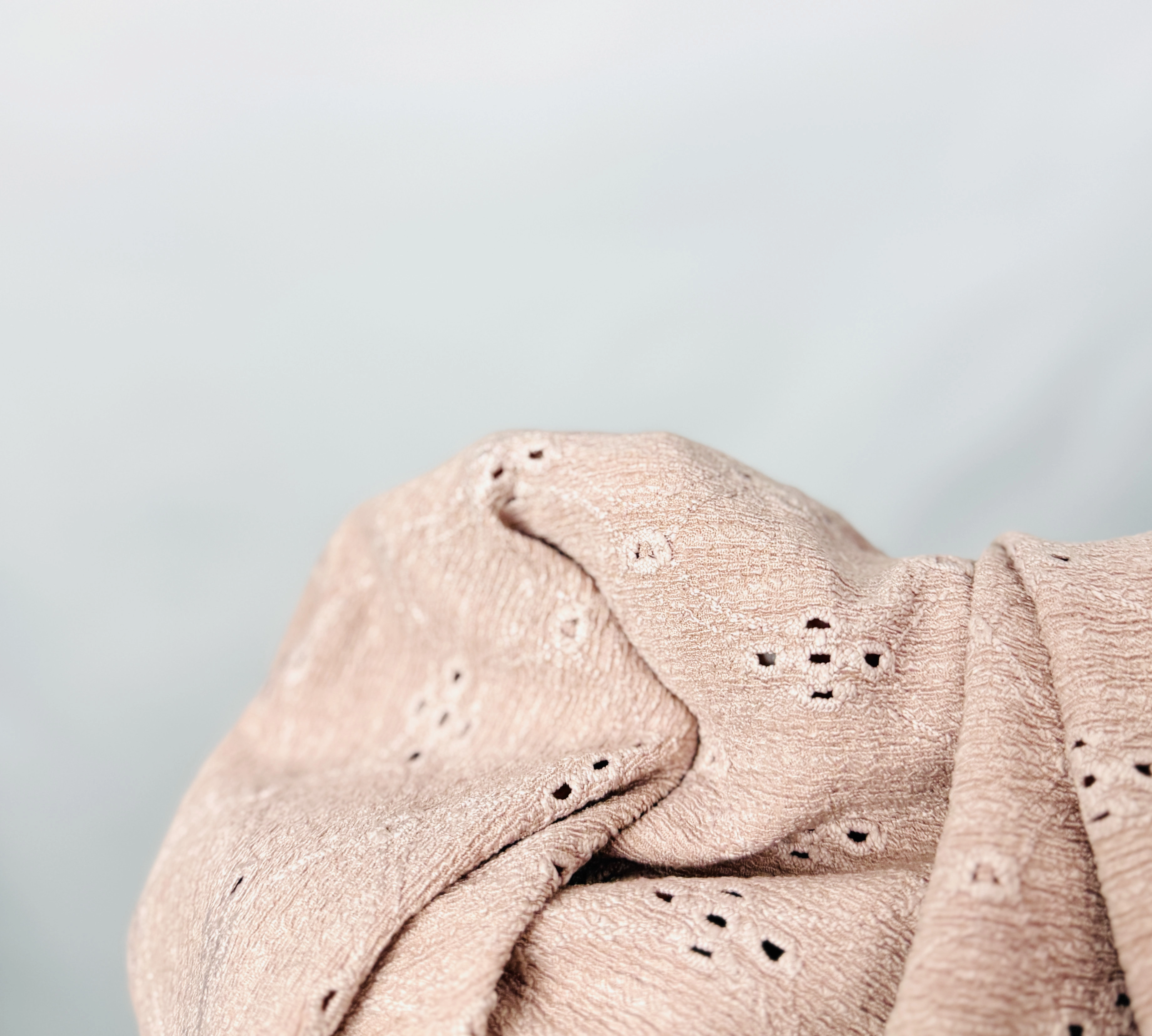 Tkanina prezentuje się jako lekko strukturalna, miękko układająca się i przyjemna w dotyku; ażurowy, drobny motyw powtarza się na całej powierzchni, dodając powierzchni delikatnej przejrzystości i faktury. Wzór ażurowy jest stonowany i ton w ton z bazą, dzięki czemu bluzka pozostaje dyskretna, a jednocześnie dekoracyjna. Materiał układa się w naturalne marszczenia tam, gdzie pracuje z ruchem ciała, co sprawia, że sylwetka zyskuje lekkość i subtelne modelowanie bez nadmiernego opinania.