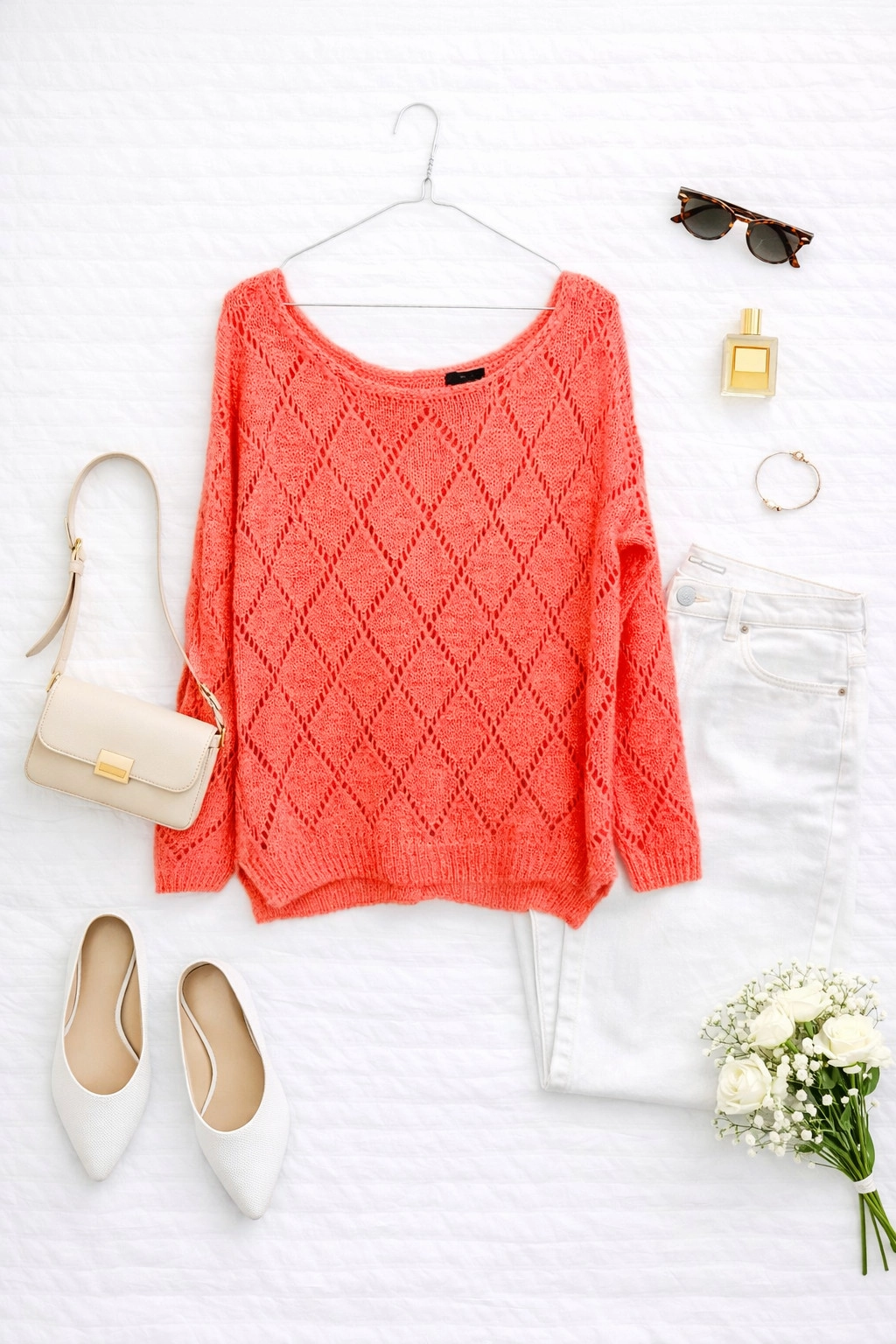 Ten ażurowy sweter to kwintesencja lekkości i kobiecej delikatności, która doskonale wpisuje się w wiosenno-letnie trendy, łącząc swobodę z subtelną elegancją. Jego intensywny, koralowy kolor emanuje energią i świeżością, dodając stylizacji radosnego, optymistycznego charakteru. To ubranie, które zachwyca swoją przewiewnością i finezyjnym wzorem, idealne dla kobiet ceniących sobie komfort i modny wygląd.