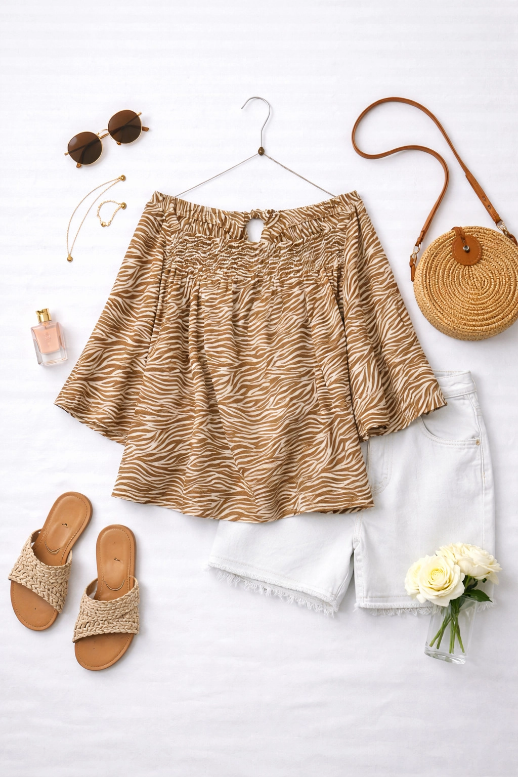 Ta bluzka przyciąga uwagę subtelną elegancją i nutą dzikiego, modowego charakteru, który nadaje jej wyjątkowej wyrazistości. Połączenie ciepłego beżu z białym wzorem inspirowanym naturą tworzy harmonijną, a jednocześnie intrygującą kompozycję. Całość emanuje lekkością i swobodą, przywodząc na myśl styl boho w nowoczesnym, bardziej uporządkowanym wydaniu. To model idealny dla kobiet, które cenią komfort, ale nie chcą rezygnować z efektownego wyglądu.