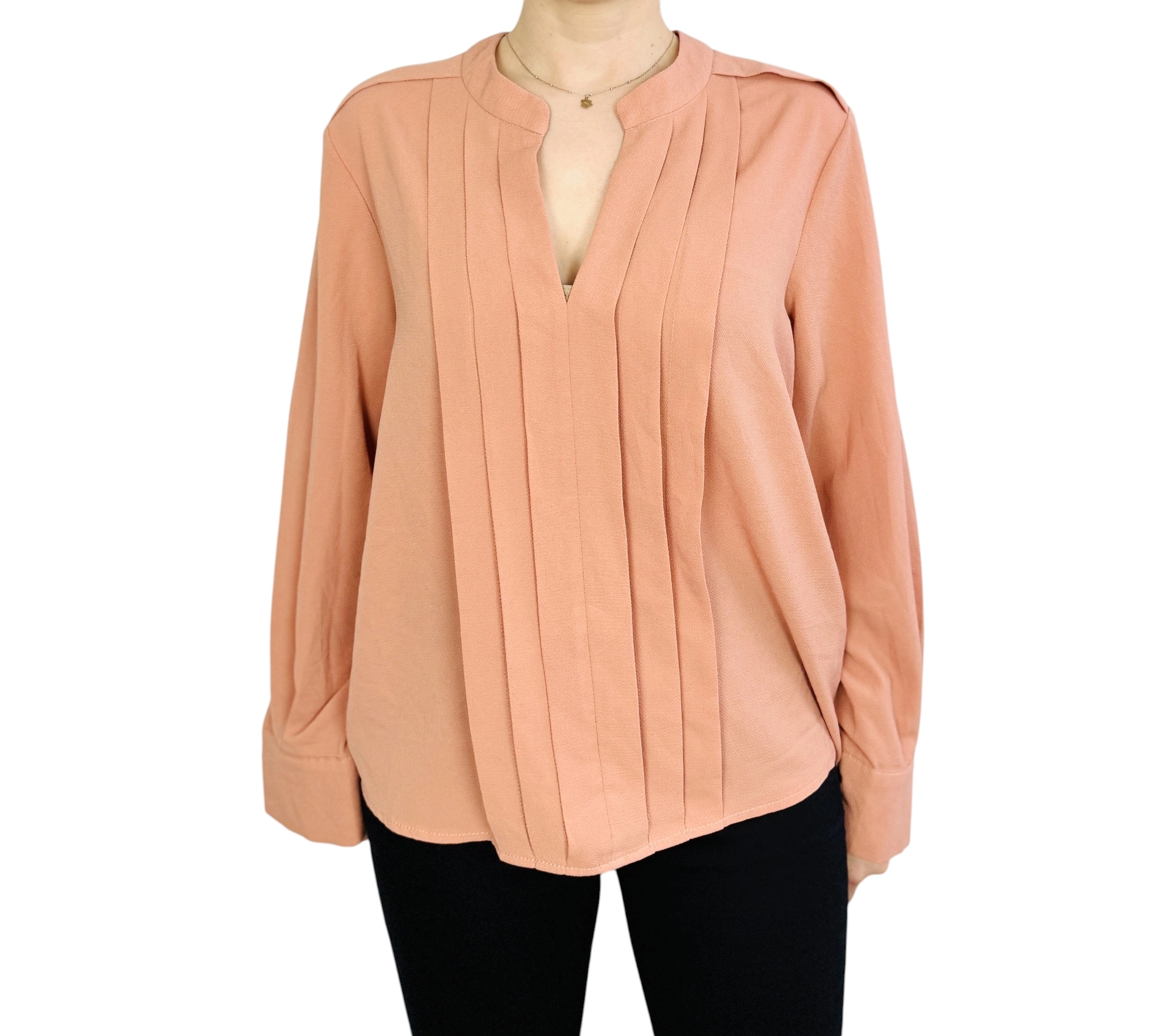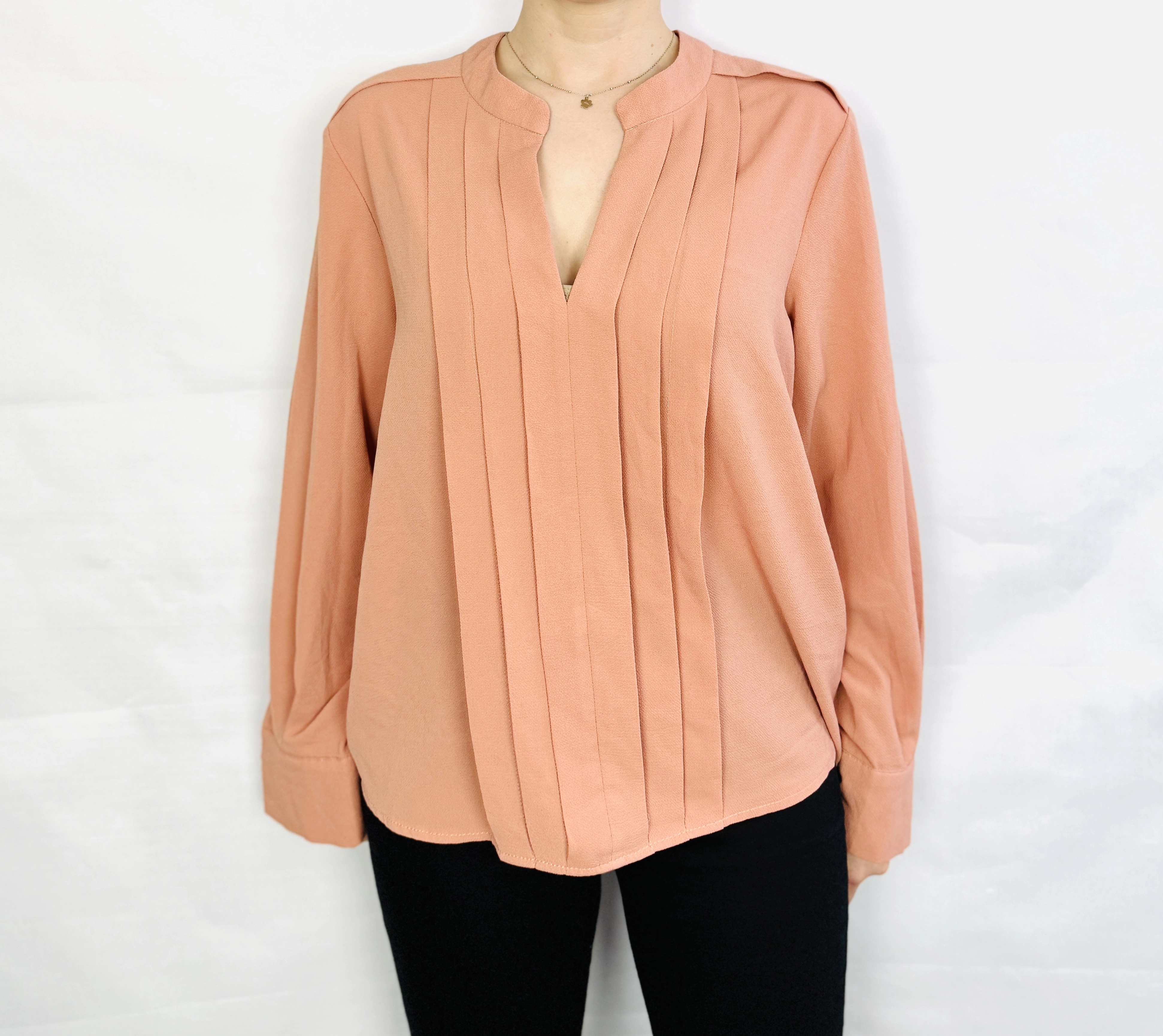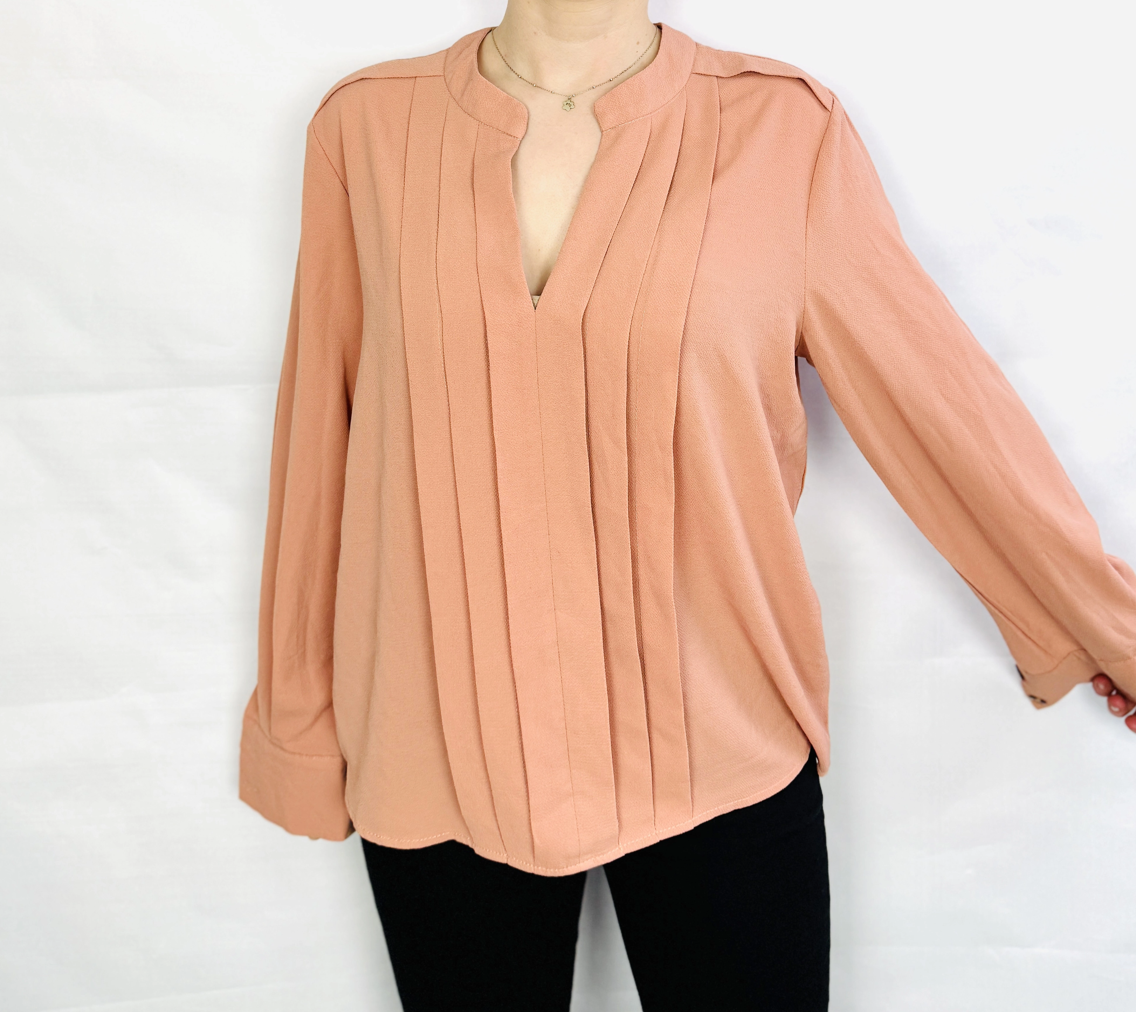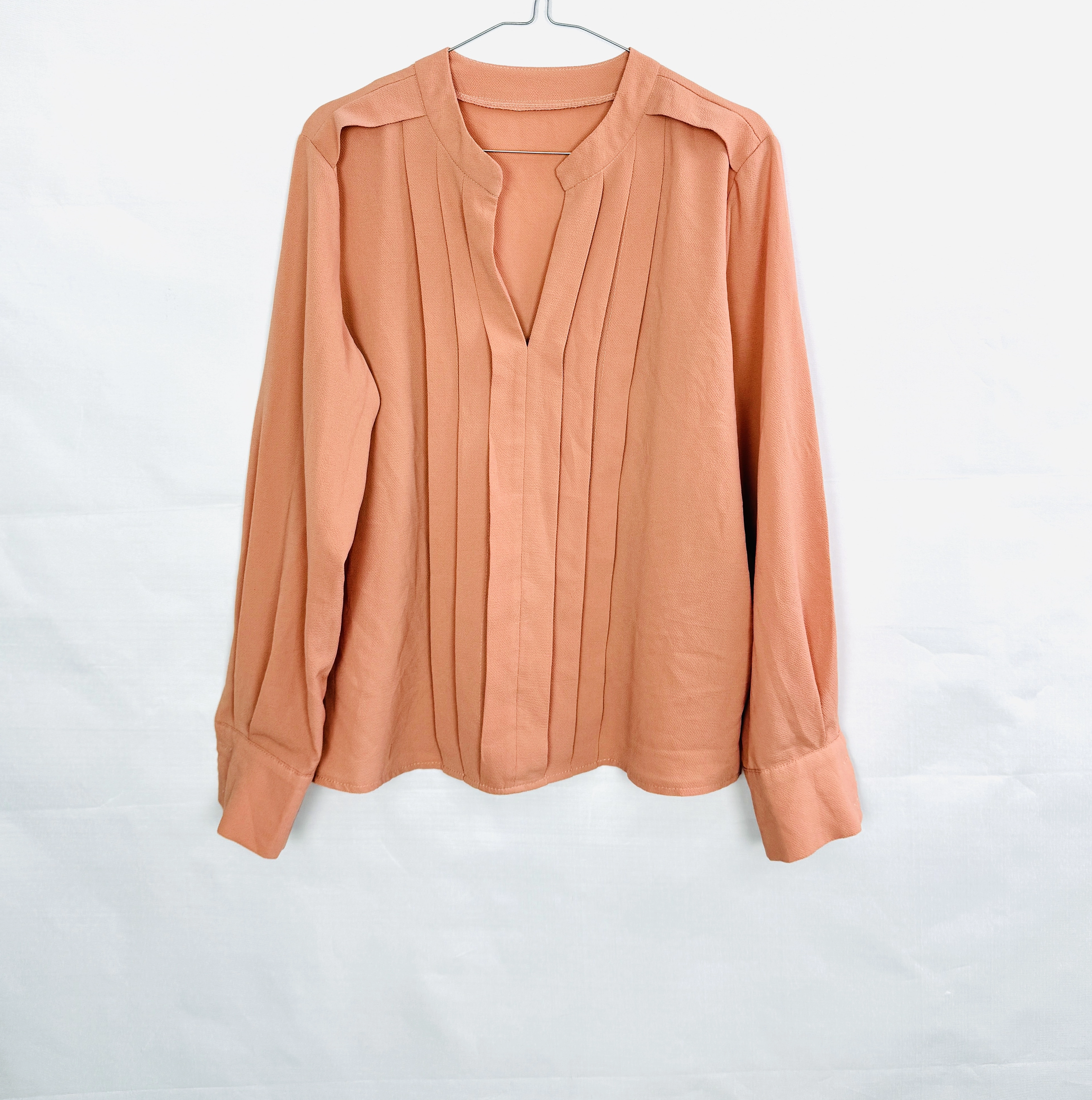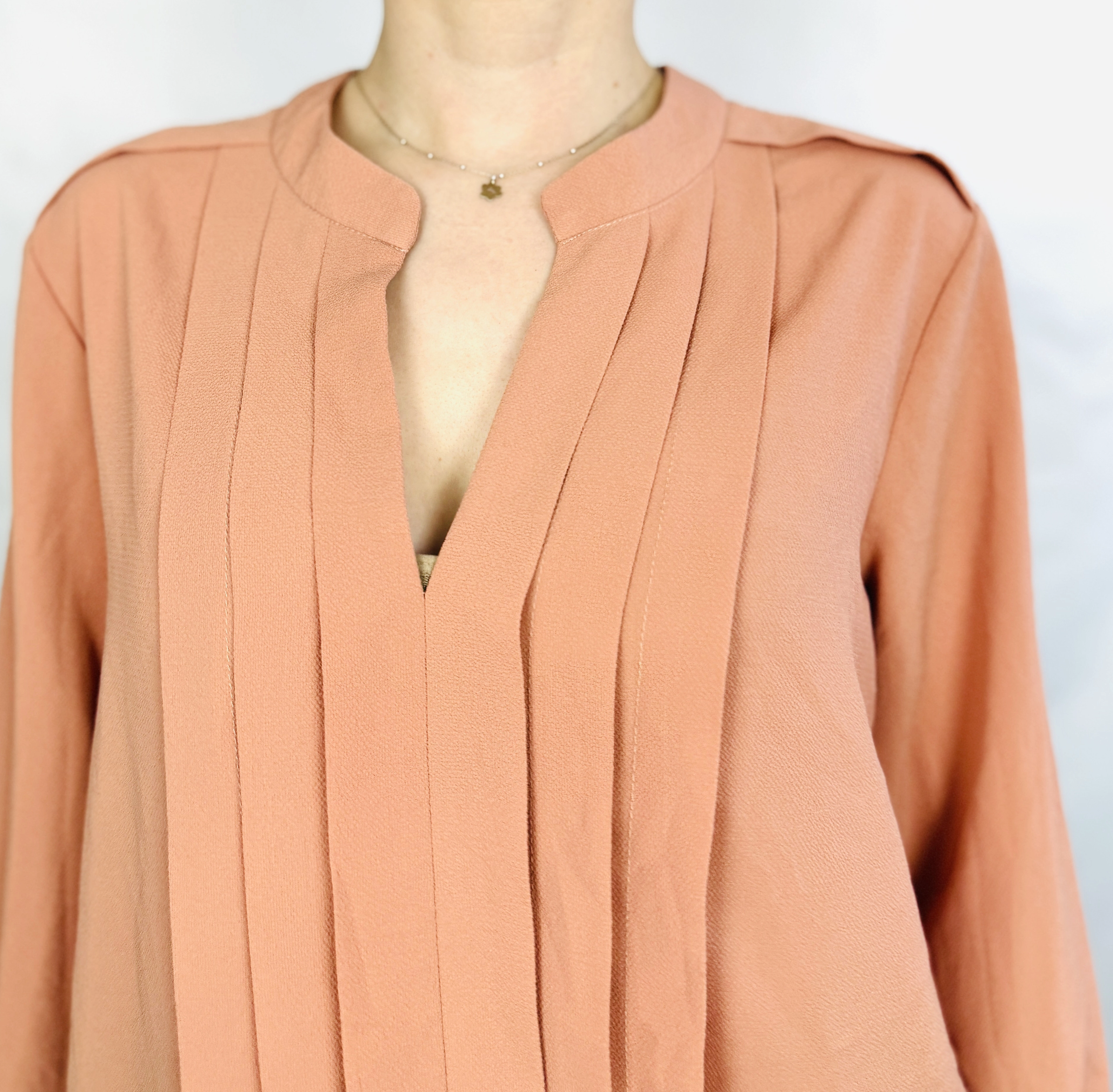 Fason bluzki charakteryzuje się swobodną, prostą linią, która miękko opływa sylwetkę, zapewniając maksymalny komfort noszenia. Największą uwagę przyciąga przód ozdobiony pionowymi, szerokimi plisami, które nadają całości struktury i unikalnego charakteru. Dekolt w kształcie litery V, wykończony niską stójką, pięknie eksponuje szyję i dodaje sylwetce lekkości, optycznie ją wysmuklając. Długie, luźne rękawy zakończone szerokimi mankietami podkreślają elegancki sznyt projektu, a brak wyraźnego odcięcia w talii sprawia, że bluzka doskonale maskuje ewentualne niedoskonałości w okolicach brzucha, nadając górze ciała smukły wygląd.