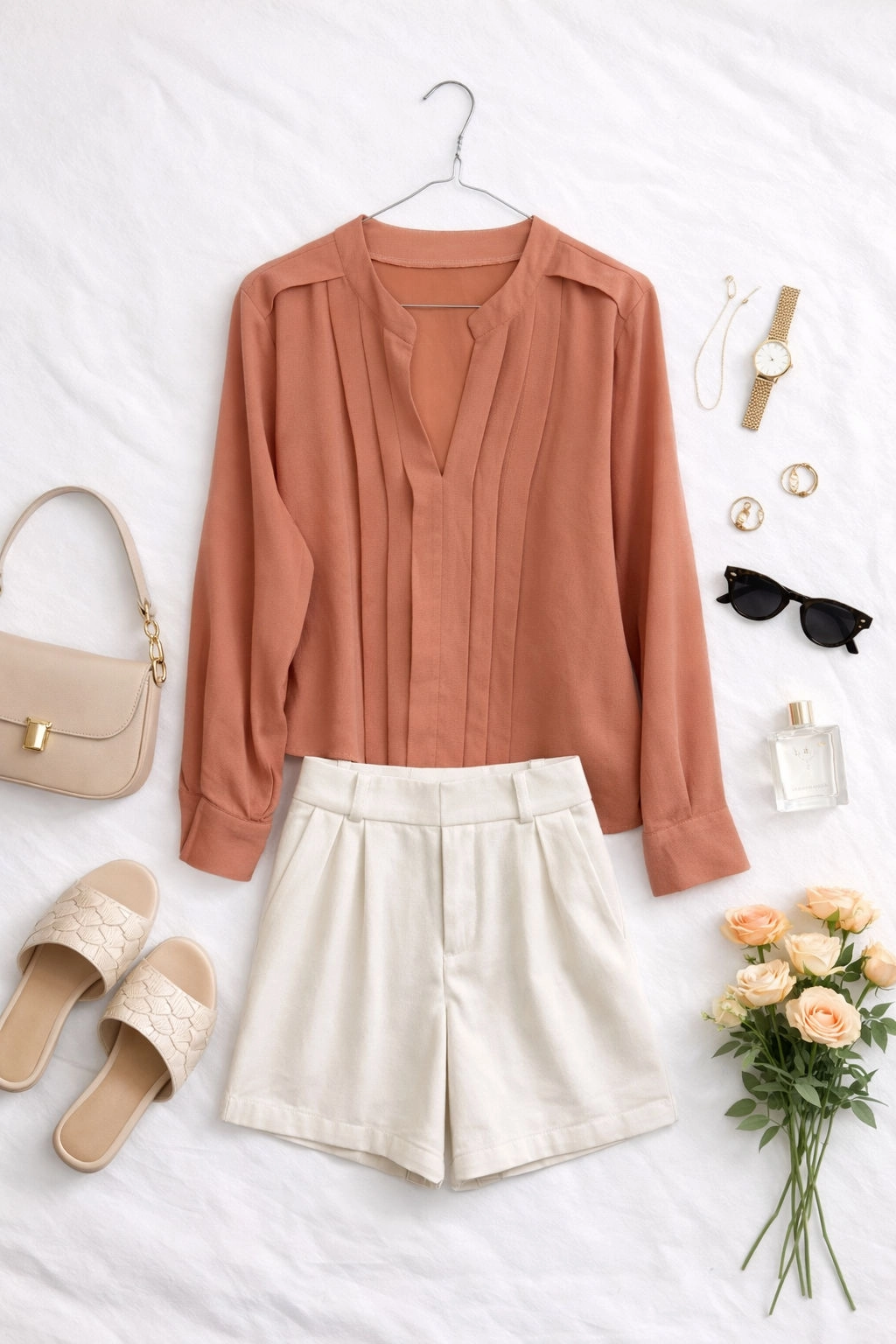 Materiał jest lekki, zwiewny i delikatnie lejący, co sprawia, że bluzka wspaniale układa się podczas ruchu. Tkanina ma subtelną, matową strukturę, która jest niezwykle przyjemna dla skóry i nadaje ubraniu szlachetnego wyrazu. Dzięki swojej delikatności bluzka nie dodaje objętości, lecz miękko rzeźbi sylwetkę, co czyni ją świetnym wyborem dla pań o figurze typu jabłko lub prostokąt. Pionowe plisy działają na korzyść figury, tworząc linie, które wizualnie wydłużają tułów i sprawiają, że cała postać wydaje się wyższa i bardziej proporcjonalna.