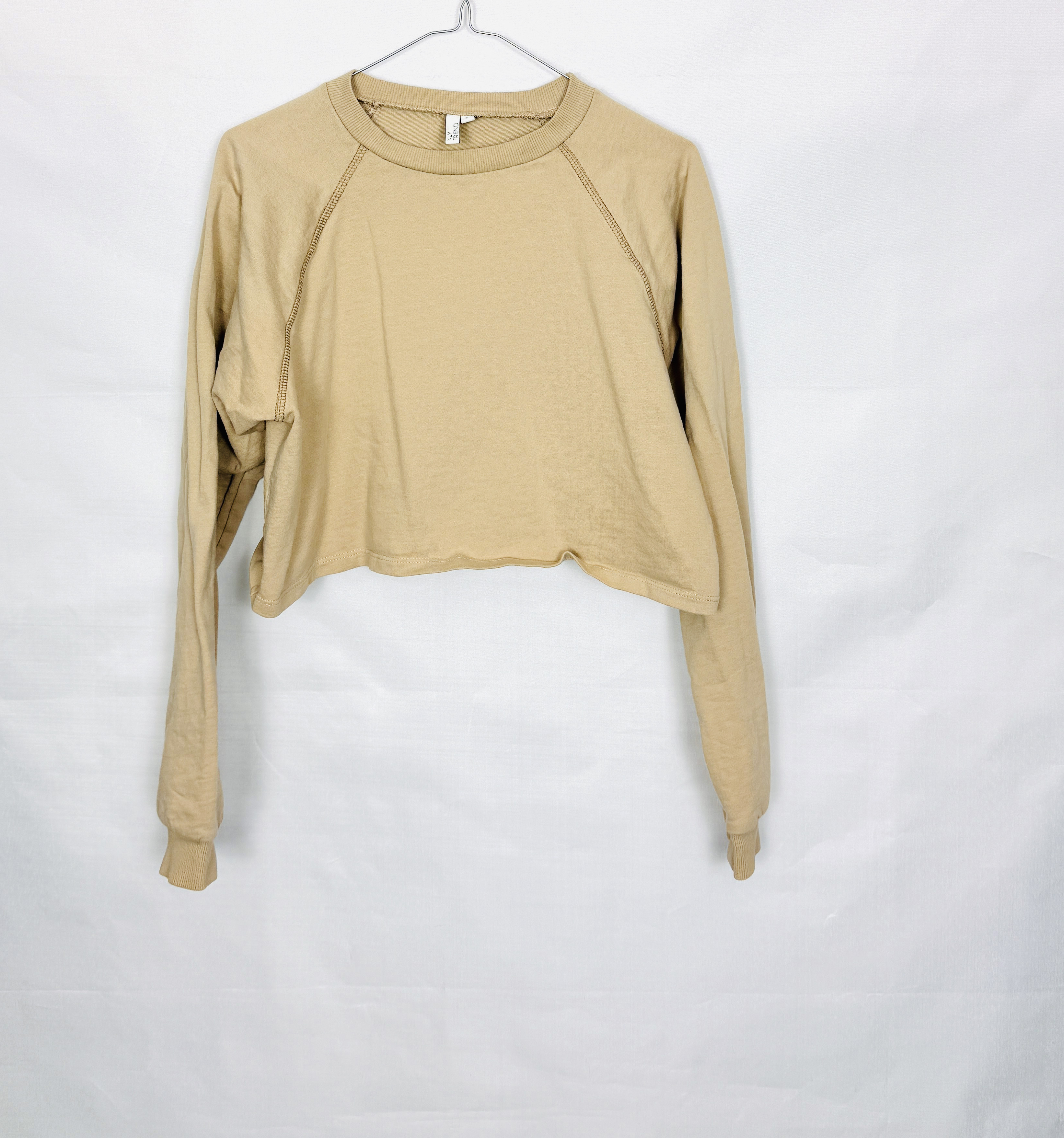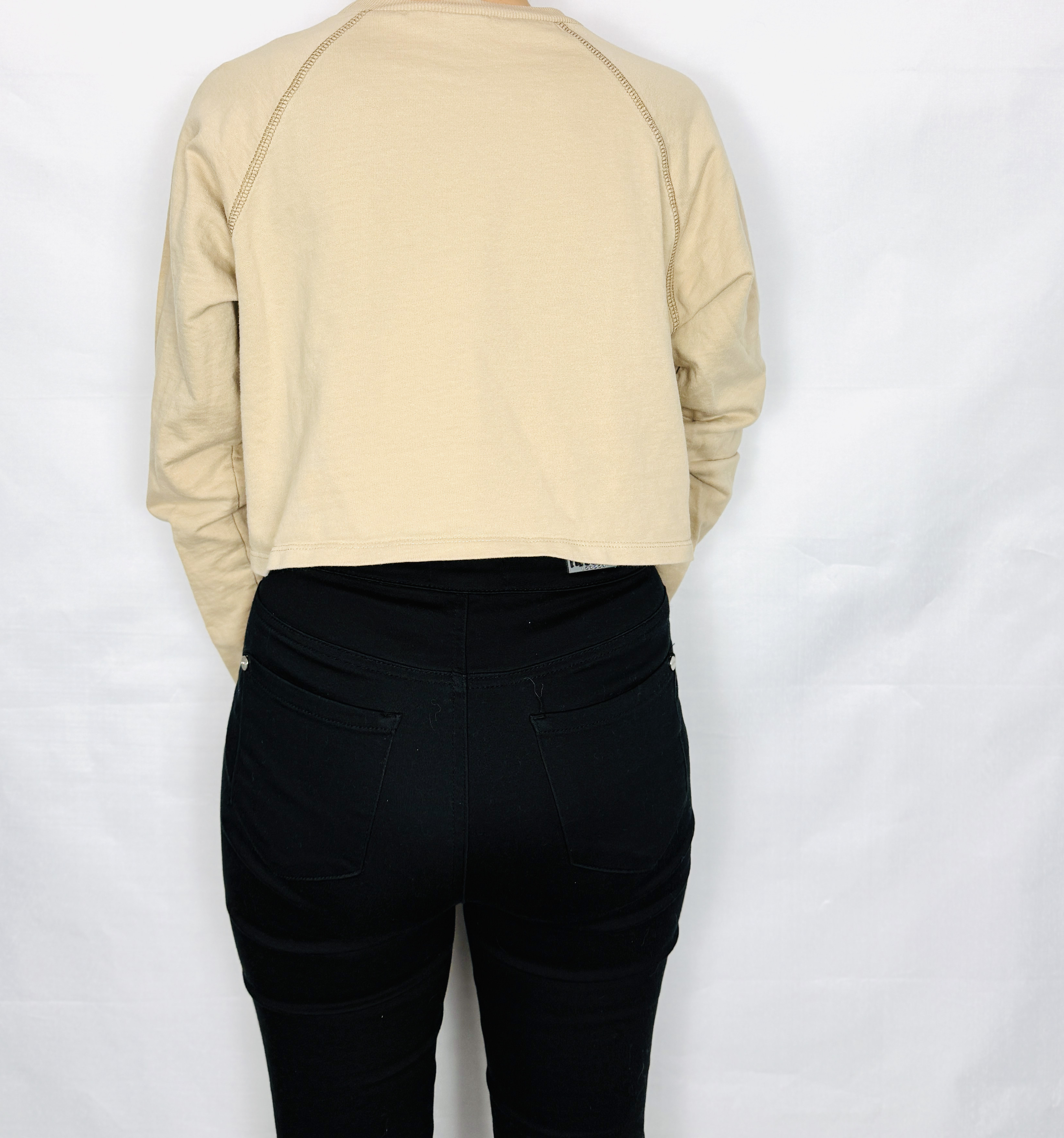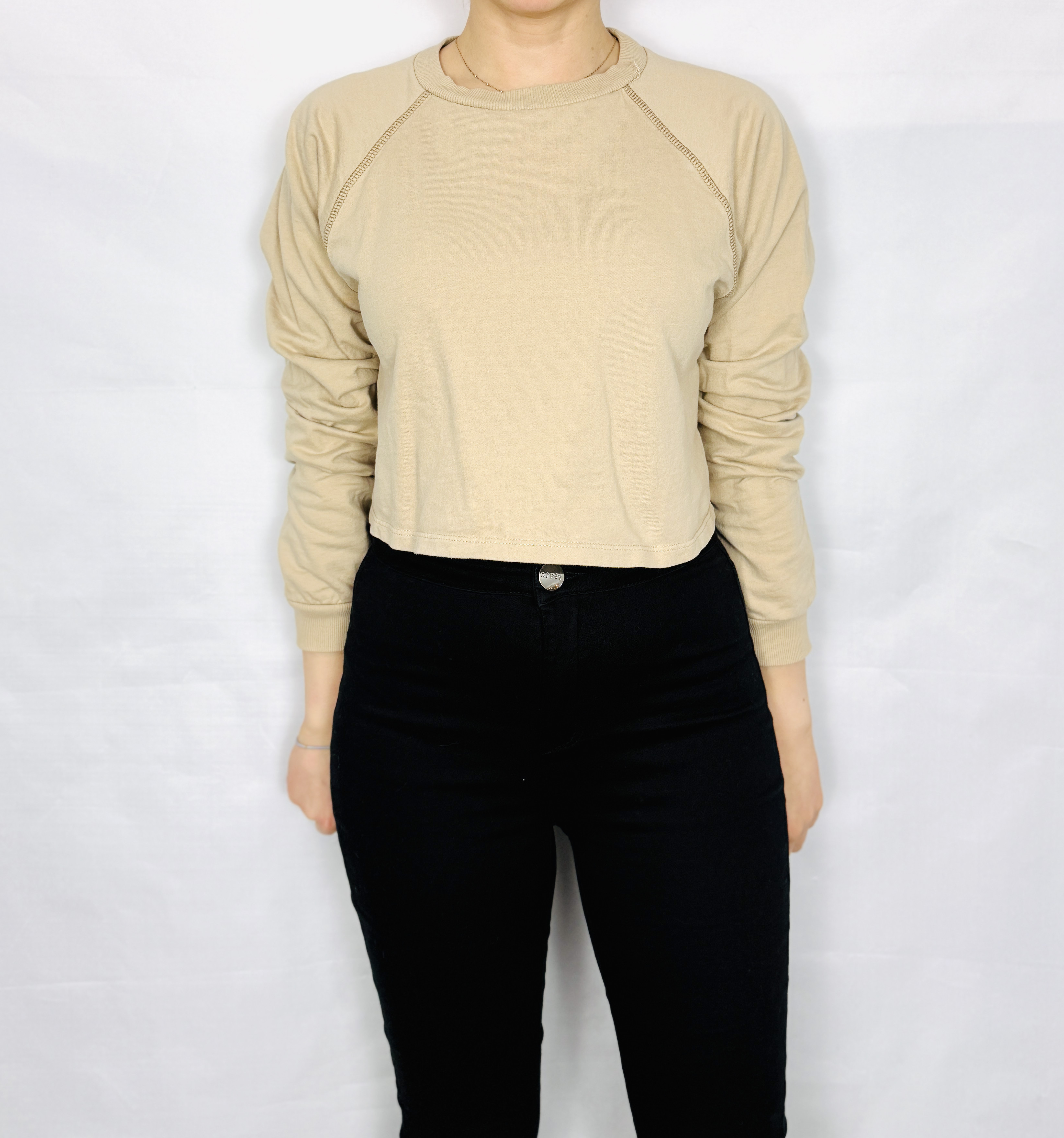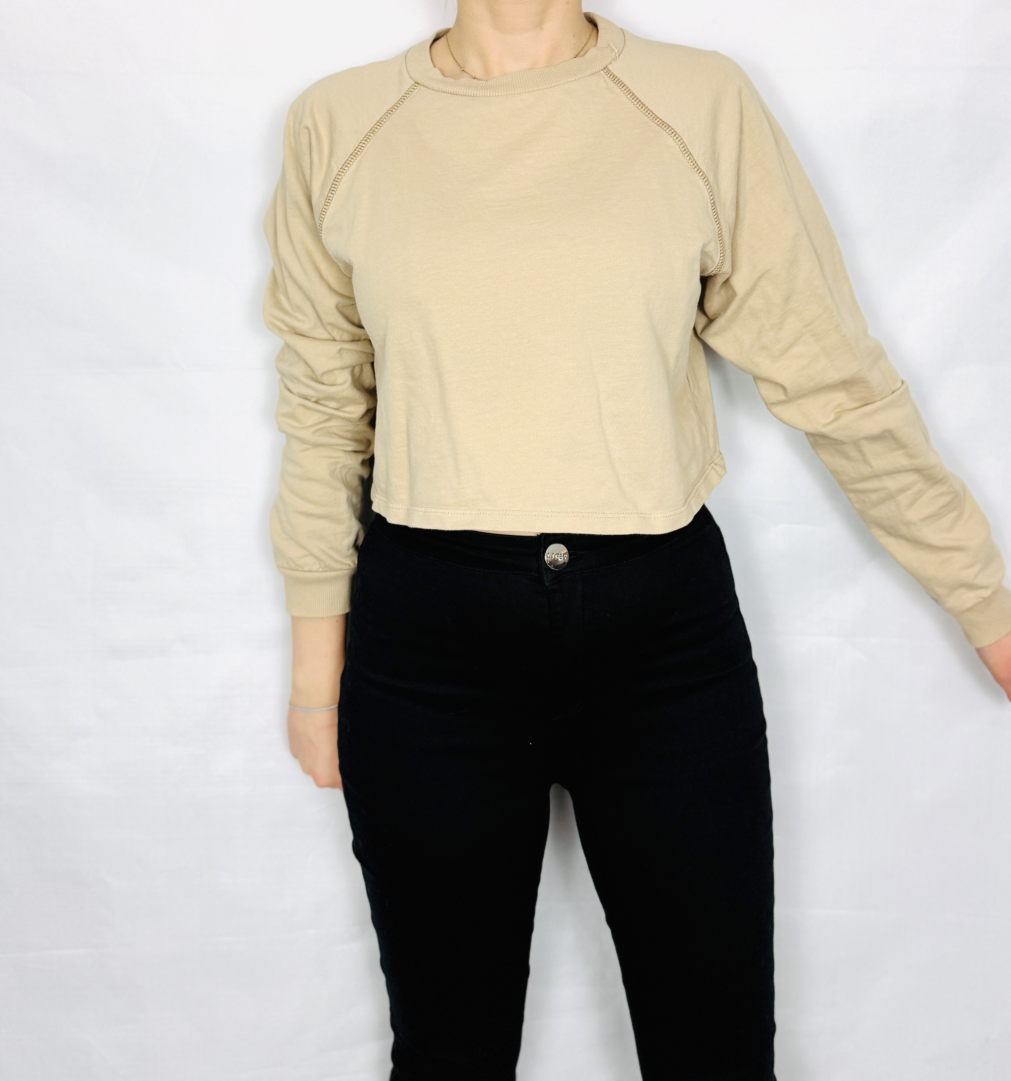 Krótsza długość bluzki sięga lekko nad linię talii, tworząc nowoczesny, cropowany efekt, który optycznie wydłuża nogi w połączeniu z wysokim stanem spodni. Dolne wykończenie jest proste, równe i starannie przeszyte, co nadaje całości schludnego finiszu. Fason ma raczej prostą, lekko pudełkową sylwetkę — niezbyt obcisły, lecz bez nadmiaru materiału — dzięki czemu bluza zachowuje świeży, uporządkowany profil.