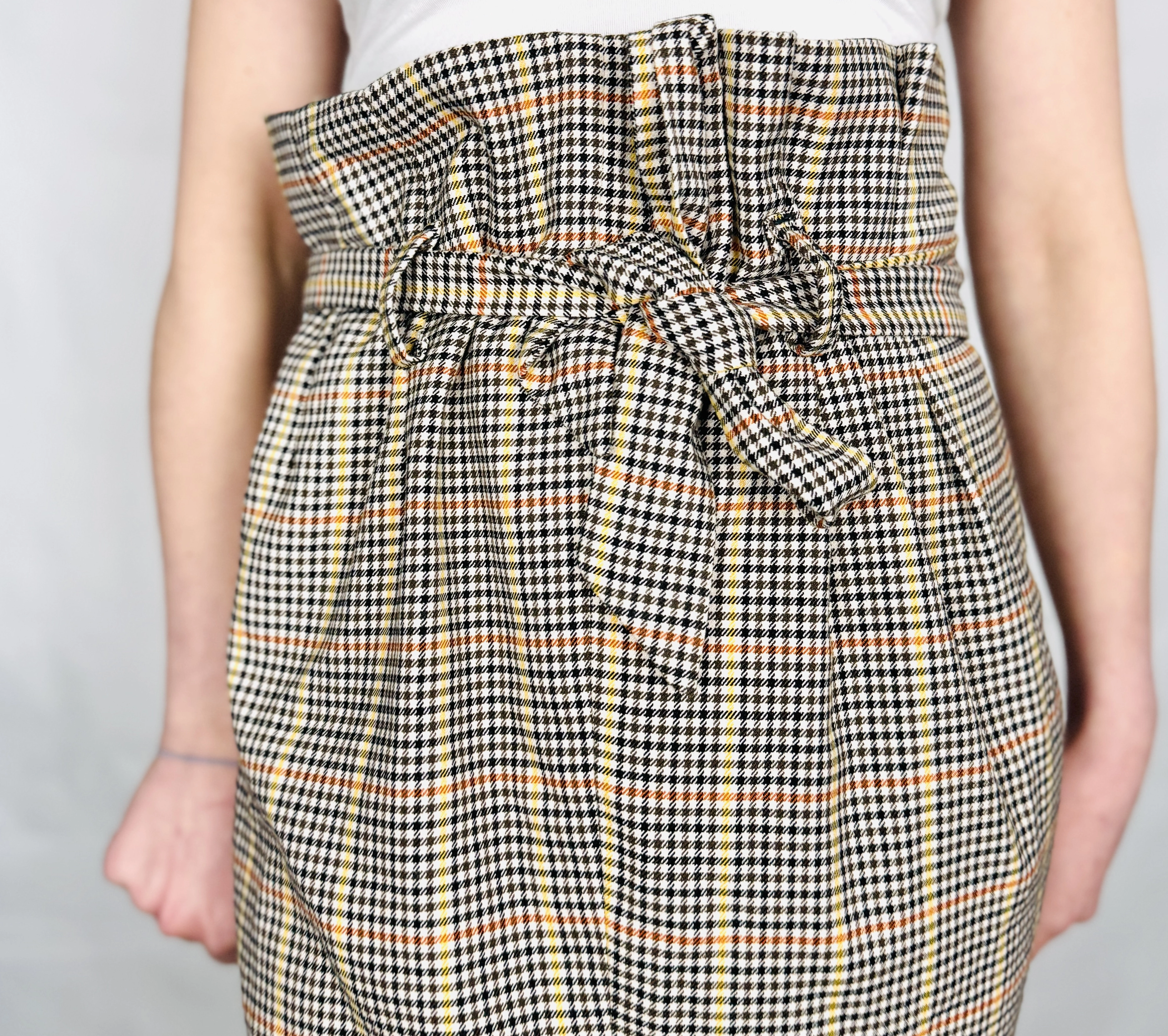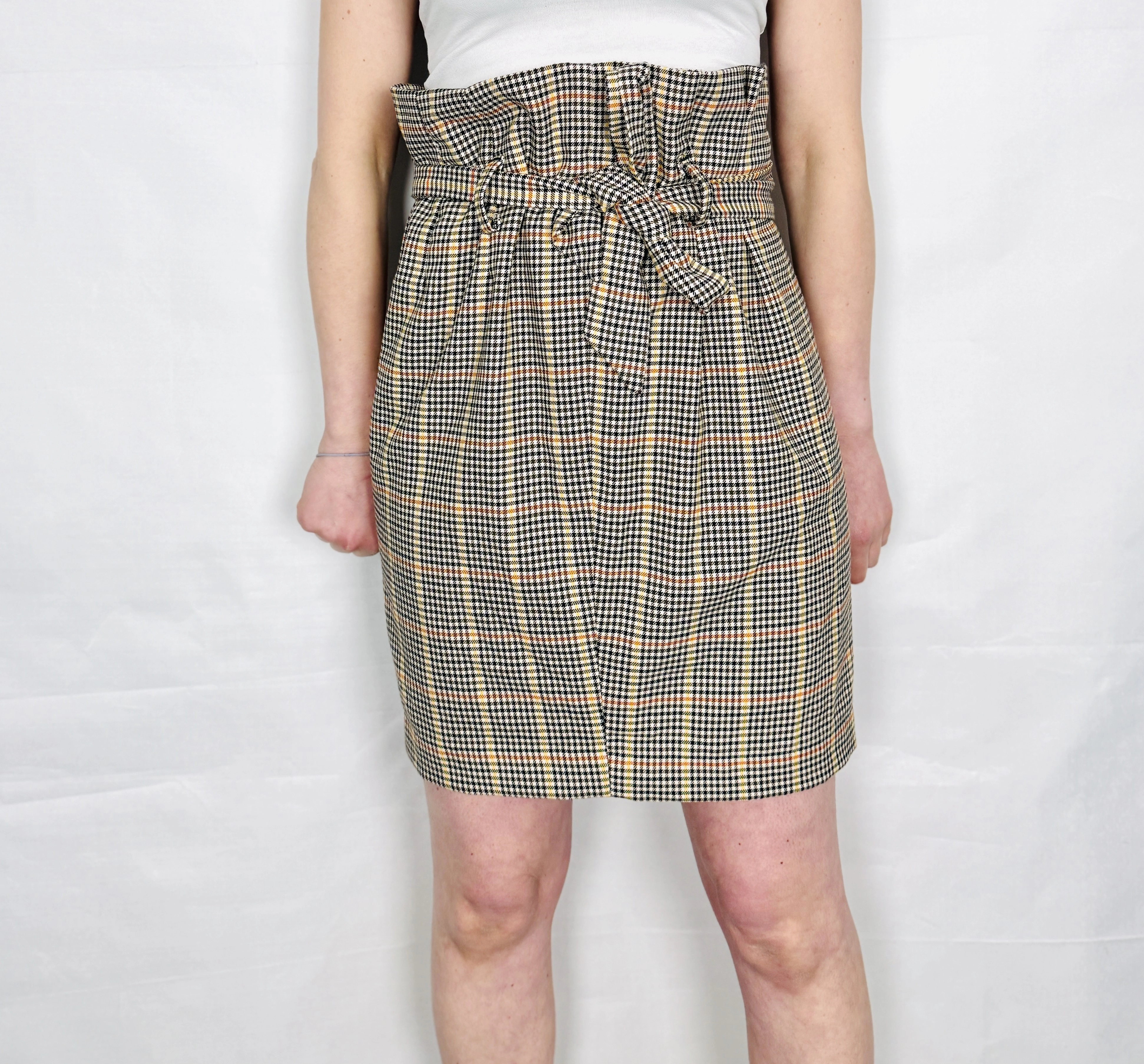 Krój jest prosty, ale przemyślany: talia została świadomie podniesiona i subtelnie zmarszczona, co tworzy miękkie, dekoracyjne fałdowanie w górnej partii, a jednocześnie wyraźnie zaznacza linię bioder. Forma spódnicy jest lekko odcięta w talii i prowadzi ku klasycznemu, prostemu wykończeniu o długości nad kolano, co daje efekt kobiecej sylwetki bez nadmiernego opinania. Konstrukcja jest schludna i uporządkowana, z akcentem na geometryczną regularność kratki, która porządkuje linię i nadaje całości klasycznego rytmu.
