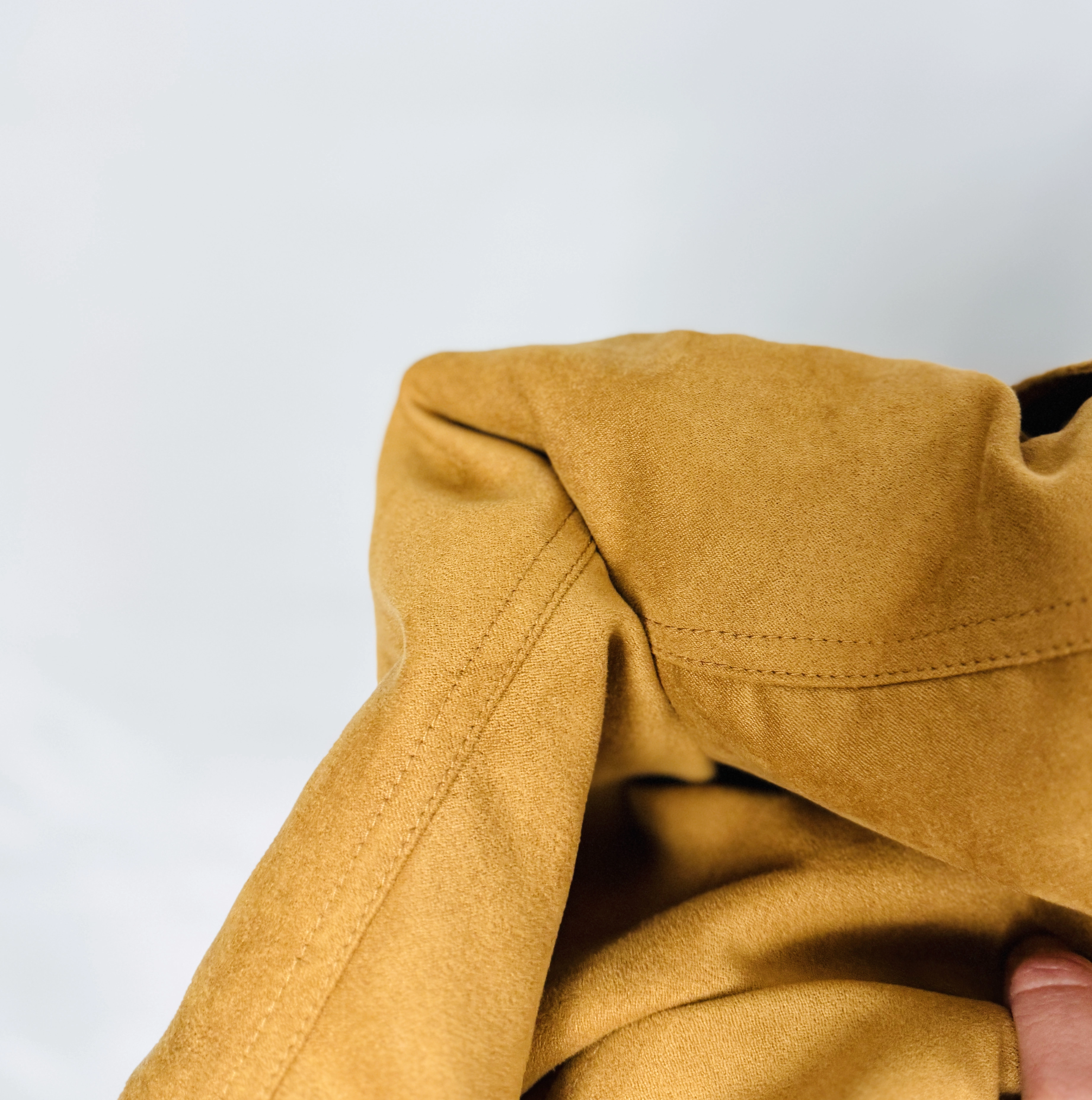 Materiał sprawia wrażenie miękkiego, matowego i przyjemnie otulającego. Powierzchnia przypomina zamsz, co nadaje całości eleganckiego, nieco bardziej wyrafinowanego wyglądu. Tkanina dobrze trzyma formę, a jednocześnie układa się naturalnie, podkreślając linię fasonu.