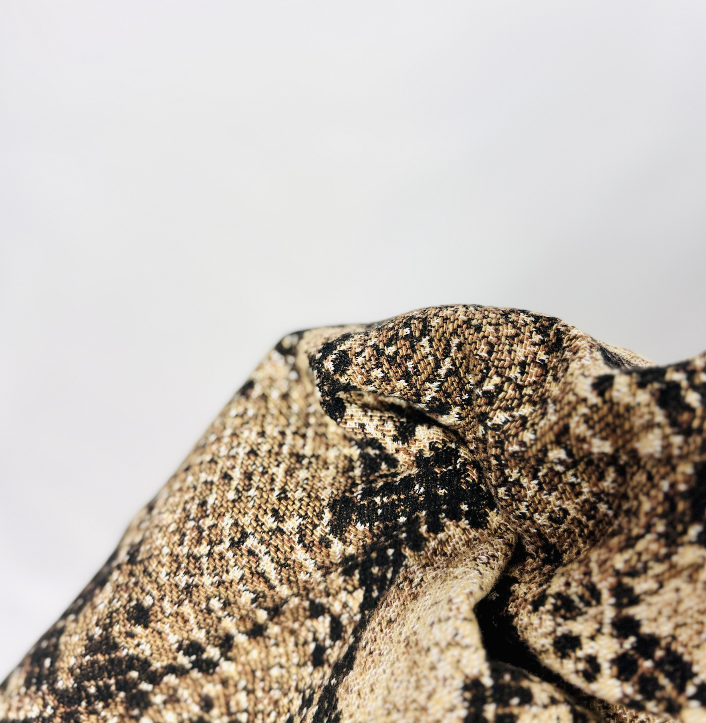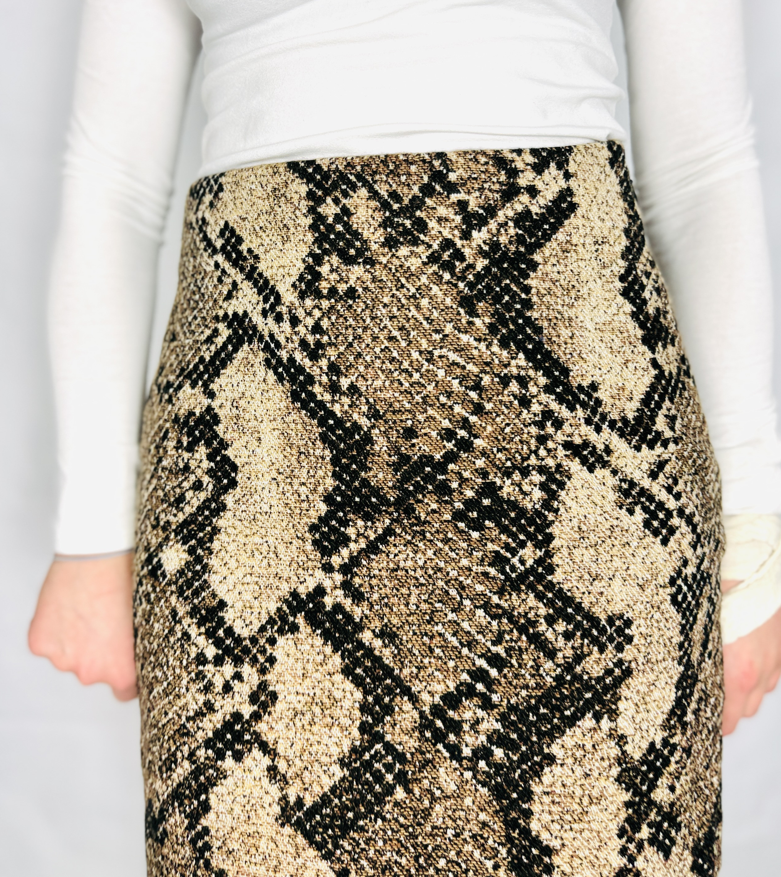 Ta spódnica emanuje zmysłową, nieco drapieżną elegancją — ciepłe beżowe tony splecione z kontrastującą czernią tworzą ozdobny, wężowy motyw, który przyciąga uwagę, nie będąc krzykliwym. Ma w sobie nutę nowoczesnej klasyki: dekoracyjny wzór staje się głównym akcentem, a jednocześnie fason pozostaje uporządkowany i kobiecy. To model dla osoby, która lubi, gdy wzór buduje charakter stylizacji, a sama forma pozostaje ponadczasowa i noszalna.