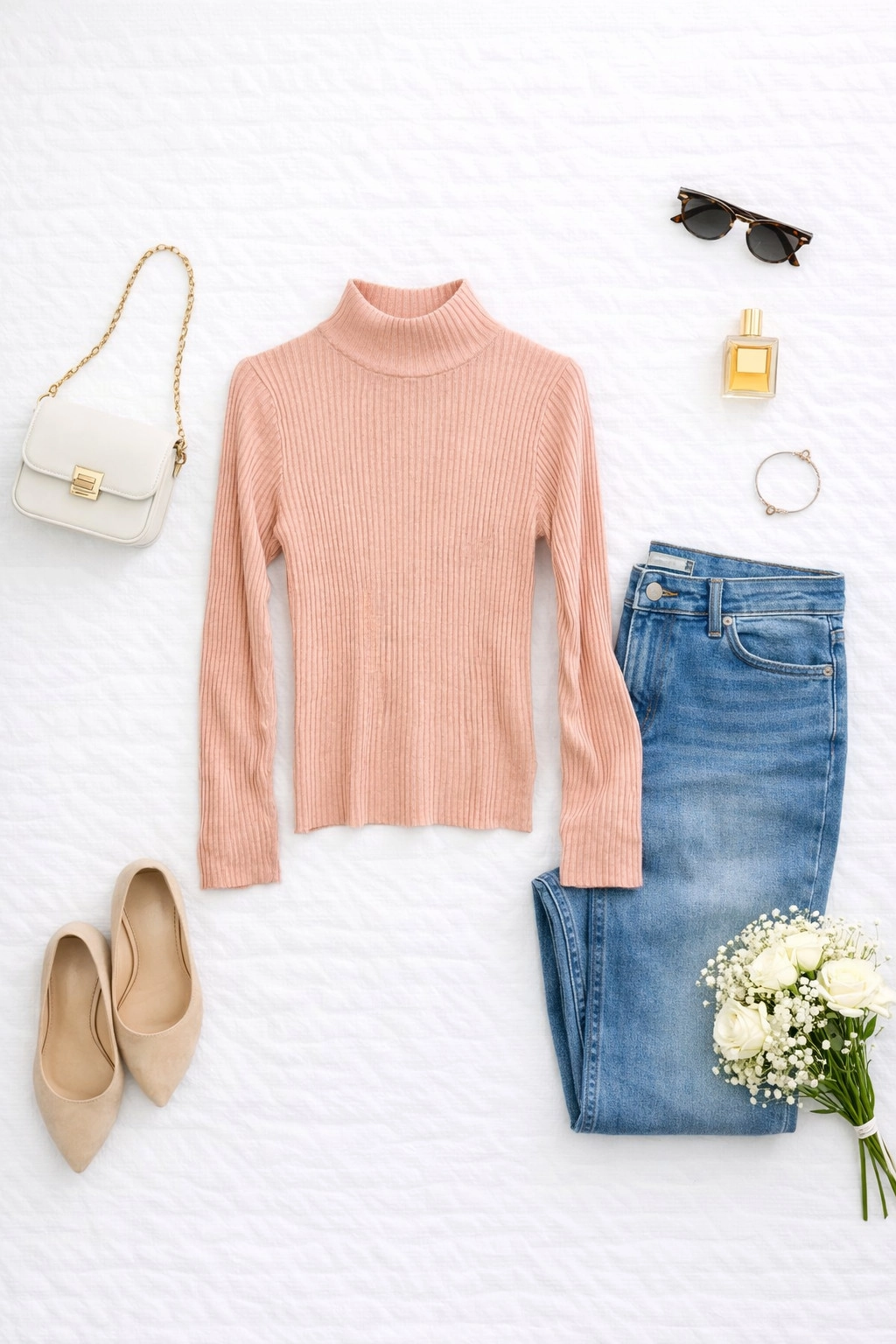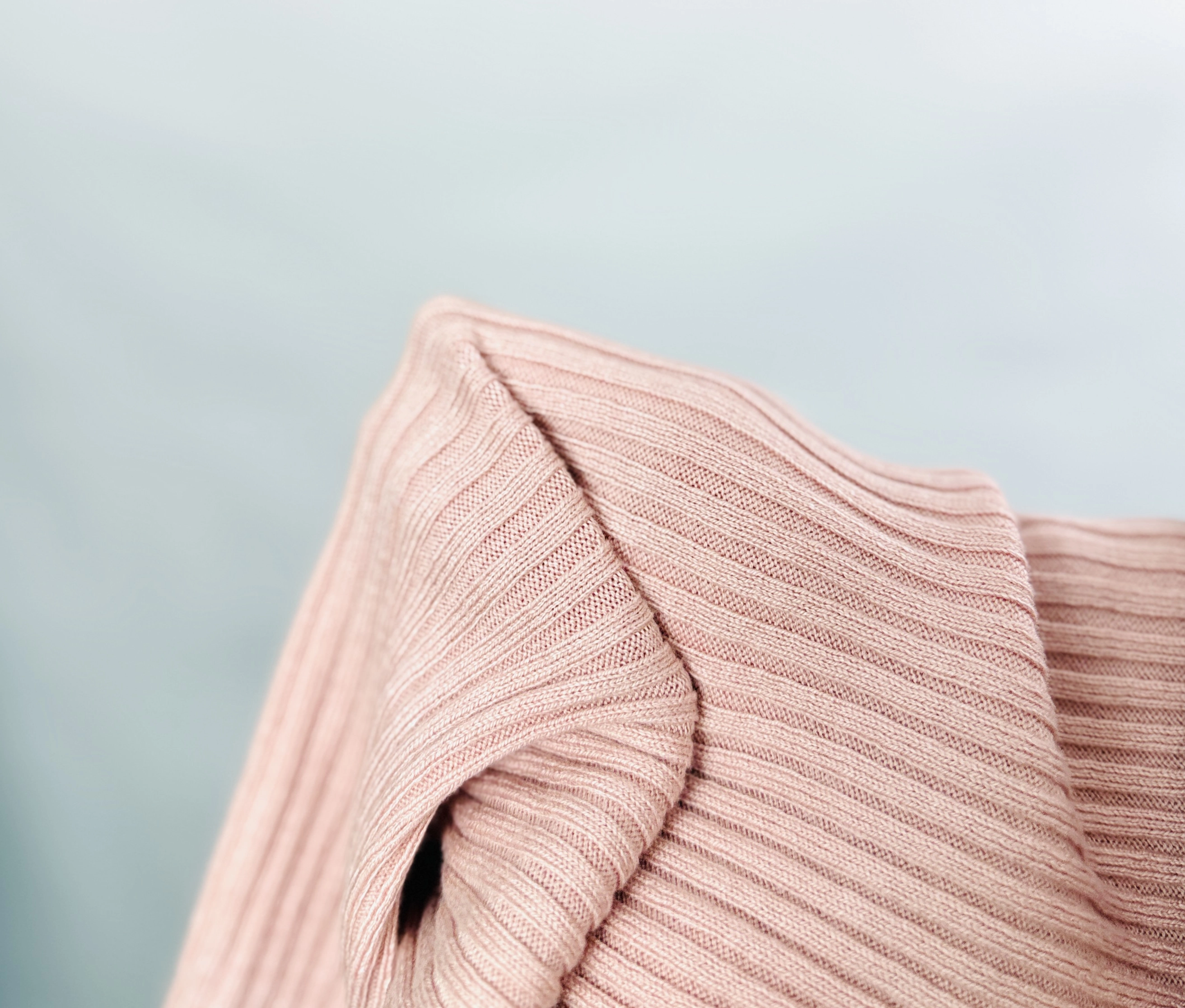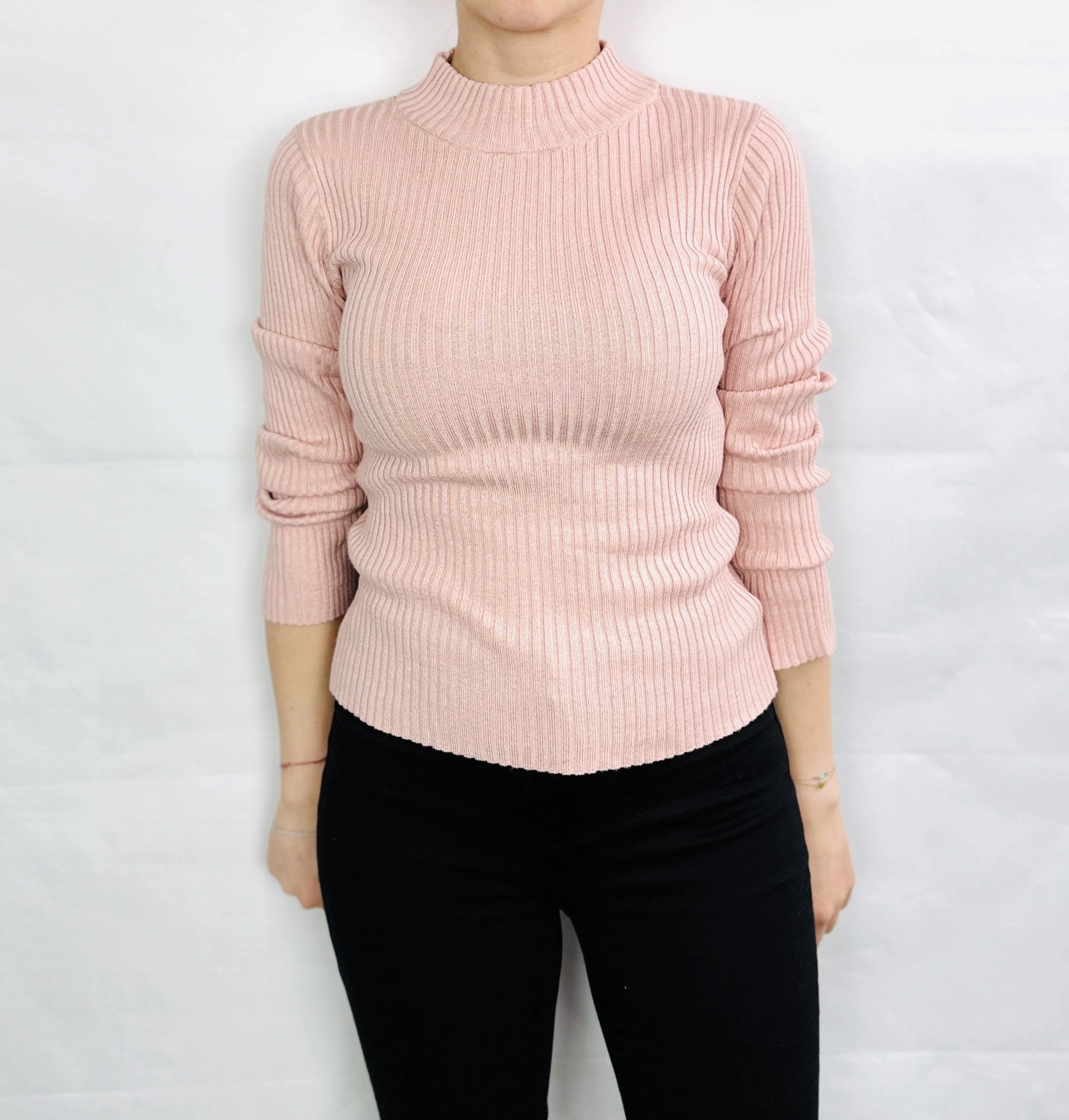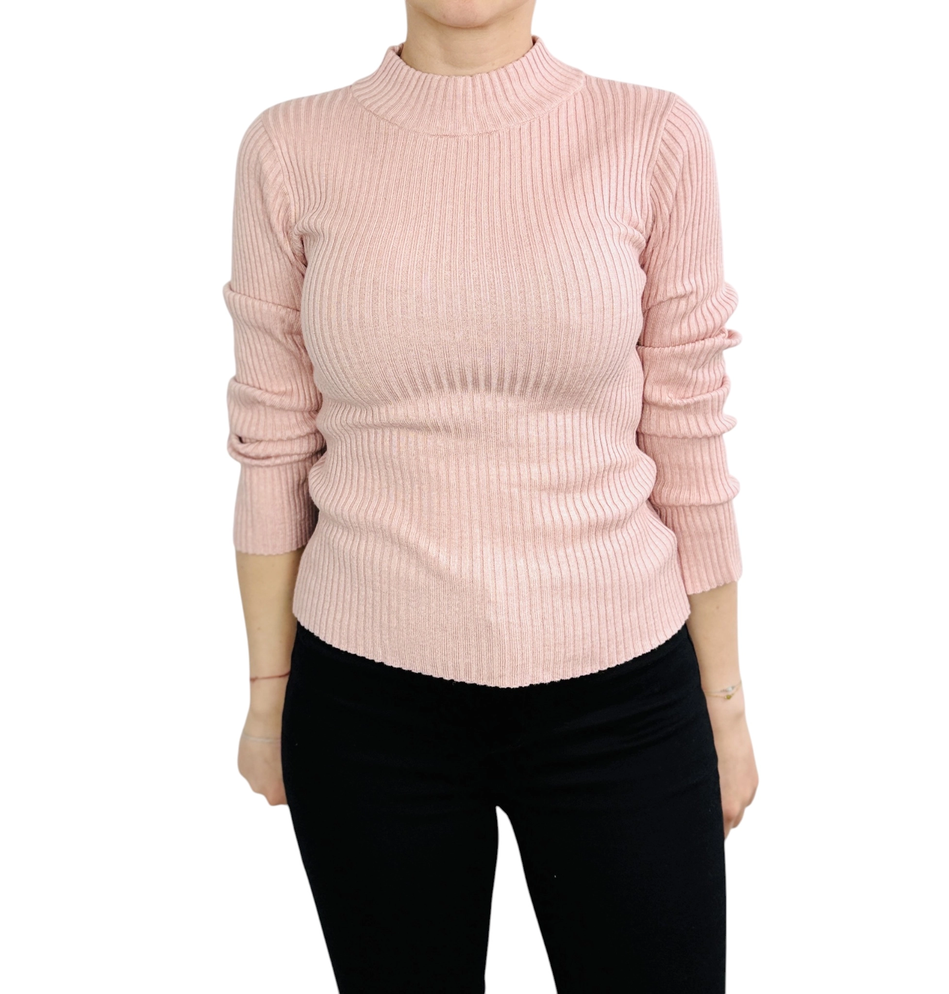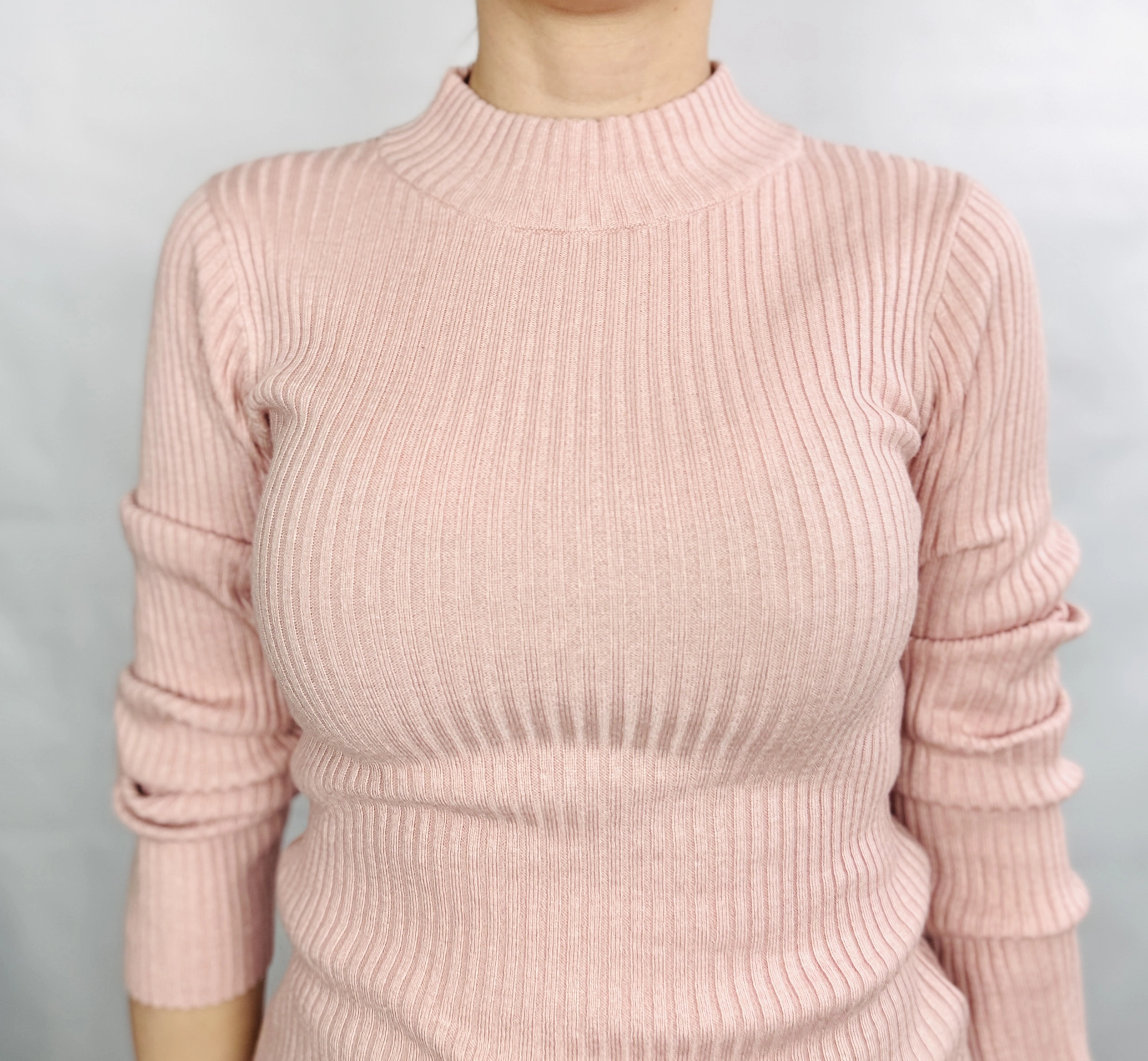Fason sweterka jest dopasowany, co pozwala podkreślić sylwetkę, zwłaszcza talię i delikatne kształty, nadając całości lekkości i finezji. Prążkowana struktura materiału dodaje mu wyrazistości i sprawia, że sweterek zyskuje na głębi wizualnej, a jednocześnie pozostaje niezwykle miękki i przyjemny w dotyku. Wysoka, lekko przylegająca stójka subtelnie otula szyję, dodając stylizacji elegancji i klasy, a jednocześnie chroni przed chłodem. Rękawy o długości do nadgarstków są lekko marszczone, co wprowadza ciekawy, nieco swobodny akcent i podkreśla kobiecy charakter ubrania.