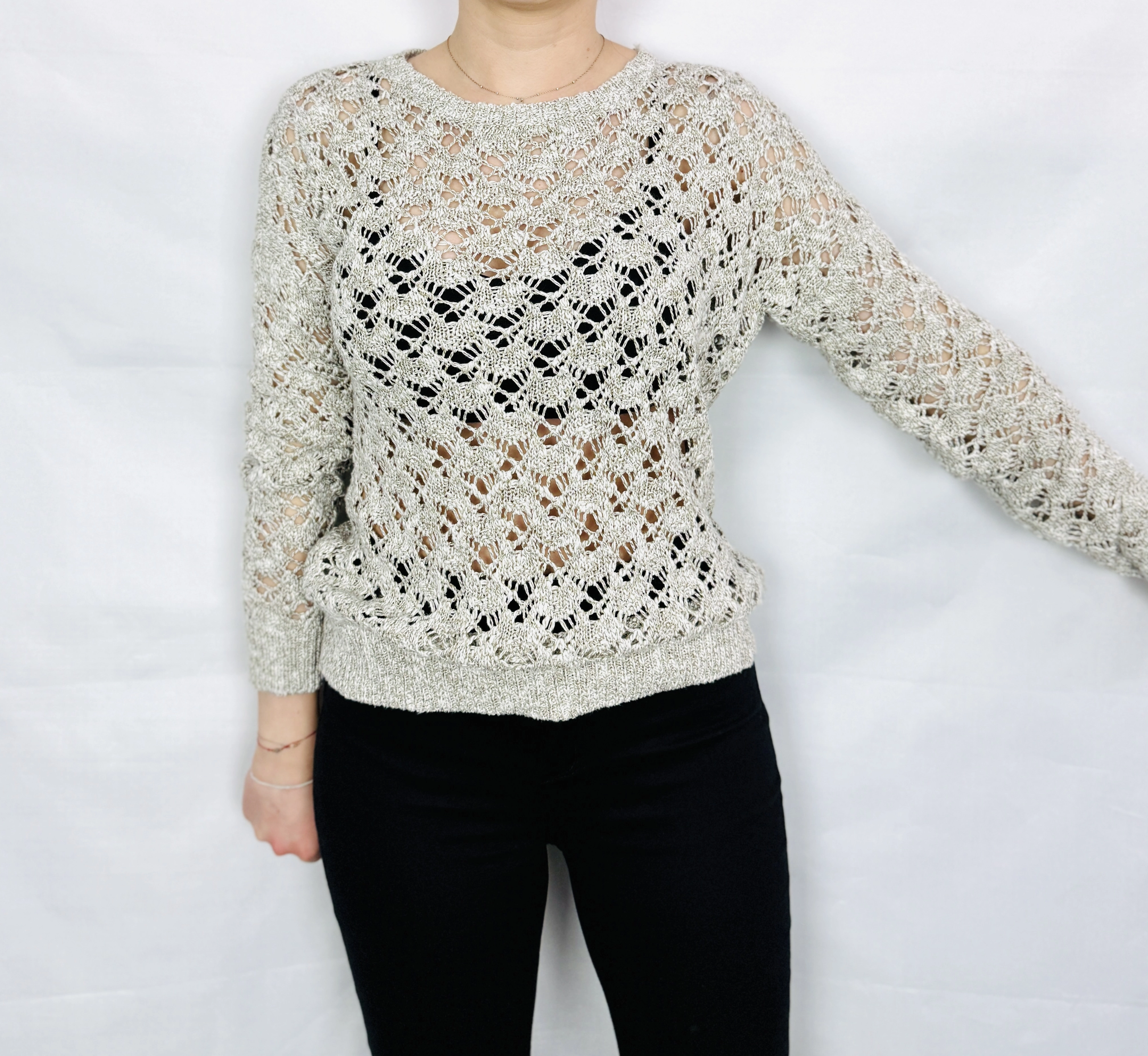Największym atutem jest ażurowy wzór, który tworzy efekt lekkiej przejrzystości i pięknie eksponuje warstwę znajdującą się pod spodem. Materiał sprawia wrażenie miękkiego, przyjemnego i lekko sprężystego, dzięki czemu sweterek komfortowo dopasowuje się do ciała. Struktura dzianiny dodaje głębi i sprawia, że model wygląda wyjątkowo, mimo swojej stonowanej kolorystyki.