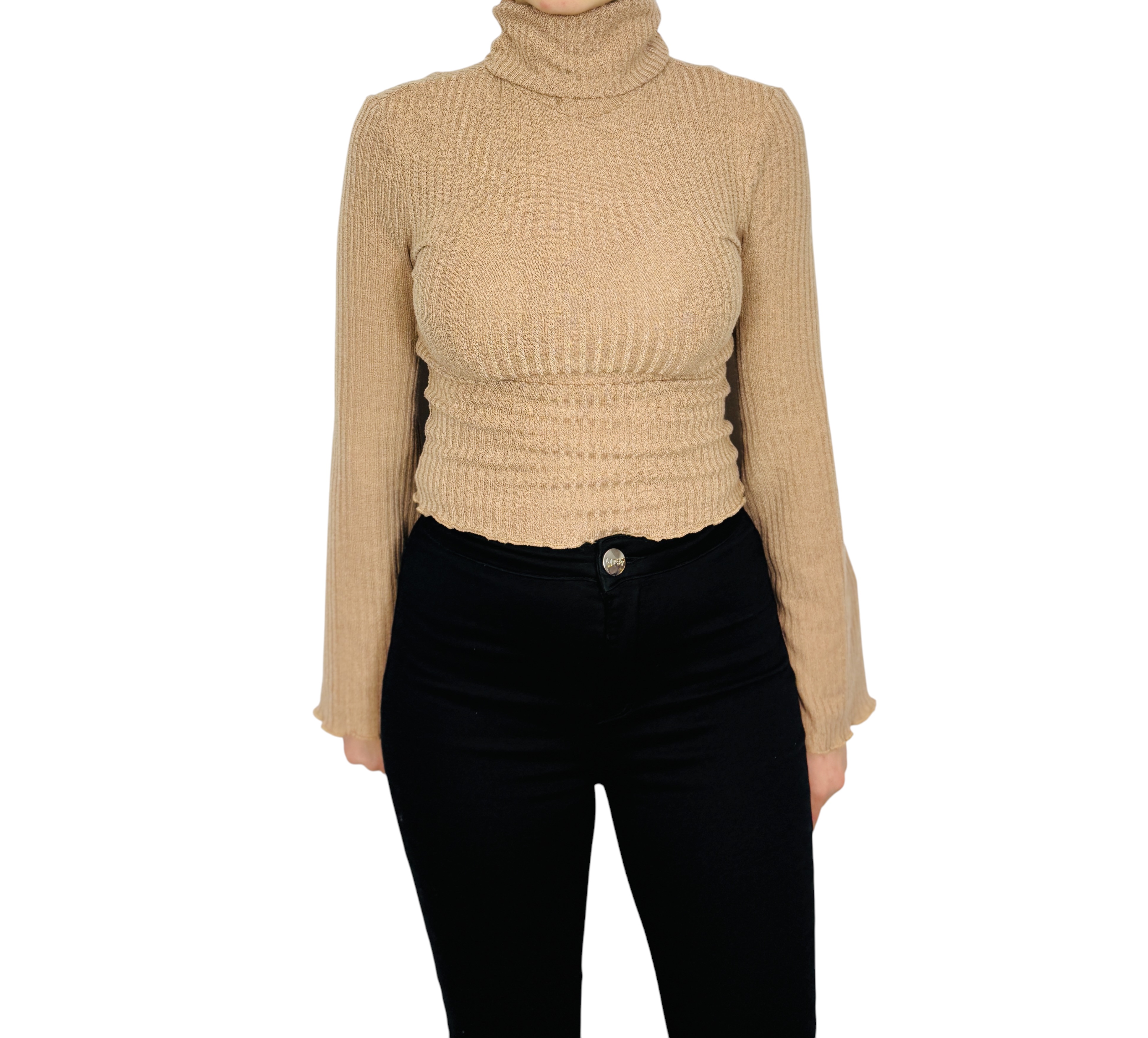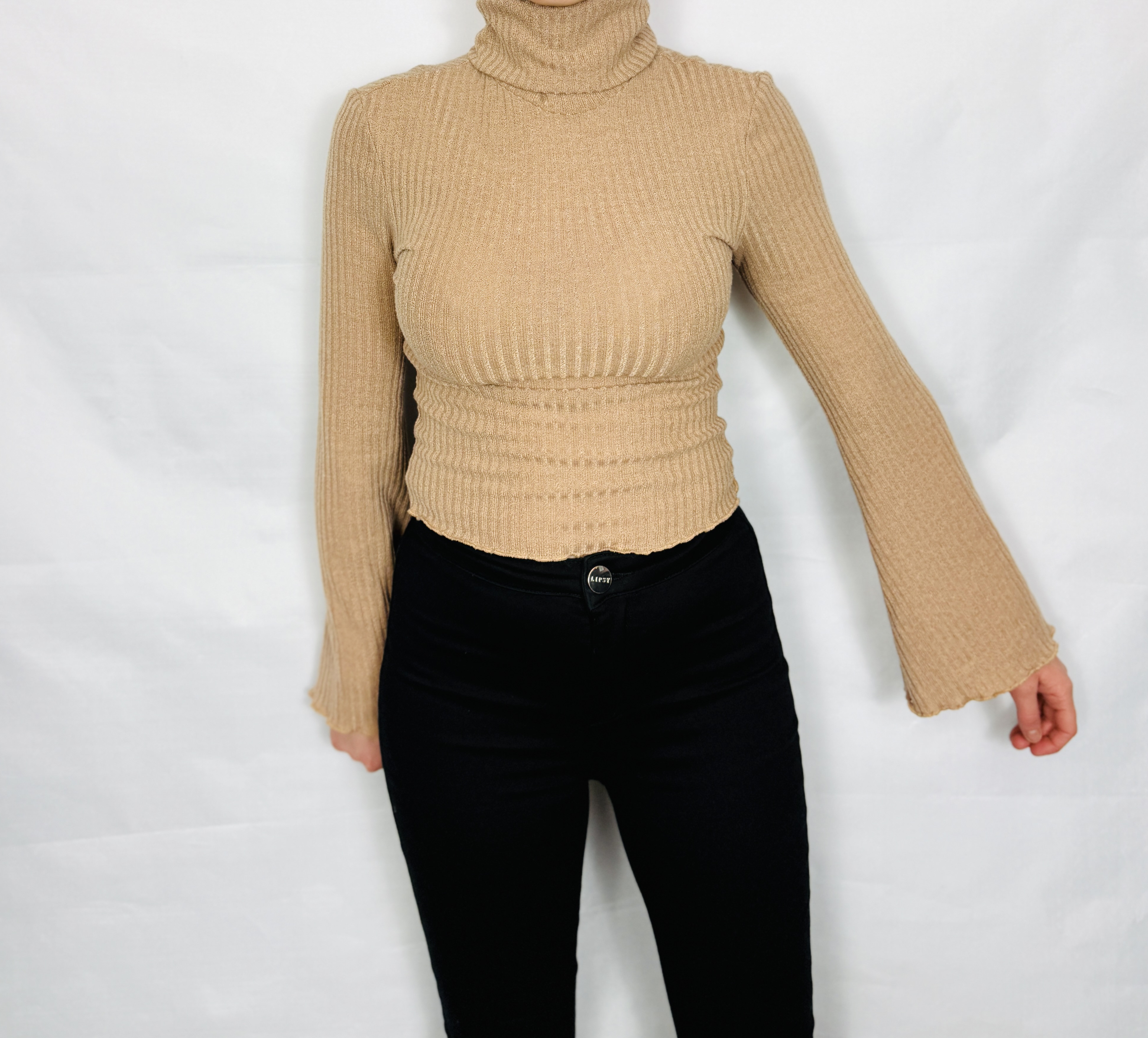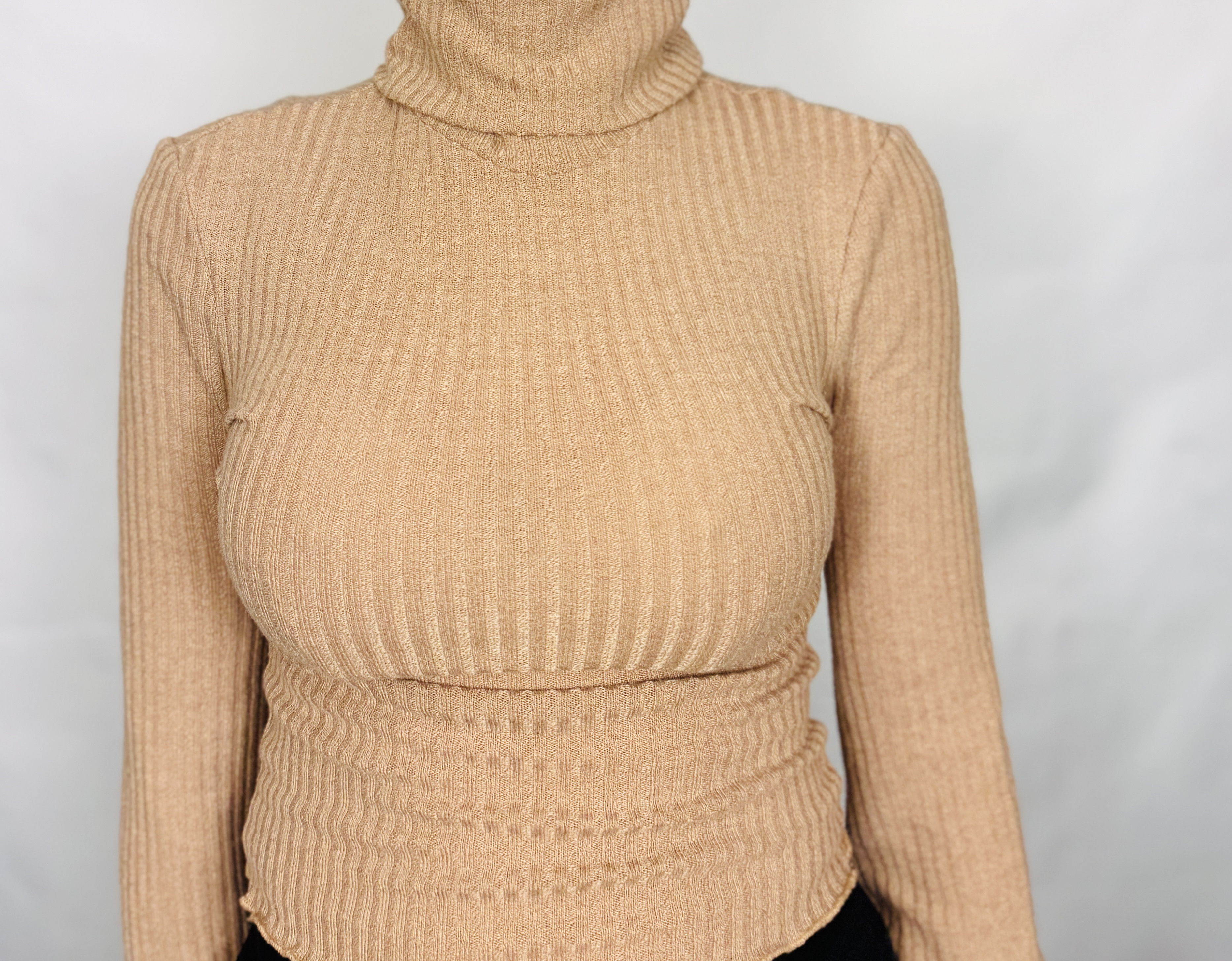 Krój jest dopasowany w górnych partiach i mocniej zarysowany w talii, co podkreśla naturalne linie sylwetki bez nadmiernego opinania. Wysoki, obszerny golf delikatnie oplata szyję, wprowadzając akcent otulenia i podkreślając linię obojczyków, natomiast długość kończy się tuż przy talii, tworząc proporcję sprzyjającą zestawieniom zarówno z wysokim stanem spodni, jak i z dopasowanymi spódnicami. Rękawy są długie i wyraźnie rozszerzane ku końcom; ich lekko rozkloszowana linia dodaje sylwetce subtelnego ruchu i romantycznego wdzięku, a delikatne wykończenia brzegów nadają całemu projektowi kobiecego, miękkiego wykończenia.