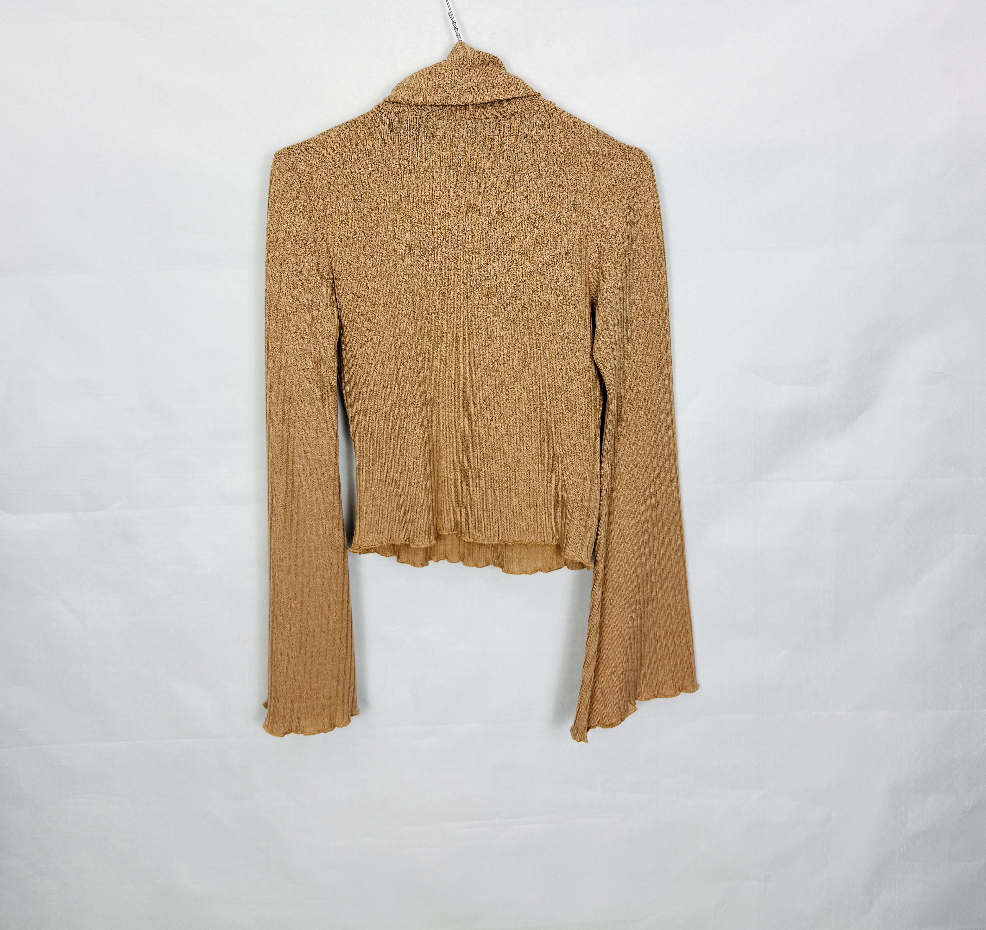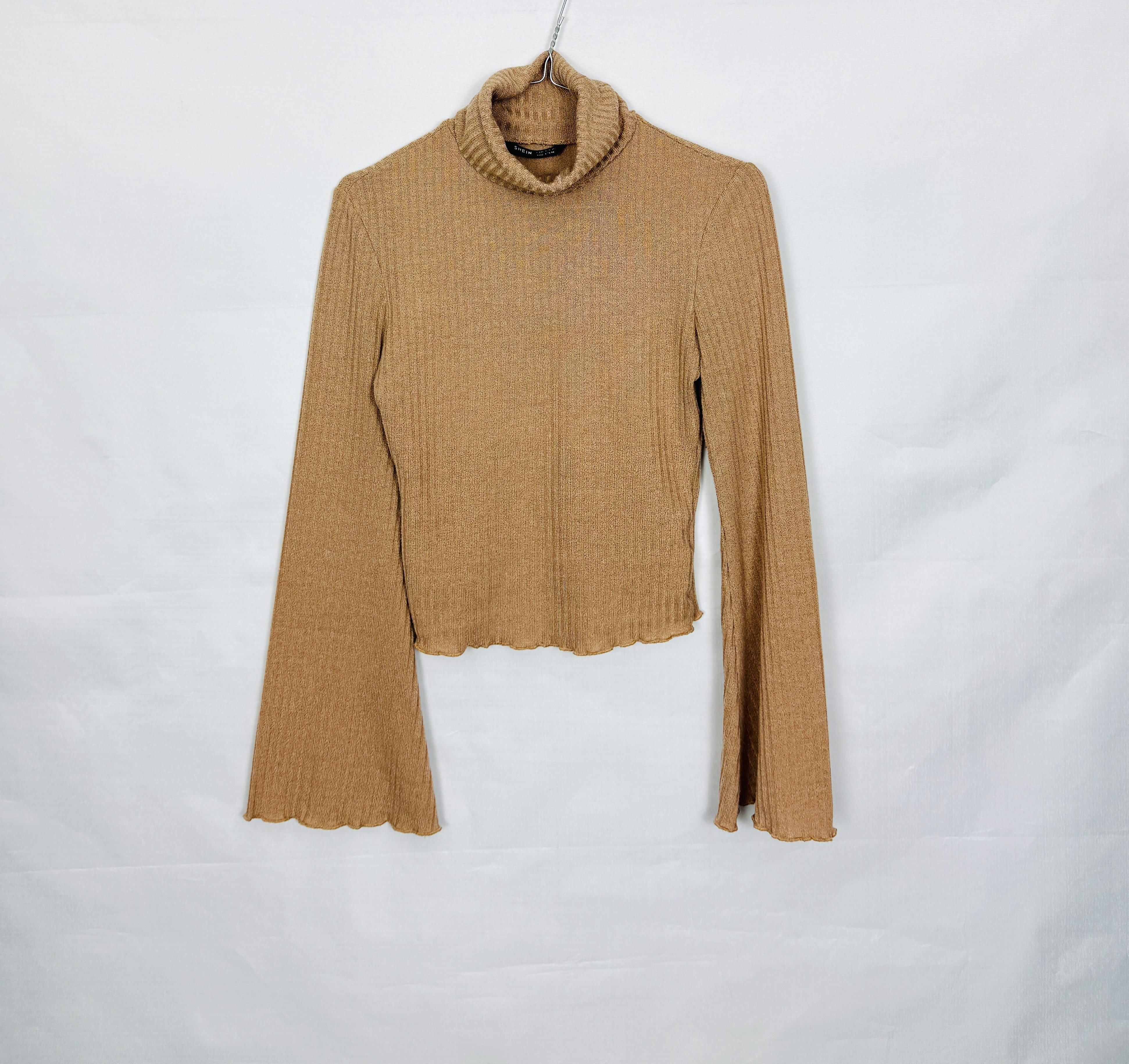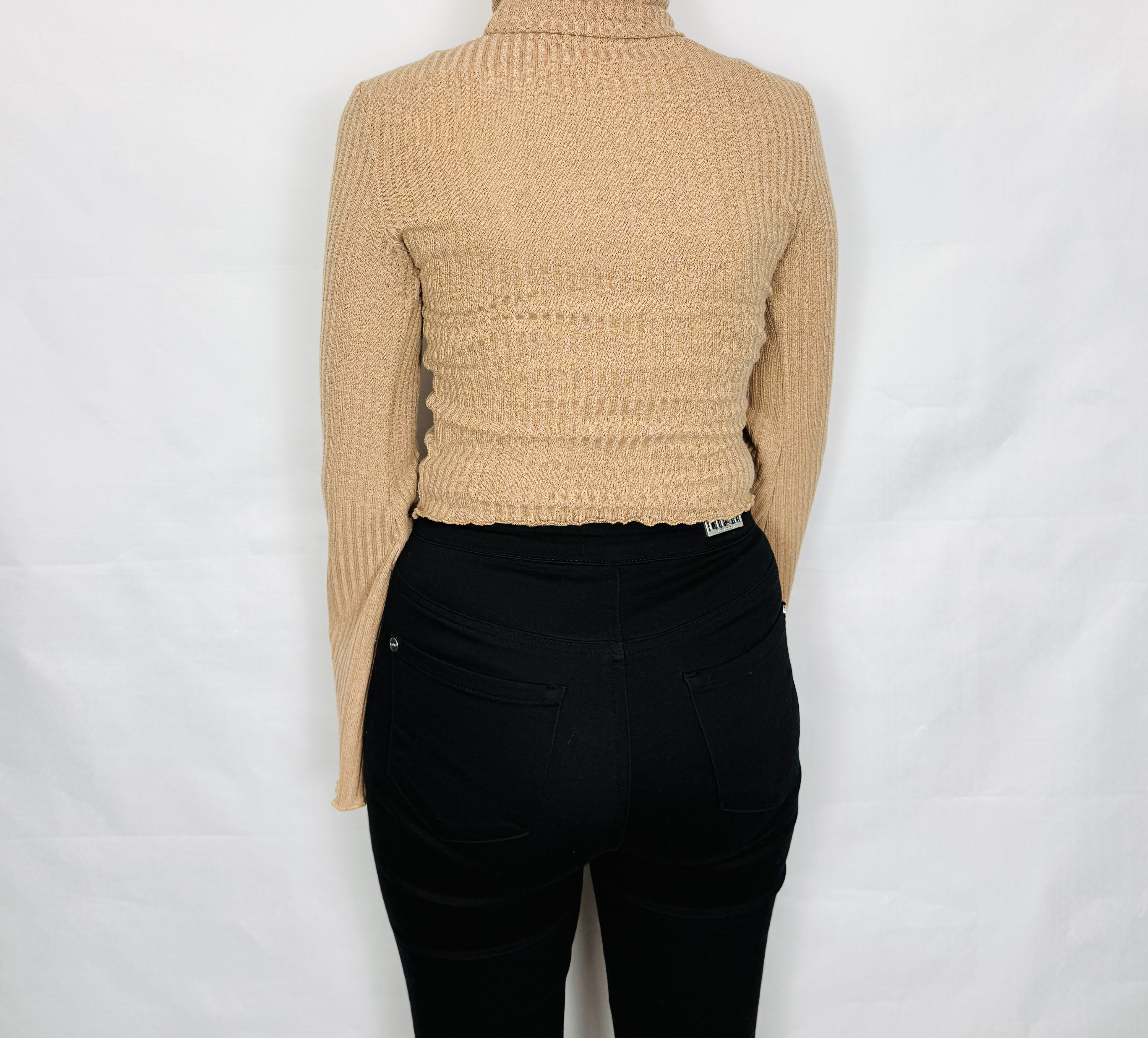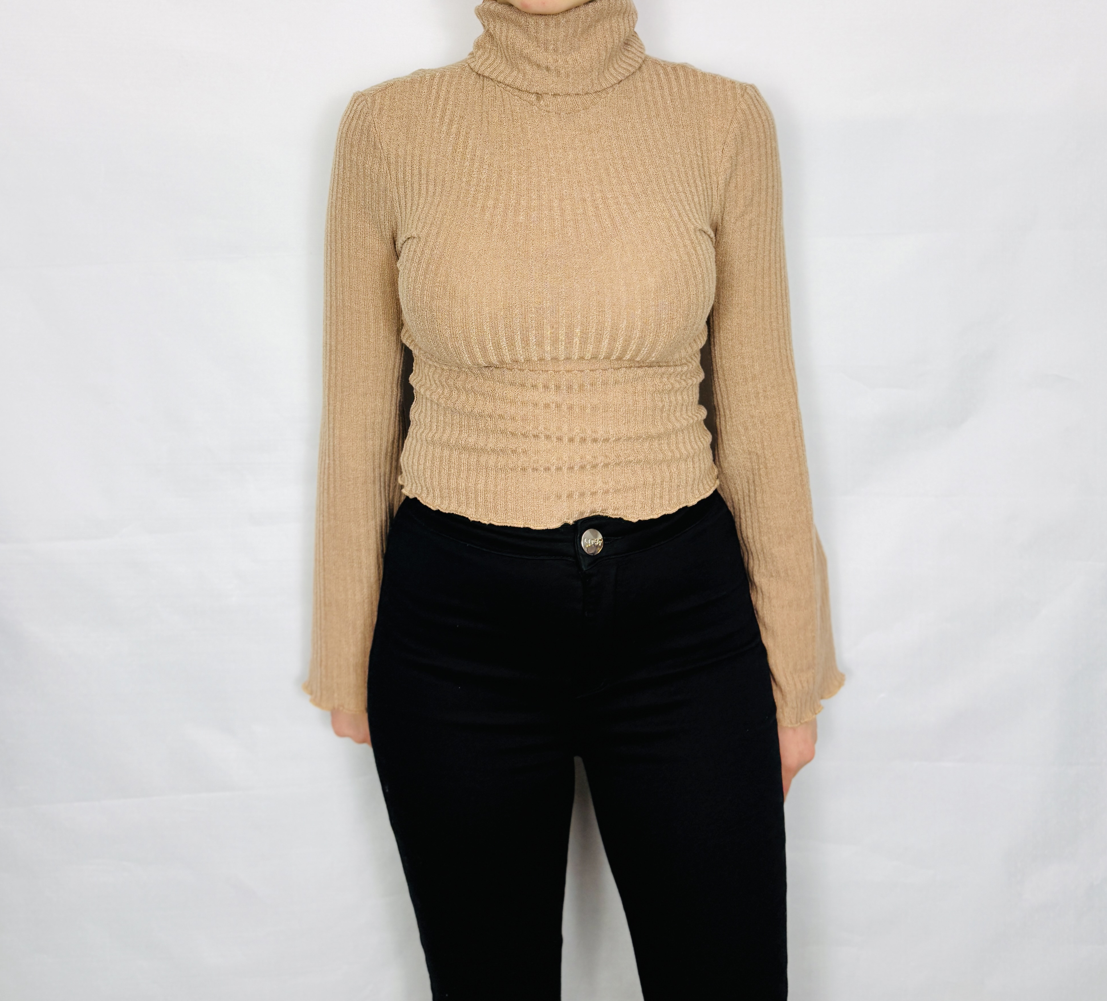 Krój jest dopasowany w górnych partiach i mocniej zarysowany w talii, co podkreśla naturalne linie sylwetki bez nadmiernego opinania. Wysoki, obszerny golf delikatnie oplata szyję, wprowadzając akcent otulenia i podkreślając linię obojczyków, natomiast długość kończy się tuż przy talii, tworząc proporcję sprzyjającą zestawieniom zarówno z wysokim stanem spodni, jak i z dopasowanymi spódnicami. Rękawy są długie i wyraźnie rozszerzane ku końcom; ich lekko rozkloszowana linia dodaje sylwetce subtelnego ruchu i romantycznego wdzięku, a delikatne wykończenia brzegów nadają całemu projektowi kobiecego, miękkiego wykończenia.