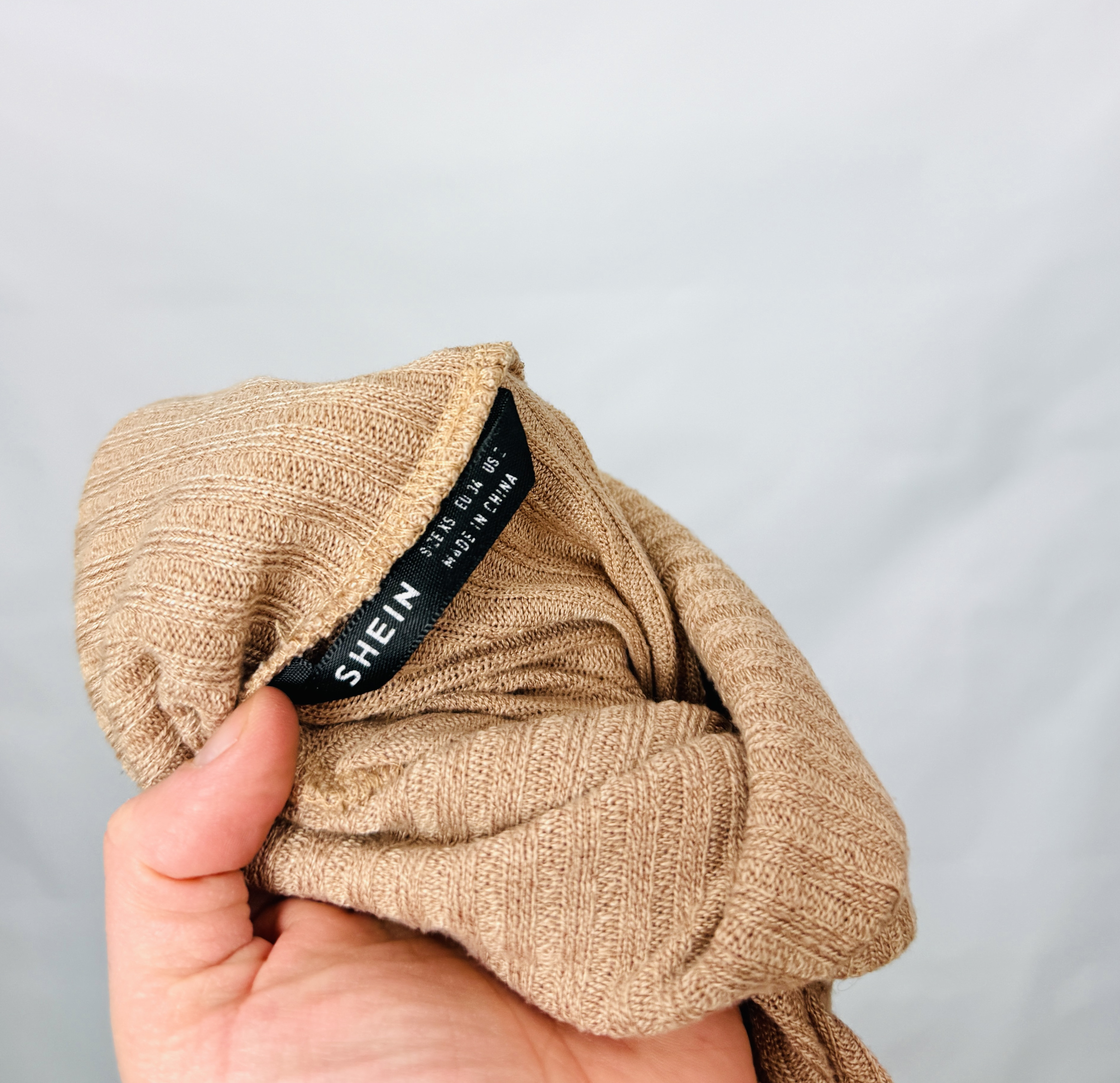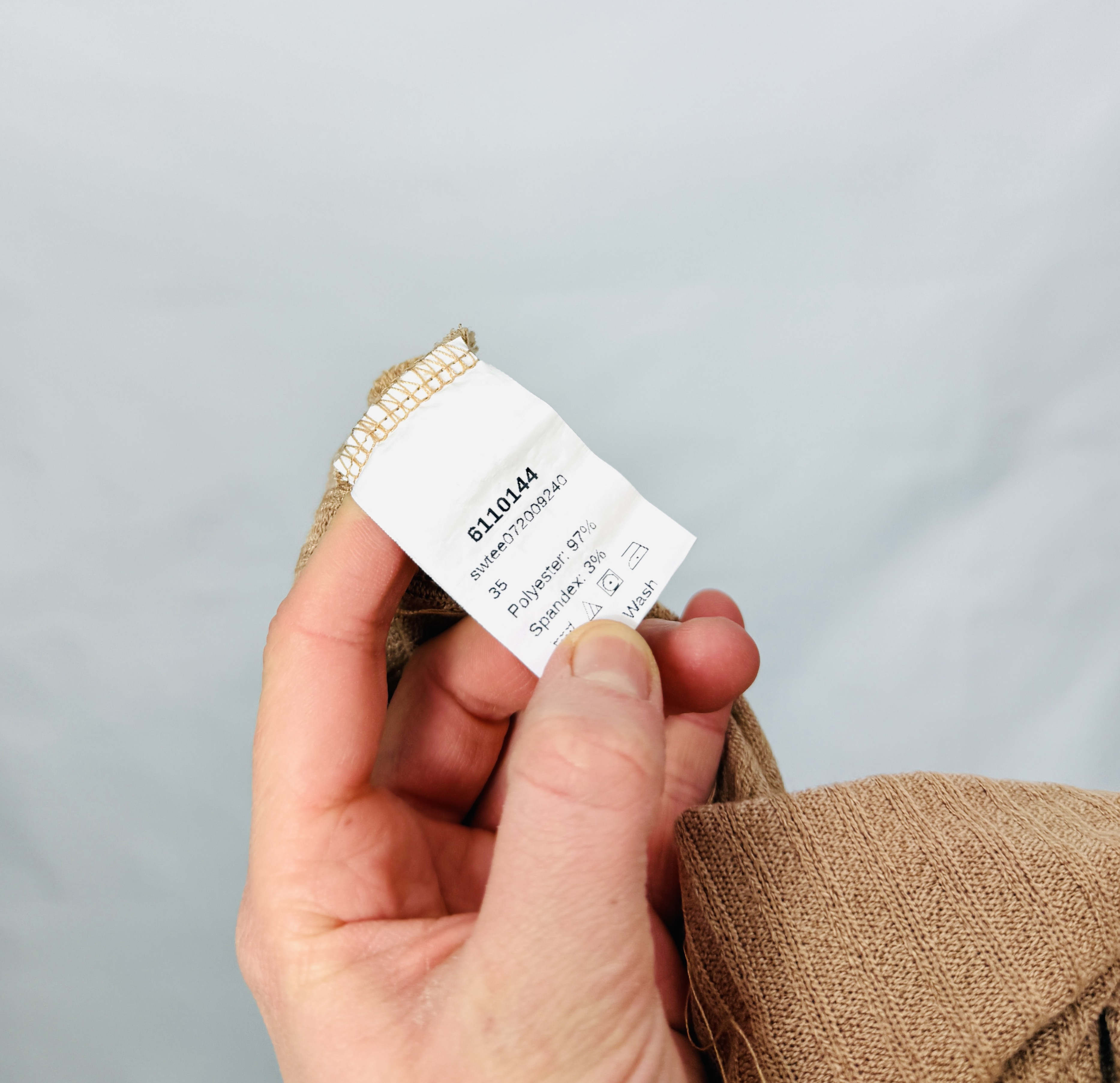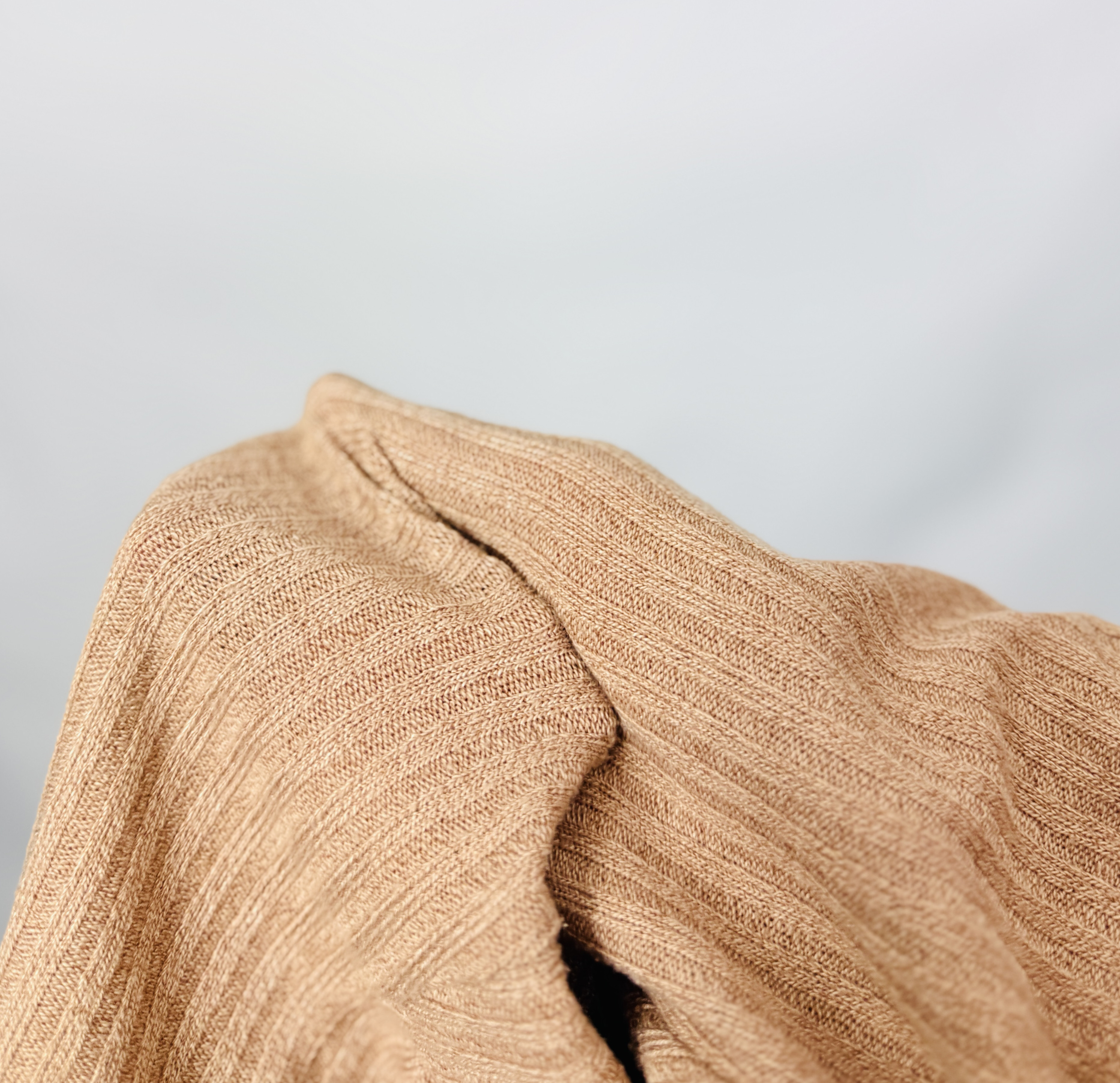 Prążkowana struktura materiału wygląda na elastyczną i miękko układającą się — splot porządkuje powierzchnię i jednocześnie modeluje bryłę, tworząc efekt lekkiego wysmuklenia. Powierzchnia ma przyjemny, nieco otulający charakter, który dodaje komfortu i wrażenia ciepła; materiał sprawia wrażenie sprężystego, dzięki czemu golf dopasowuje się do ciała, zachowując schludną linię. Subtelne marszczenie w talii i lekka faktura przy dekolcie stanowią estetyczne akcenty, które podkreślają staranne wykończenie projektu.