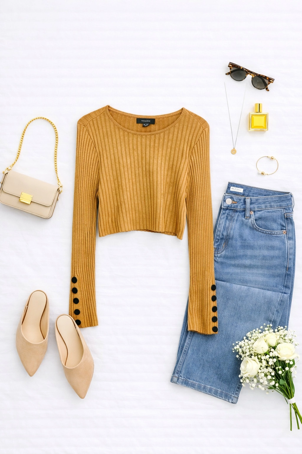 Fason sweterka jest krótki i dopasowany, co pozwala podkreślić talię i kobiece kształty, nadając sylwetce lekkości i finezji. Materiał ma wyraźną prążkowaną strukturę, która nie tylko wzbogaca wizualnie całość, ale także sprawia, że sweterek pięknie się układa, podkreślając naturalne linie ciała. Charakterystycznym detalem są ozdobne guziki umieszczone na długich rękawach, które wprowadzają modowy akcent i dodają całości wyjątkowego uroku. Rękawy są dopasowane, a guziki nadają im subtelnej elegancji i oryginalności, czyniąc sweterek ciekawszym i bardziej wyrazistym.