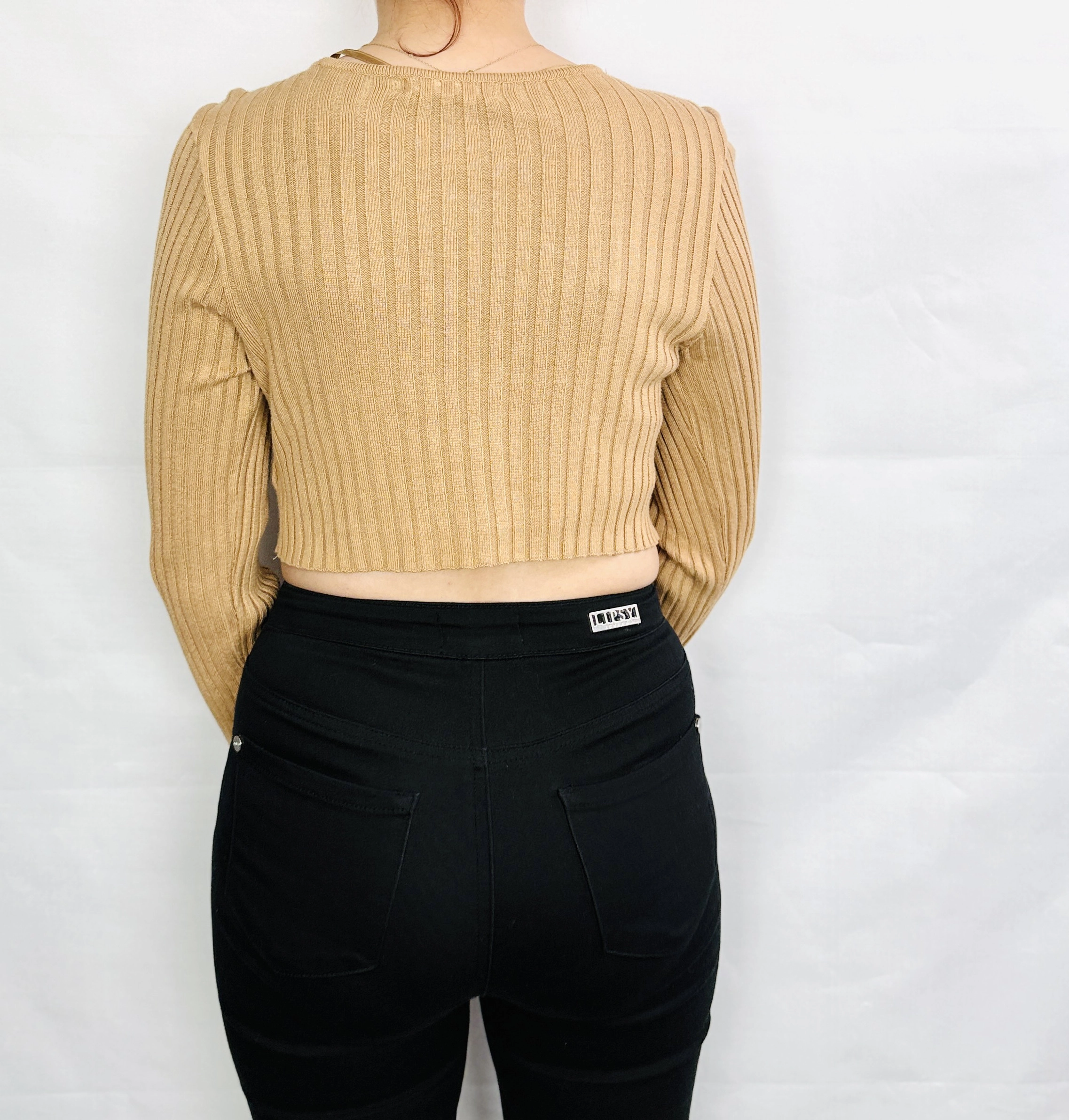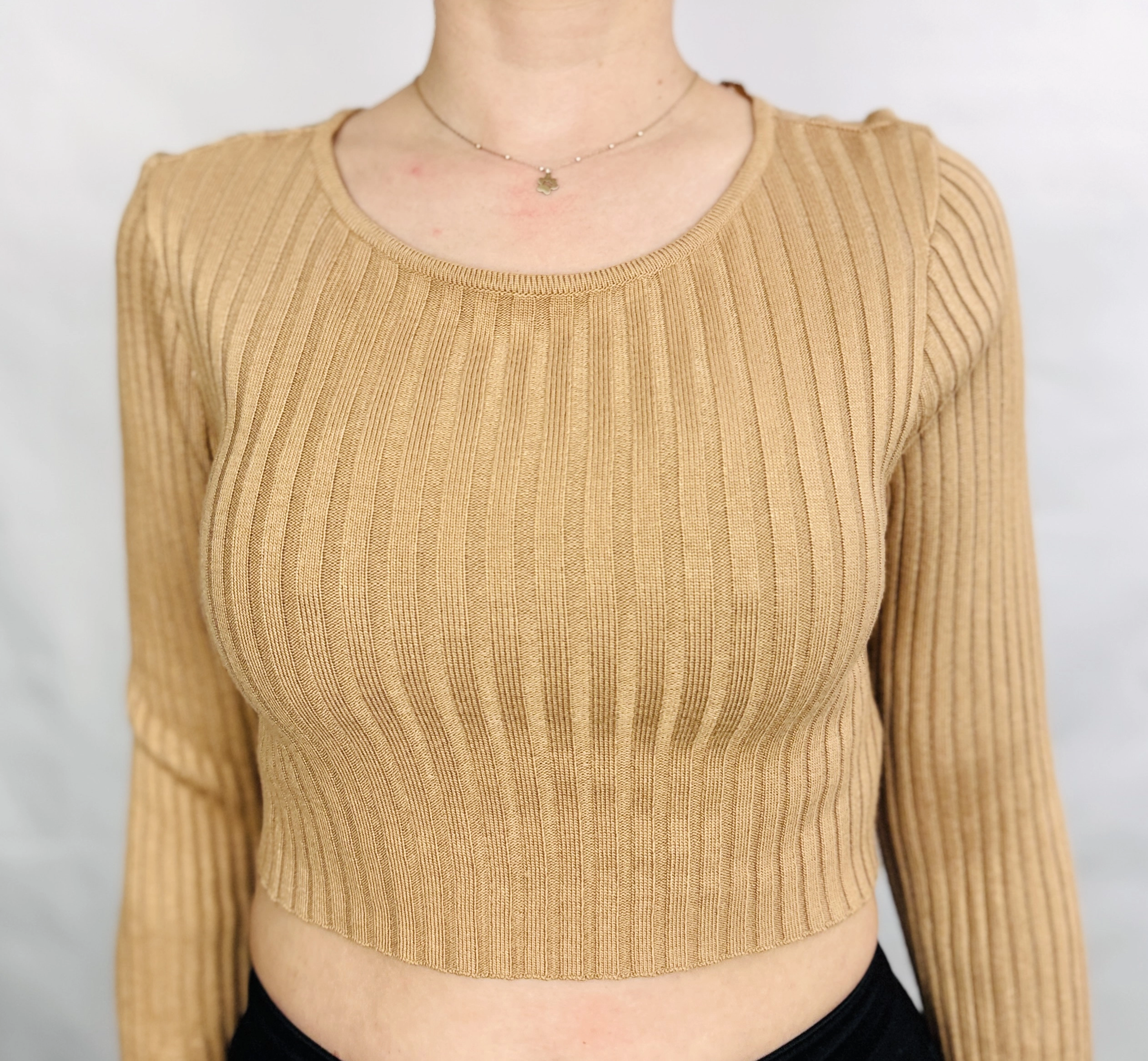 Długość sweterka sięga lekko nad linię talii, co czyni go idealnym do noszenia z wysokim stanem spodni, spódnic czy szortów, podkreślając sylwetkę i dodając stylizacji nowoczesnego charakteru. Beżowy kolor sweterka pozwala na łatwe łączenie z różnorodnymi barwami – od klasycznej czerni i bieli, przez ciepłe brązy i karmelowe odcienie, aż po pastelowe kolory, które podkreślą delikatność i świeżość stylizacji. Sweterek doskonale sprawdzi się zarówno w casualowych zestawach z jeansami i sneakersami, jak i w bardziej eleganckich stylizacjach z ołówkowymi spódnicami i botkami na obcasie.