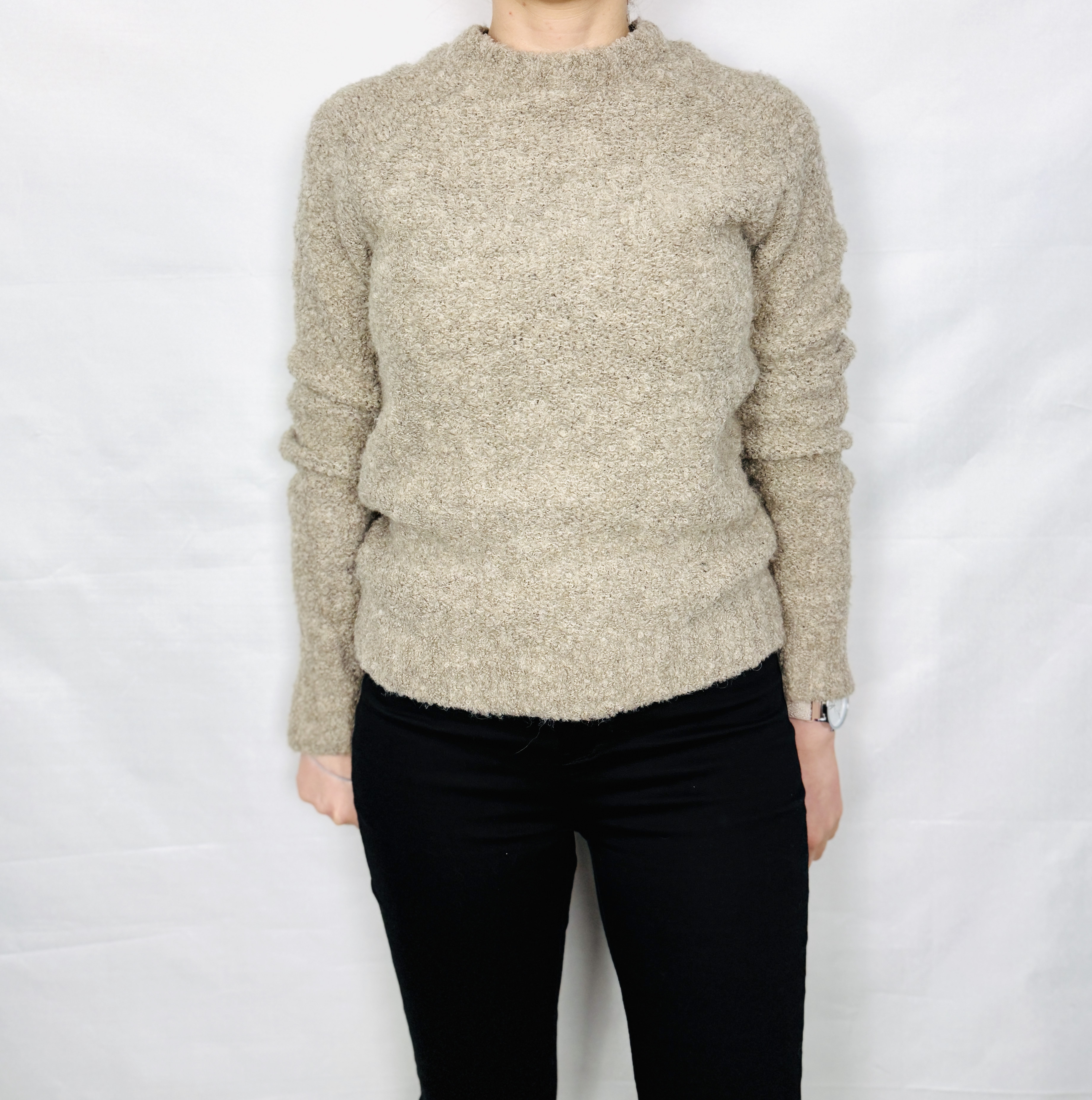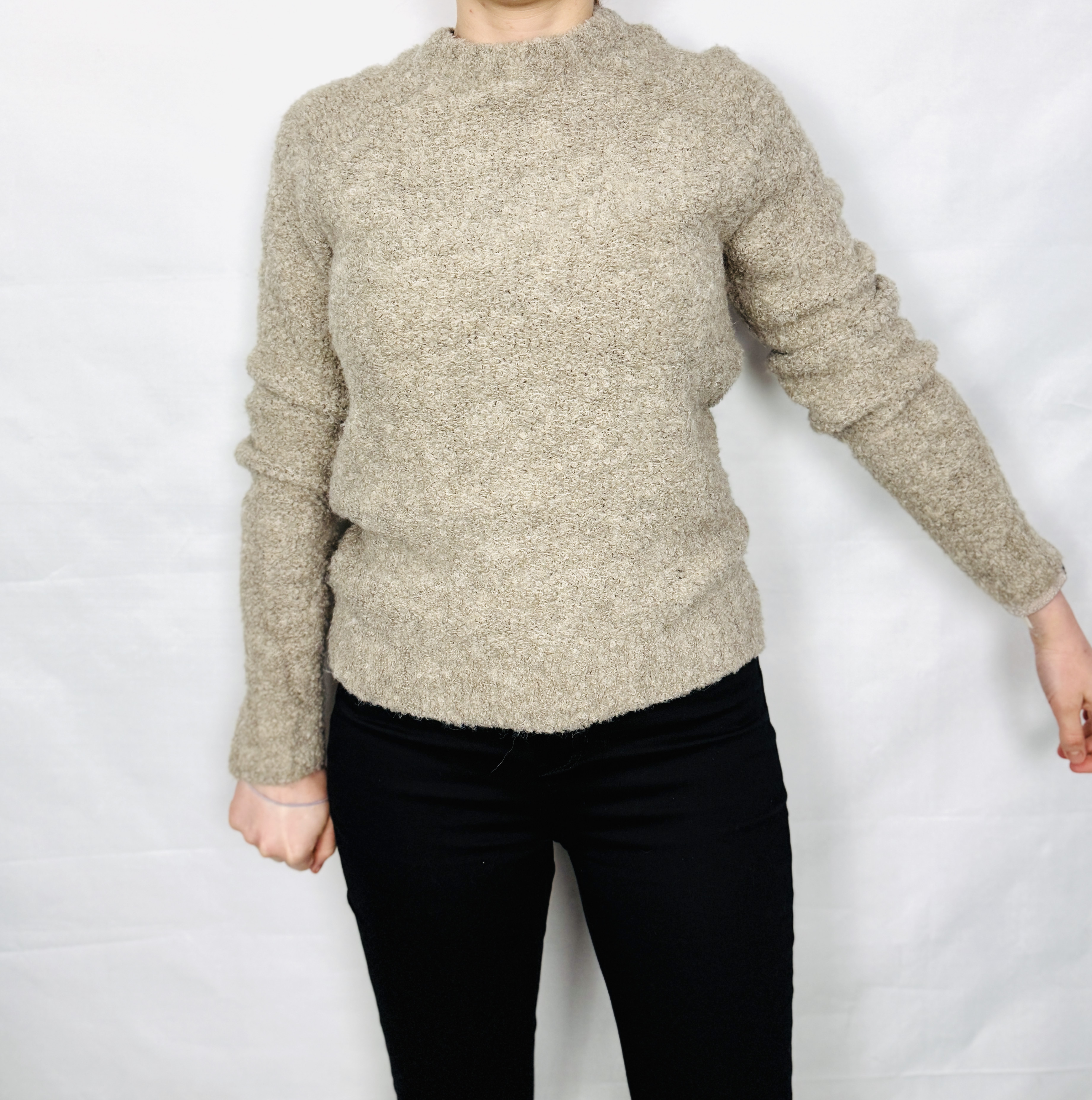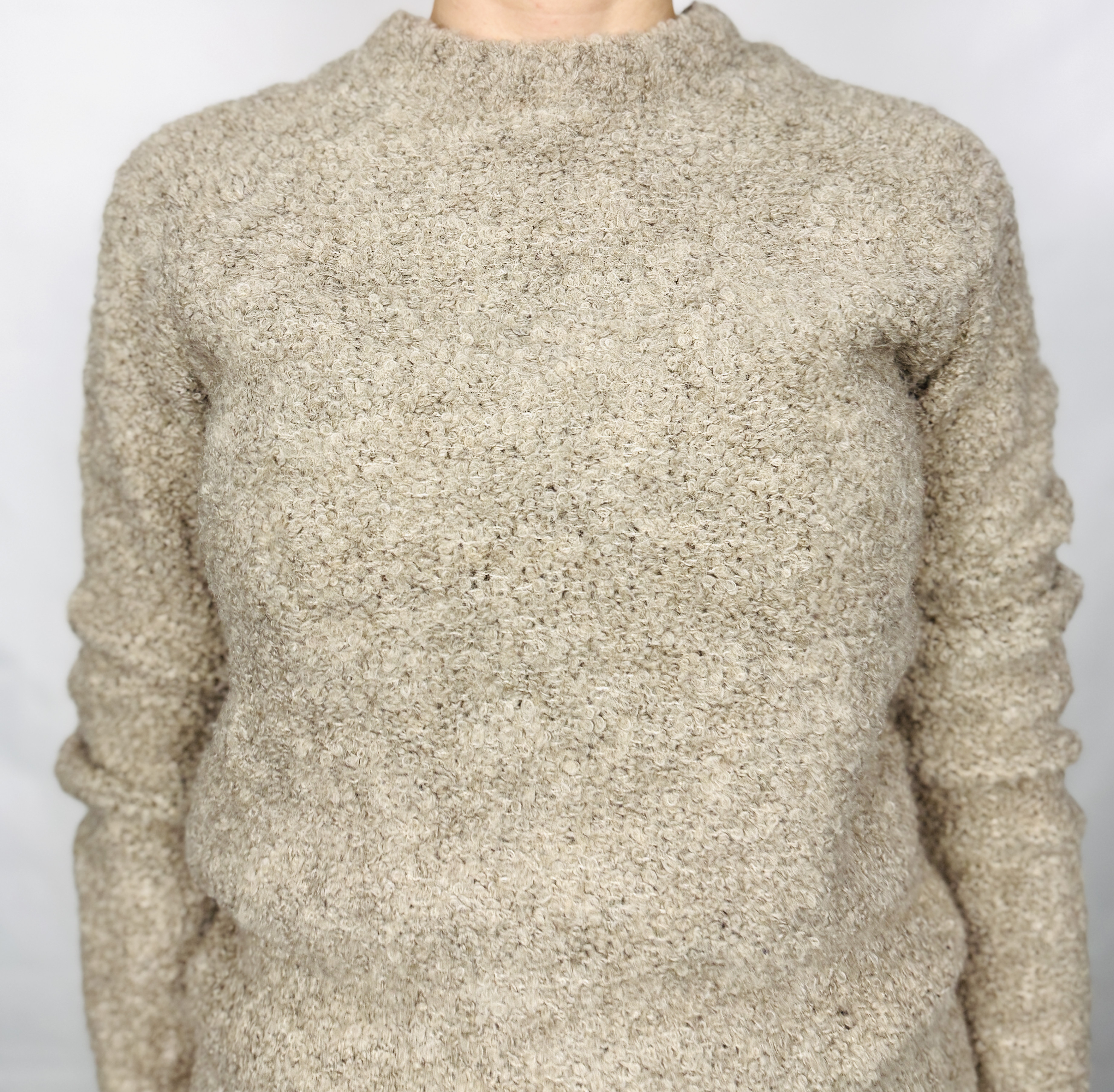 To przytulny i subtelnie elegancki sweter, który emanuje ciepłem i naturalną prostotą. Jego stonowany, beżowy odcień wprowadza spokój i uniwersalność, a miękka, pętelkowa faktura bouclé nadaje ubraniu wyraźnie przytulnego charakteru. Całość ma spokojny, niemal rustykalny urok — to element garderoby, który zaprasza do noszenia go w codziennych stylizacjach, jednocześnie dodając im delikatnej, kobiecej miękkości.