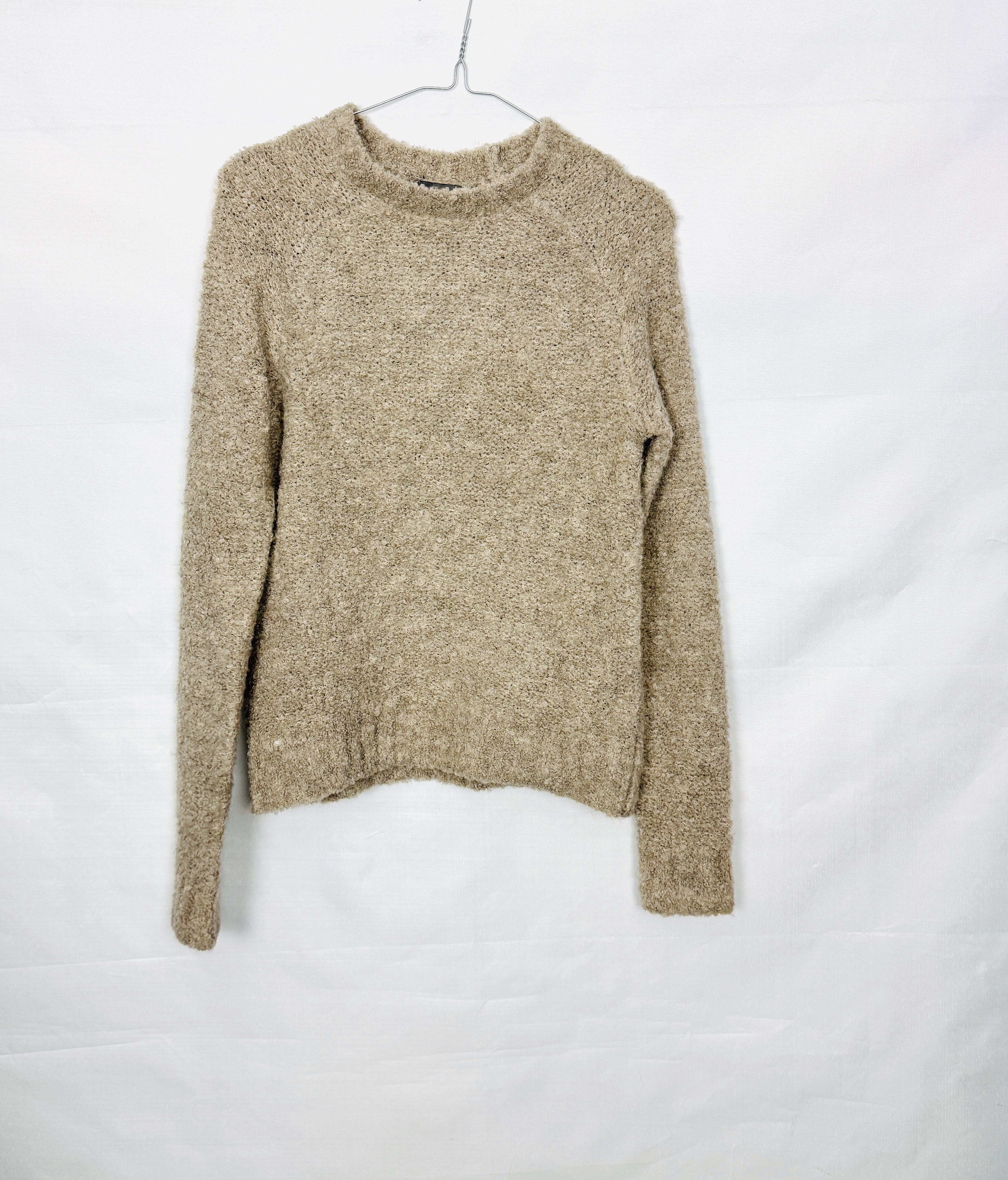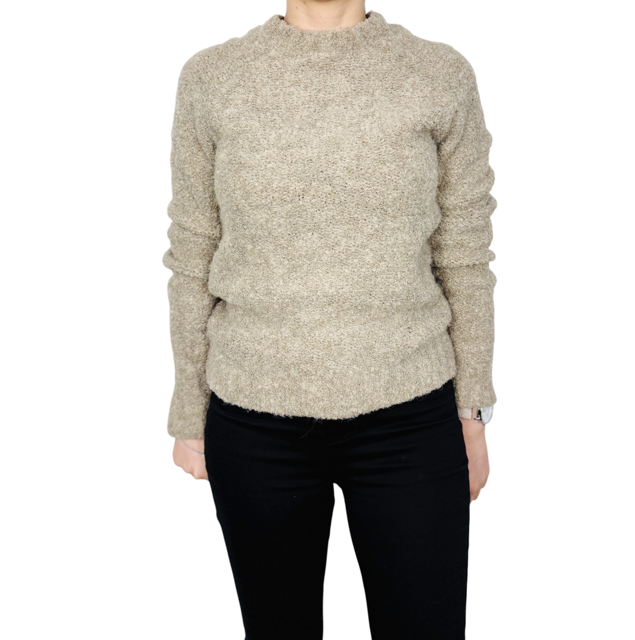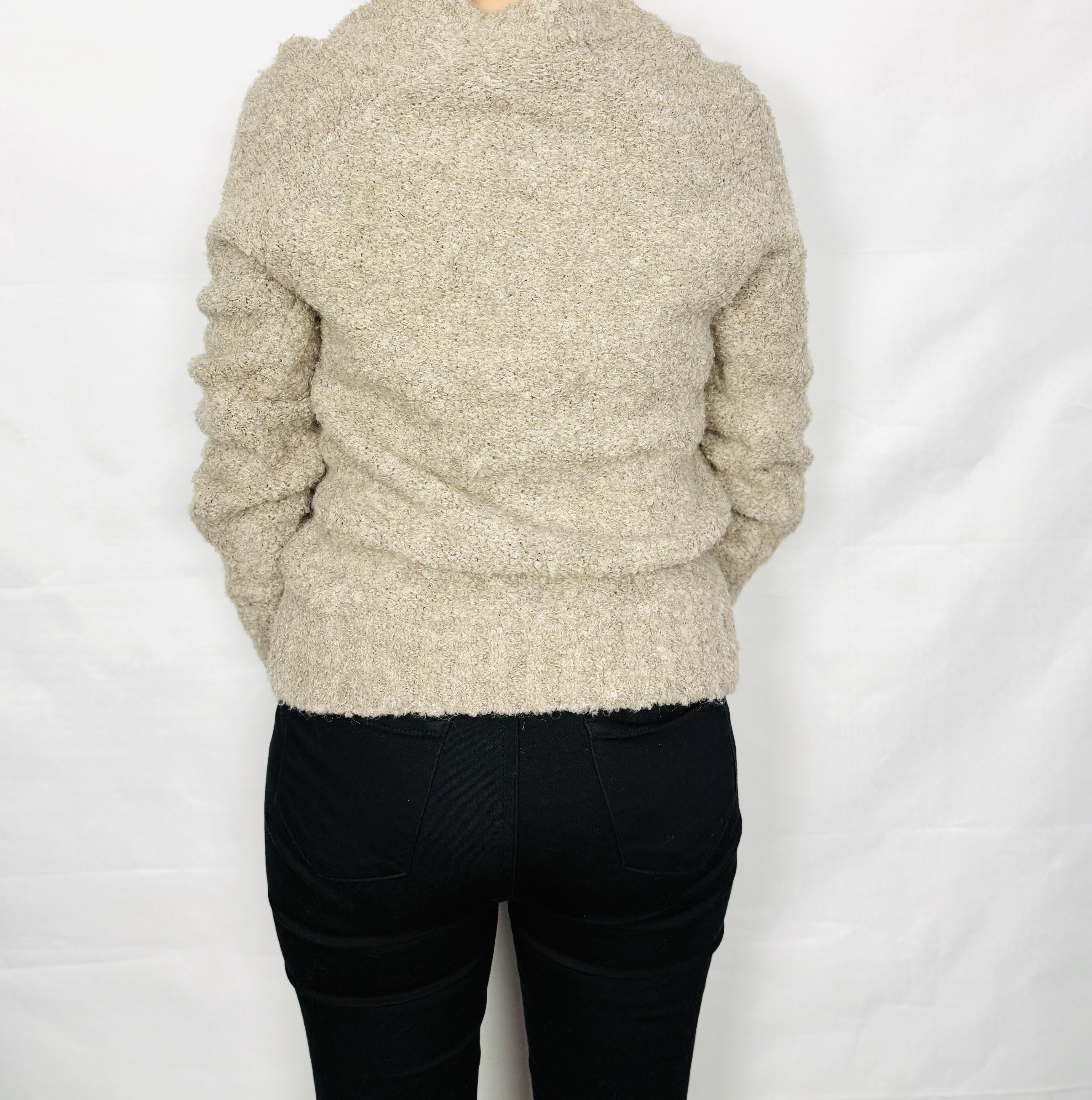 To przytulny i subtelnie elegancki sweter, który emanuje ciepłem i naturalną prostotą. Jego stonowany, beżowy odcień wprowadza spokój i uniwersalność, a miękka, pętelkowa faktura bouclé nadaje ubraniu wyraźnie przytulnego charakteru. Całość ma spokojny, niemal rustykalny urok — to element garderoby, który zaprasza do noszenia go w codziennych stylizacjach, jednocześnie dodając im delikatnej, kobiecej miękkości.