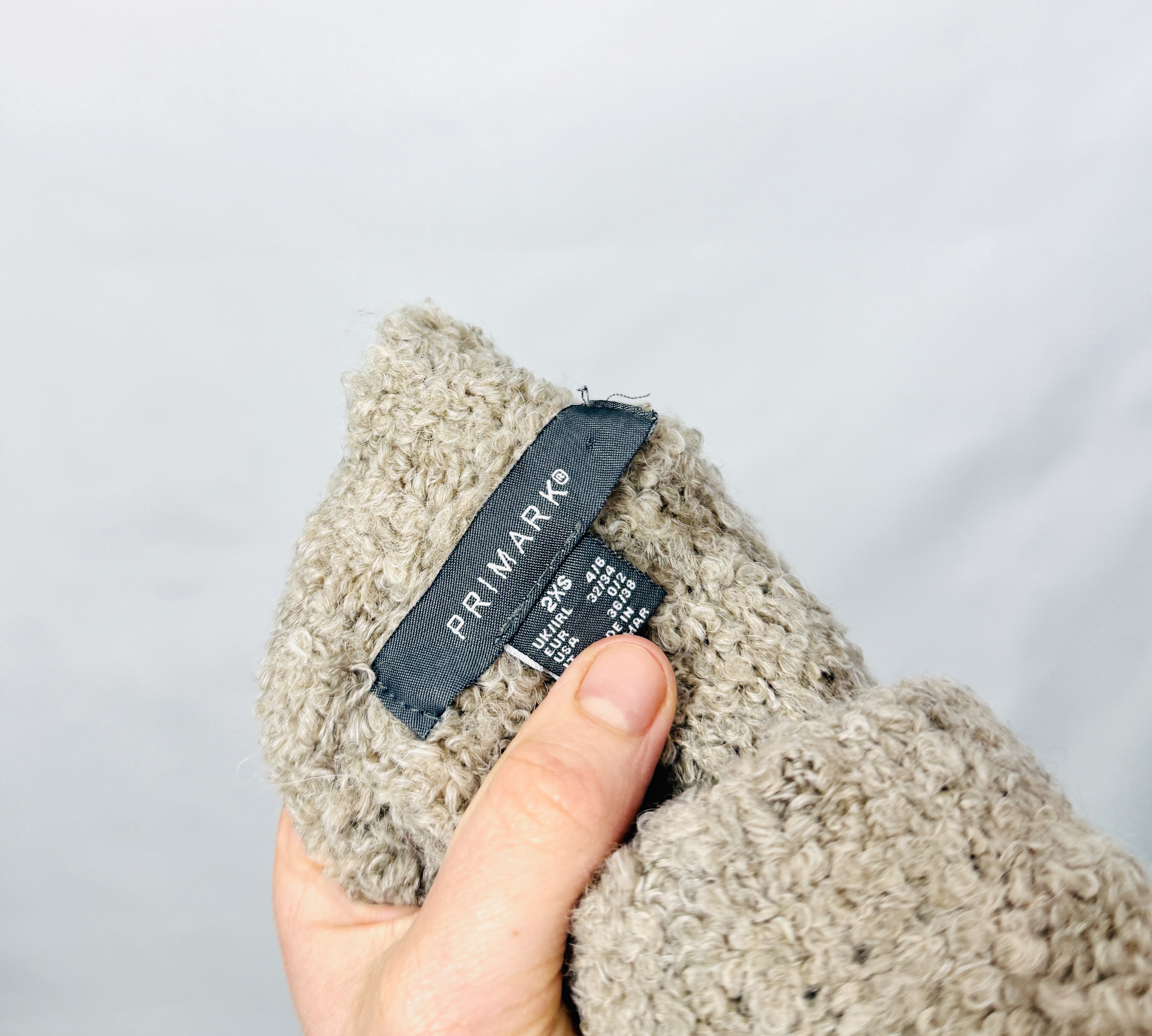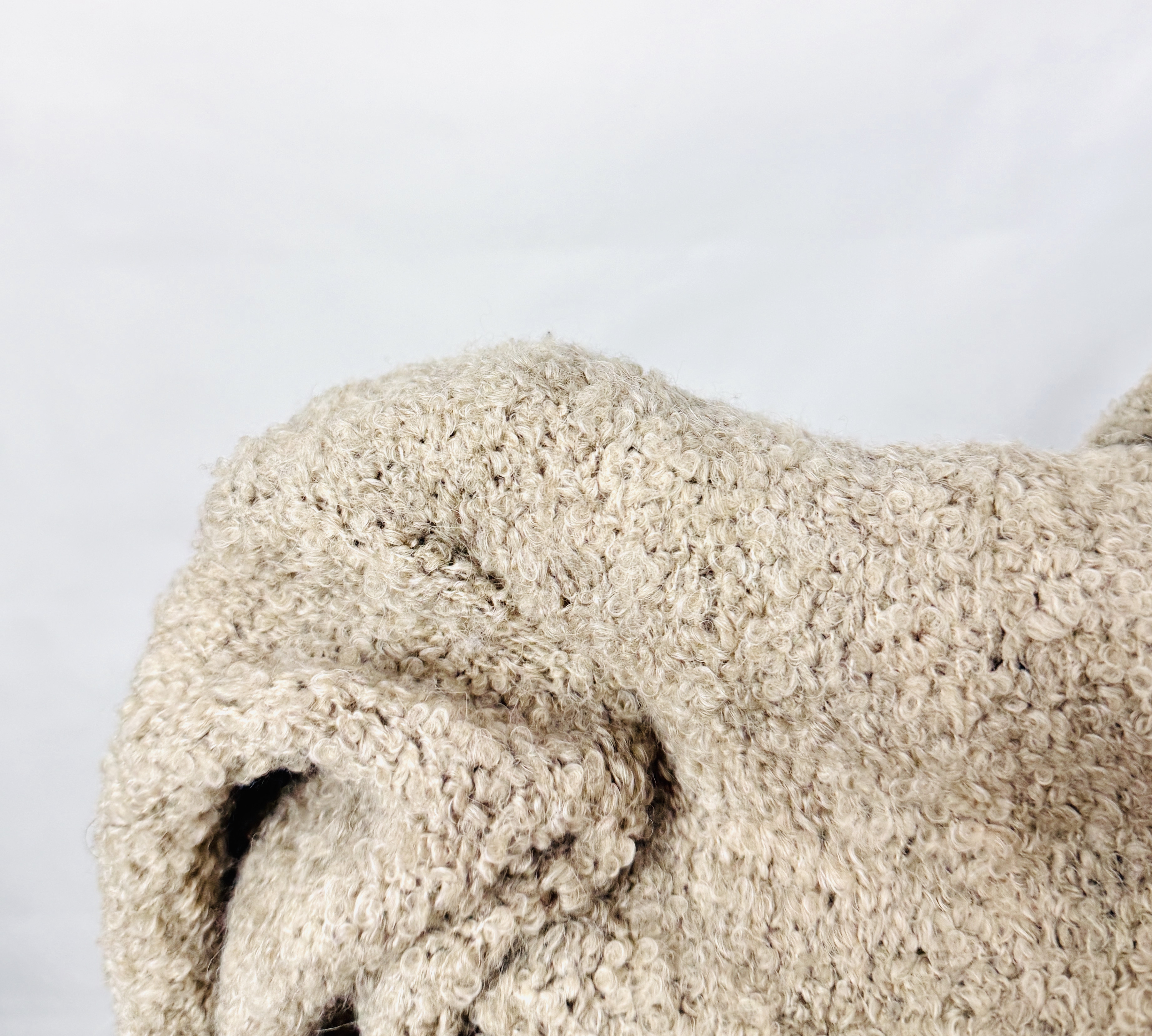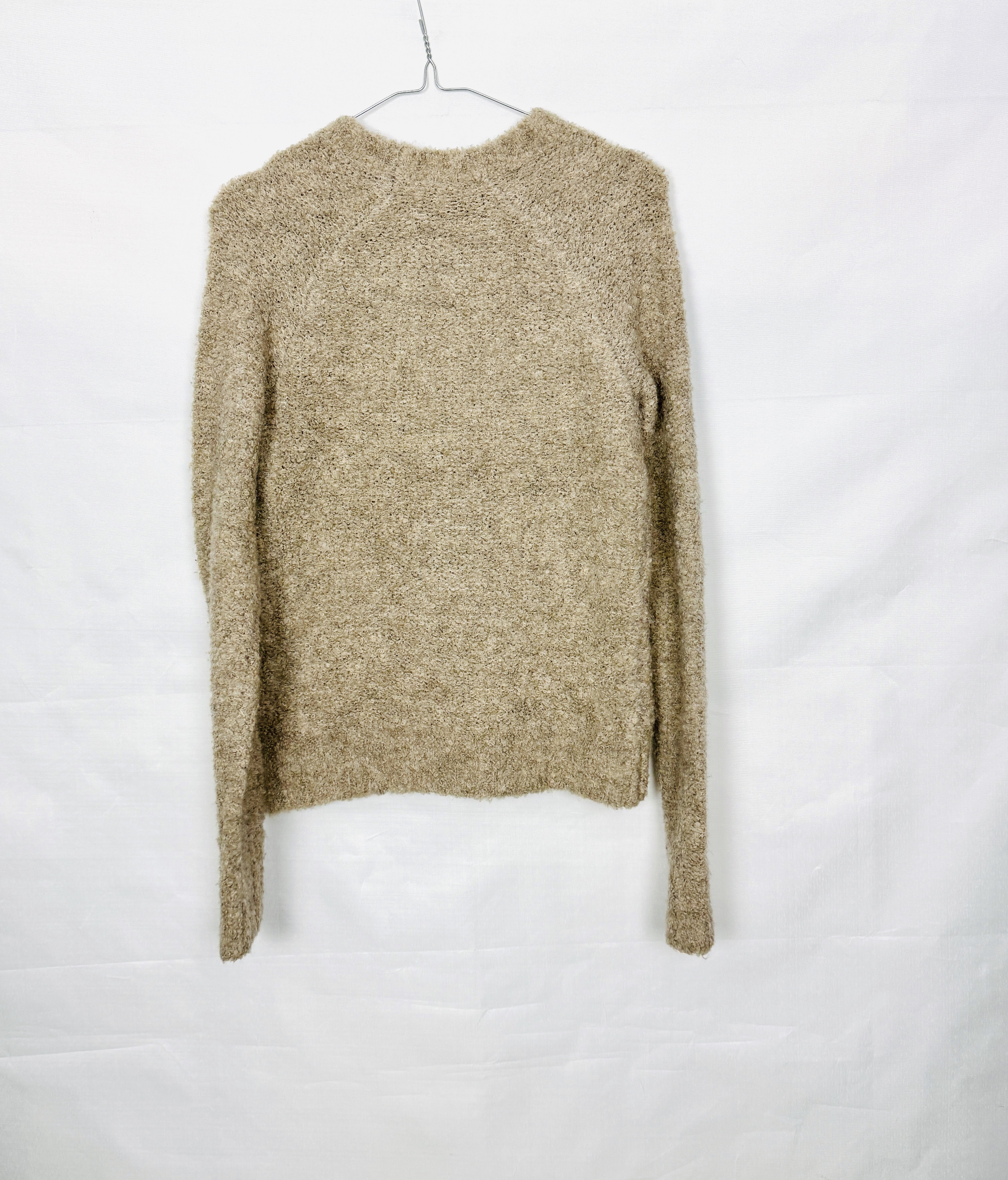 Materiał wygląda na nieco grubszy i otulający, o miękkiej, pętelkowej powierzchni, która daje efekt puszystości i lekkiego zmiękczenia konturów. Taka faktura sprawia, że sweter wydaje się ciepły i miły w dotyku; układa się miękko, tworząc delikatne fałdowania tam, gdzie materiał naturalnie pracuje z ruchem ciała. Powierzchnia ma subtelną, niejednolitą strukturę, dzięki czemu prosta forma nabiera interesującego, przytulnego wyrazu bez dodatkowych zdobień.