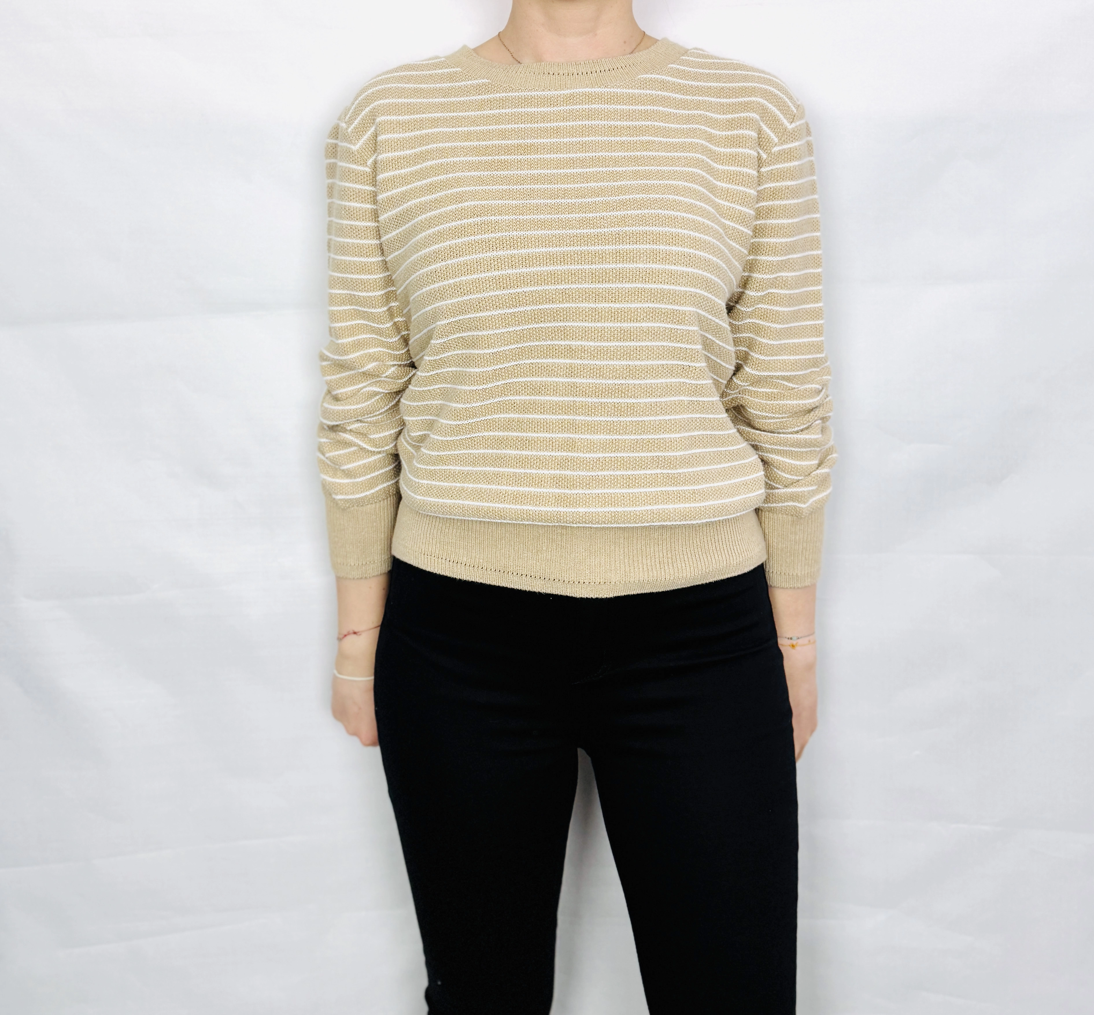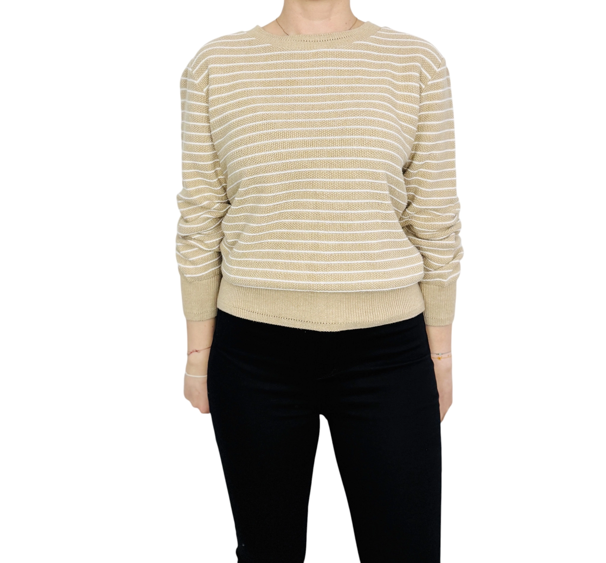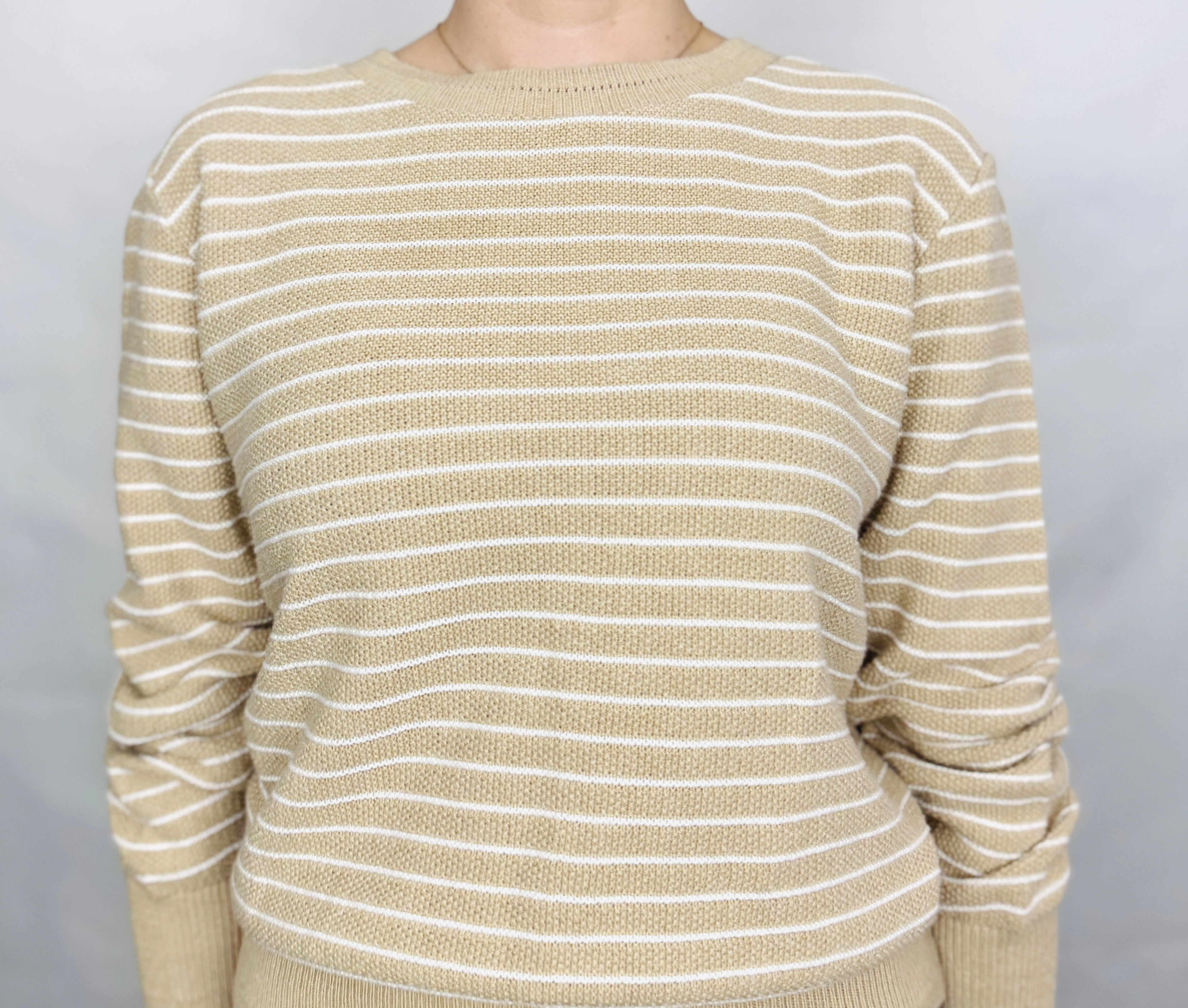 Ten beżowy sweter to połączenie przytulnej klasyki z nowoczesną prostotą, która doskonale wpisuje się w codzienne stylizacje. Jasny, ciepły odcień beżu został uzupełniony delikatnymi, jasnymi paskami, które nadają całości lekkości i subtelnej dynamiki. To model, który emanuje spokojem i naturalną elegancją, idealny dla kobiet ceniących stonowane kolory i ponadczasowe formy.