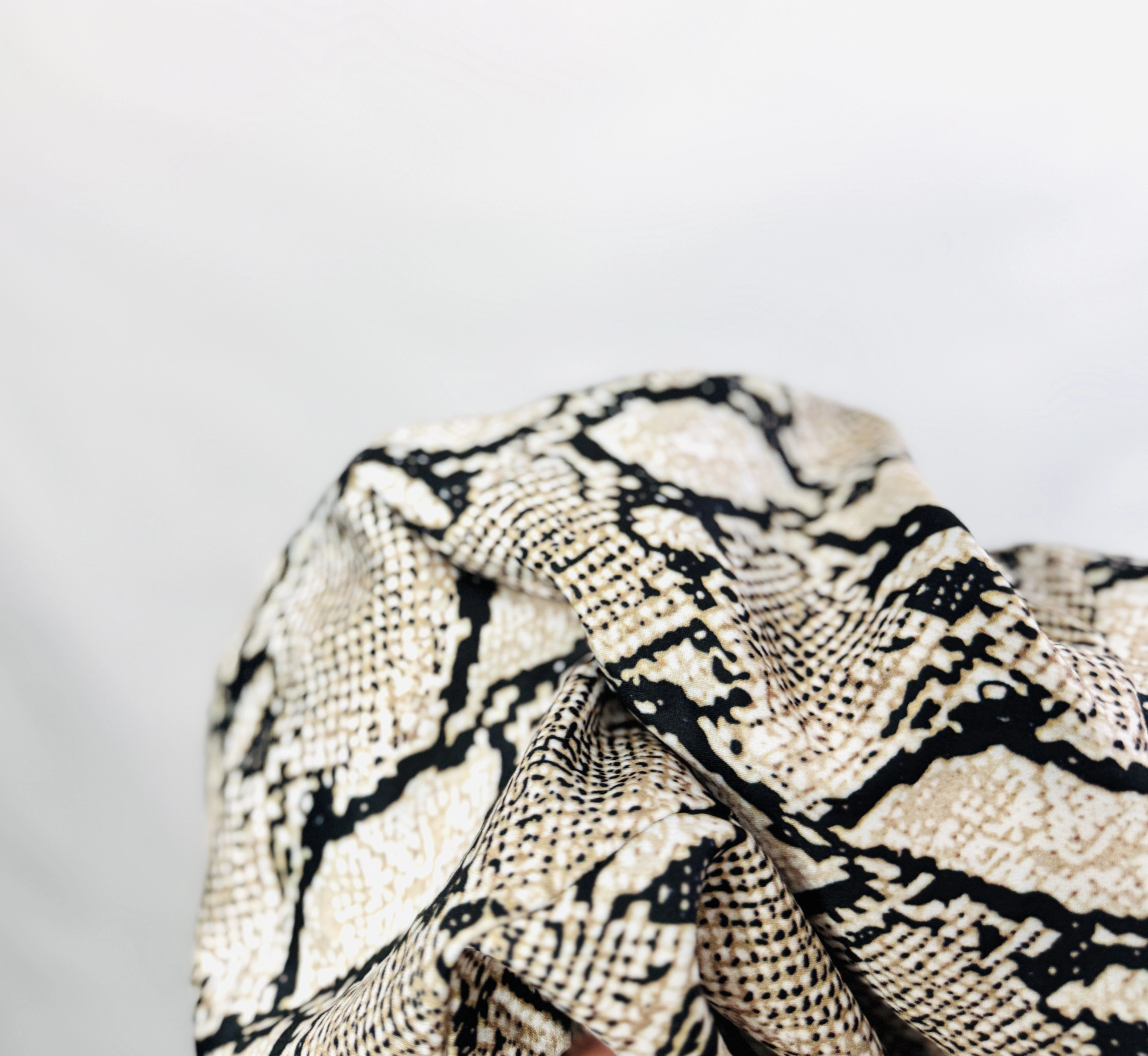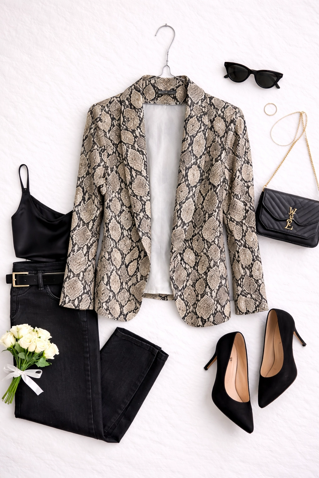 Materiał prezentuje się jako gładszy i lekko strukturalny, o subtelnej sztywności, która utrzymuje formę żakietu i podkreśla jego geometryczną linię. Wężowy motyw dodaje głębi i faktury wizualnej, a jednocześnie nie przytłacza, pozwalając na łatwe komponowanie dodatków. Taki fason optycznie modeluje sylwetkę: lekko zarysowane ramiona podkreślają górę ciała i nadają pewną dozę struktury sylwetce prostokątnej, natomiast u sylwetki gruszki żakiet pomaga wyrównać proporcje, skupiając uwagę na górze.