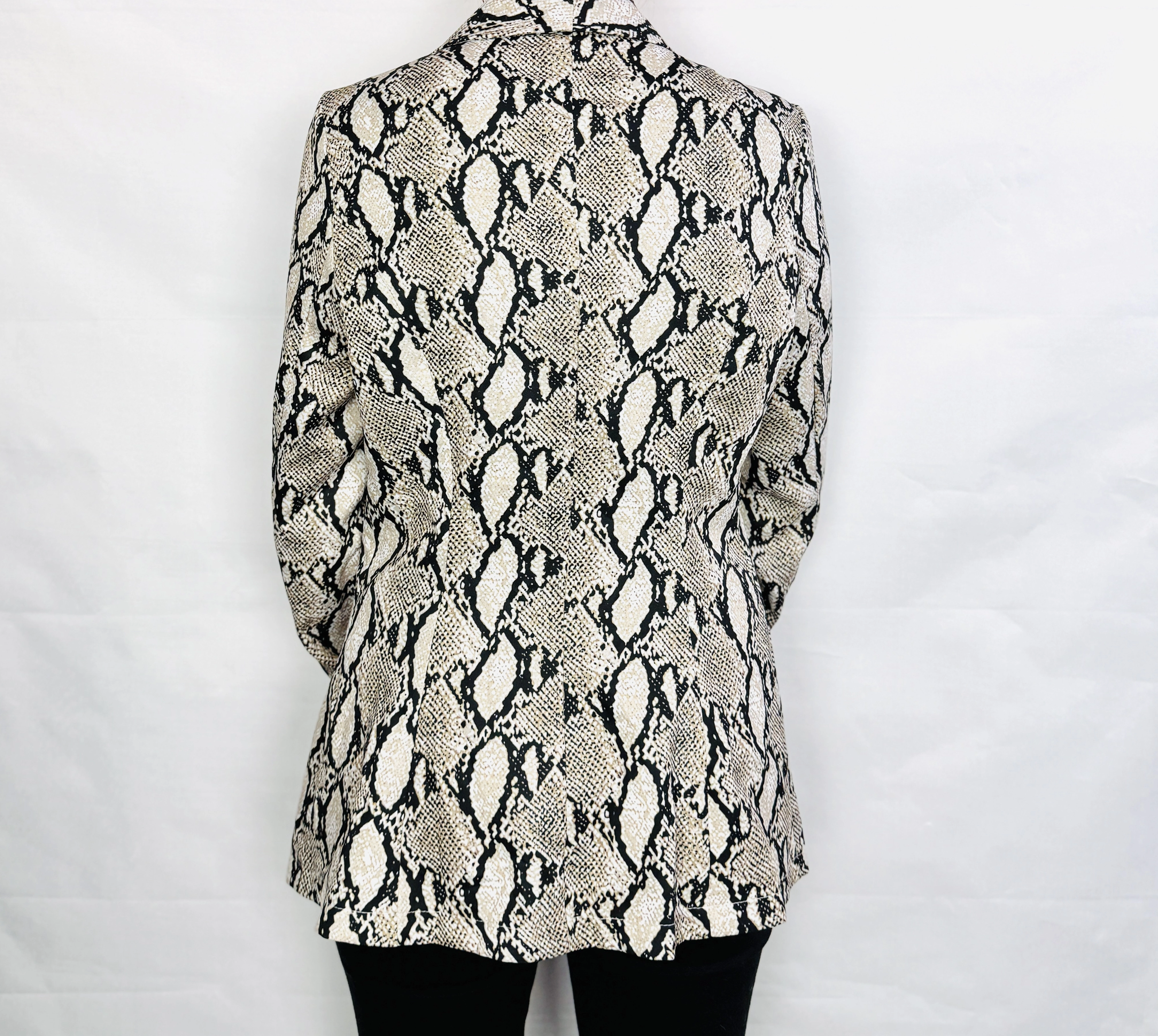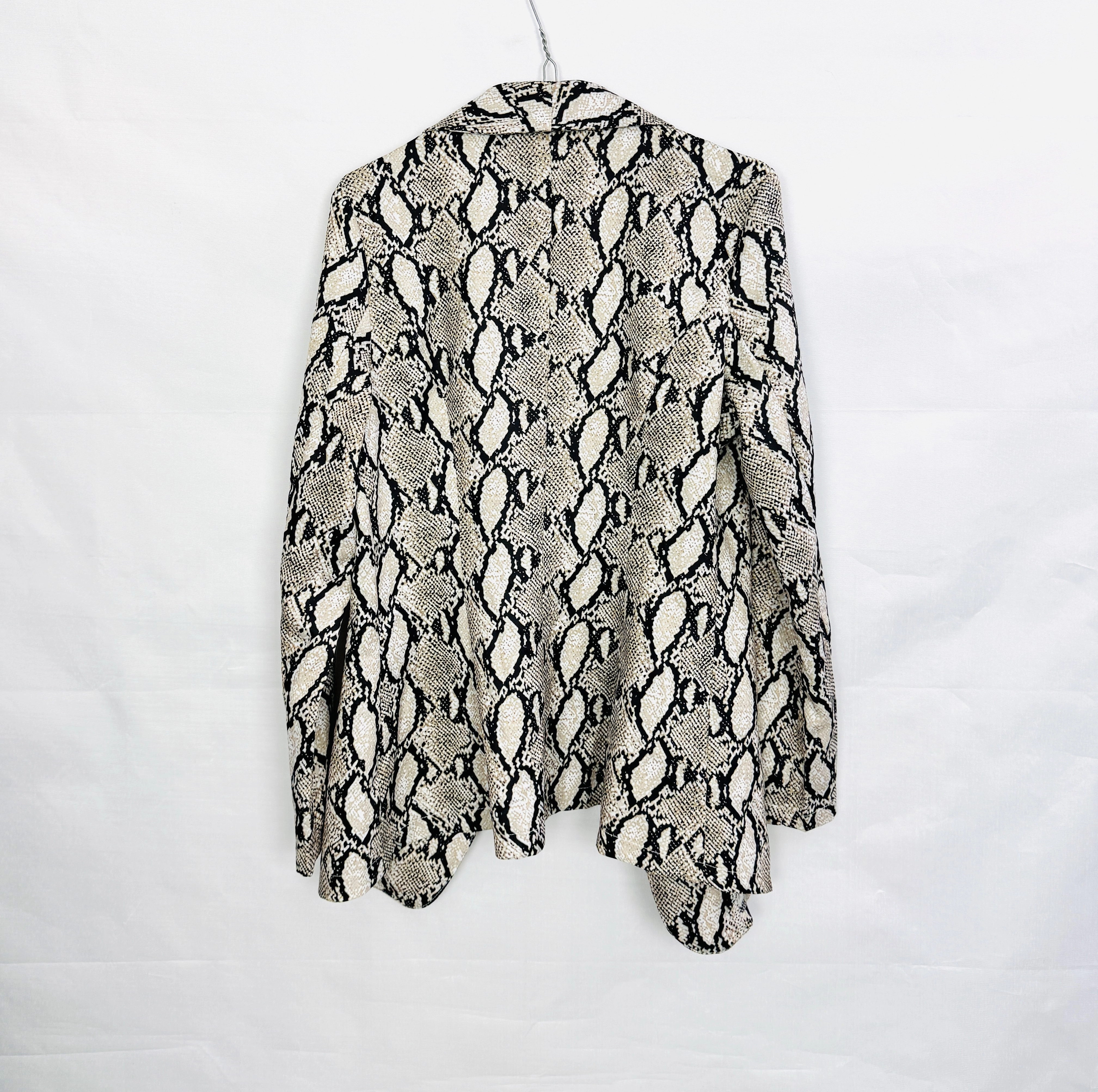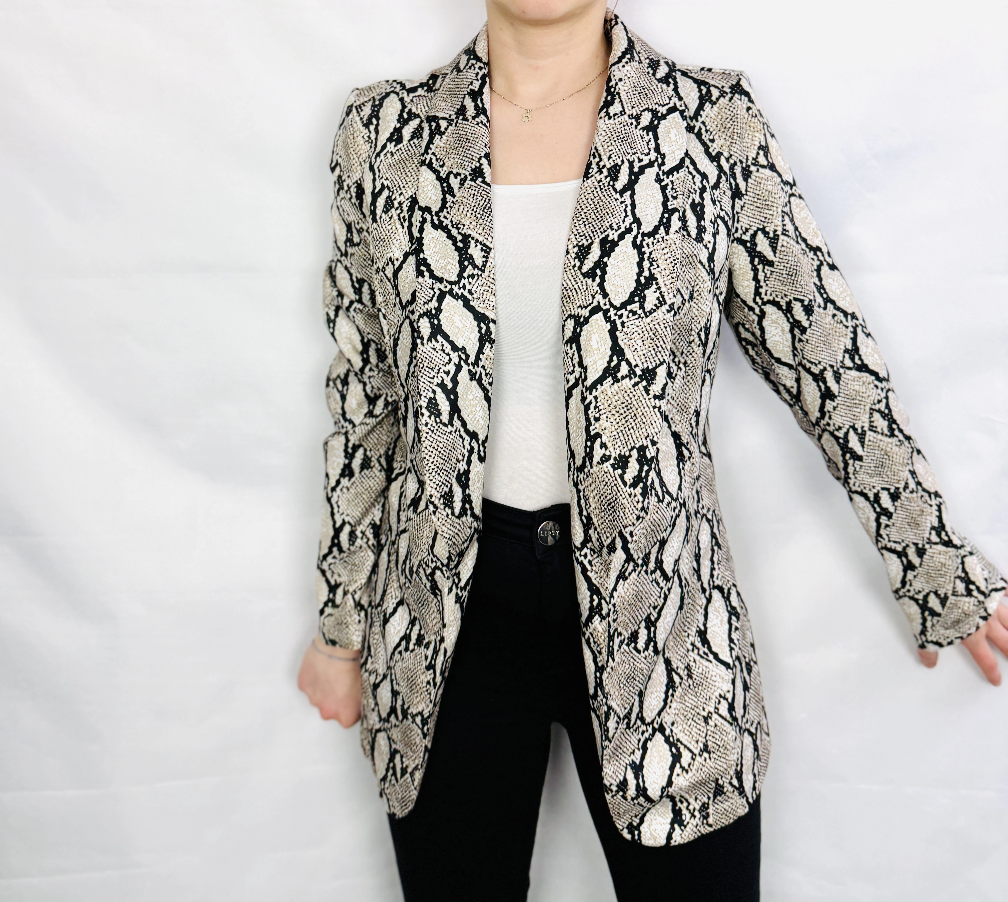 To żakiet o mocnym, modowym charakterze, który łączy klasyczną formę z nowoczesnym akcentem. Wężowy wzór w tonacjach beżu, kremu i czerni nadaje mu wyrazistej elegancji i lekko drapieżnego szyku, dzięki czemu doskonale wpisuje się w garderobę osób ceniących wyraziste, ale jednocześnie przemyślane elementy stylu. Całość sprawia wrażenie dopracowanej prostoty z nutą odważnej estetyki, idealnej zarówno do miejskich, jak i bardziej formalnych zestawień.
