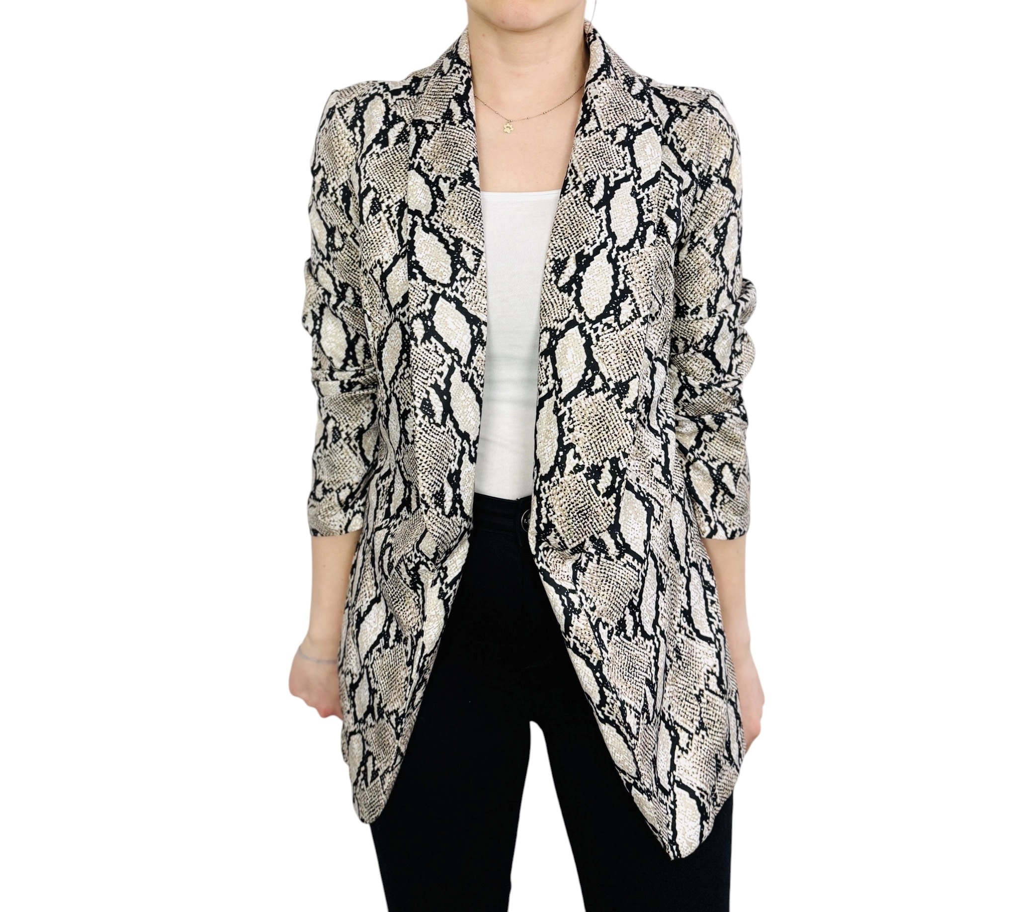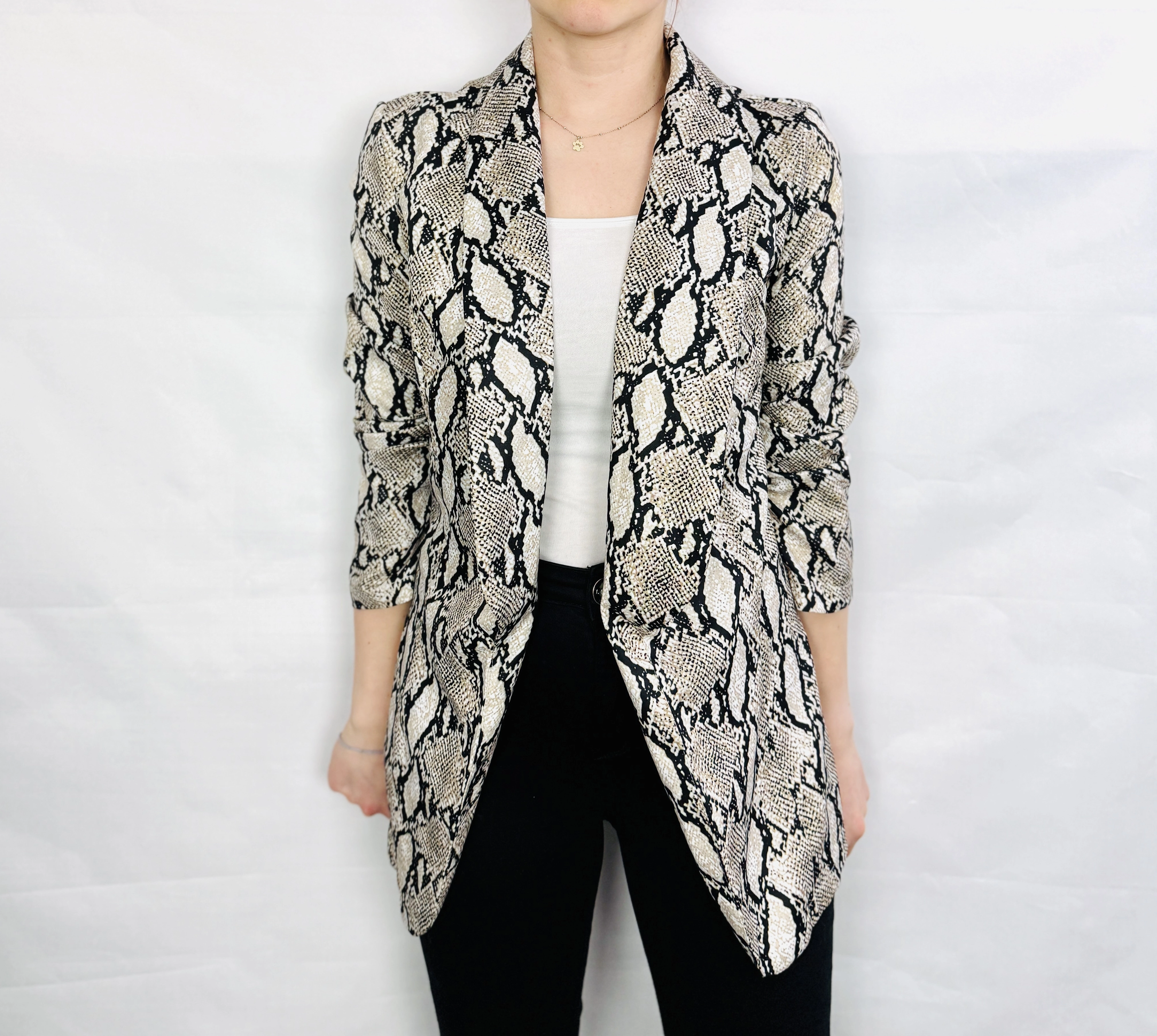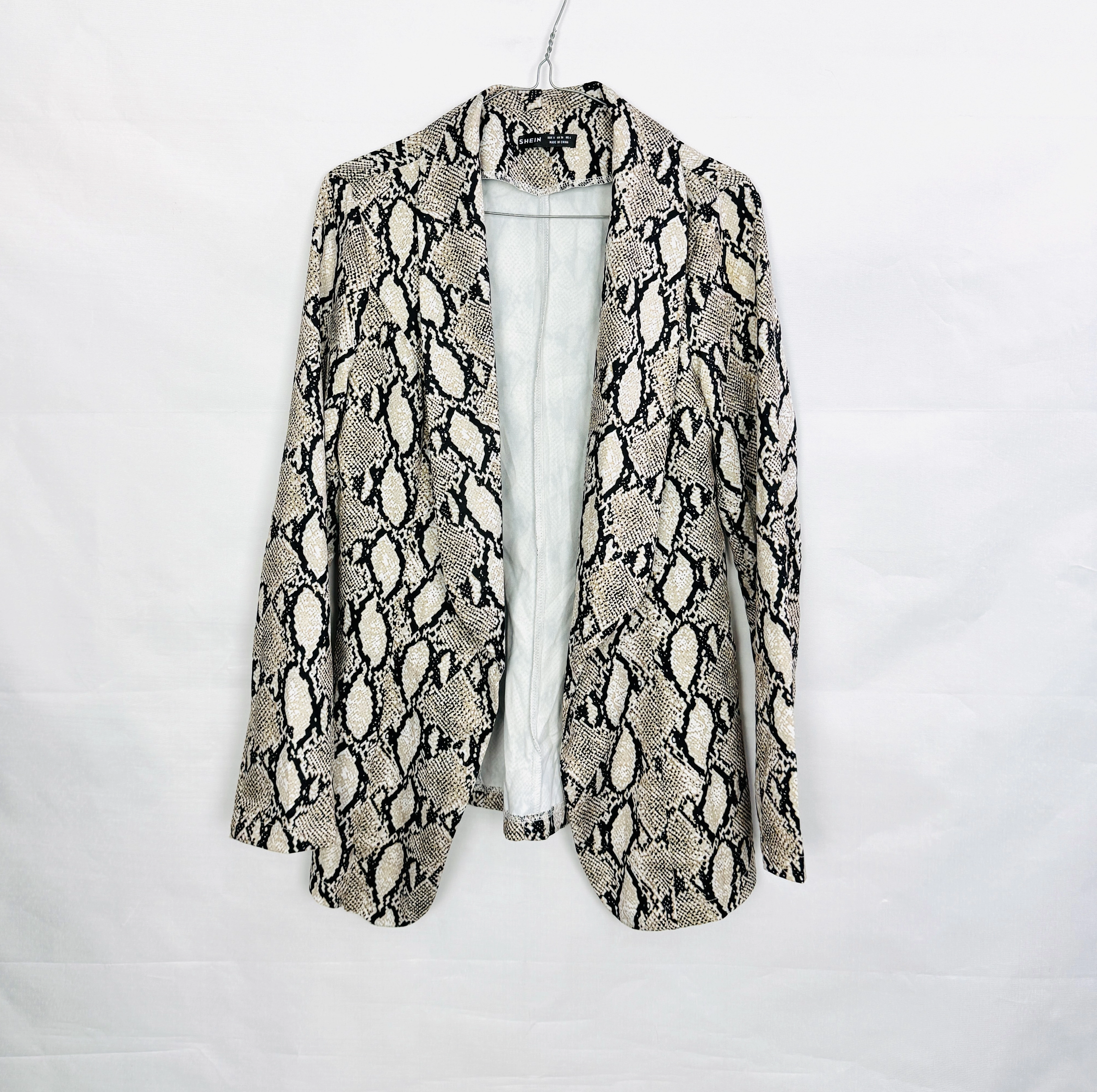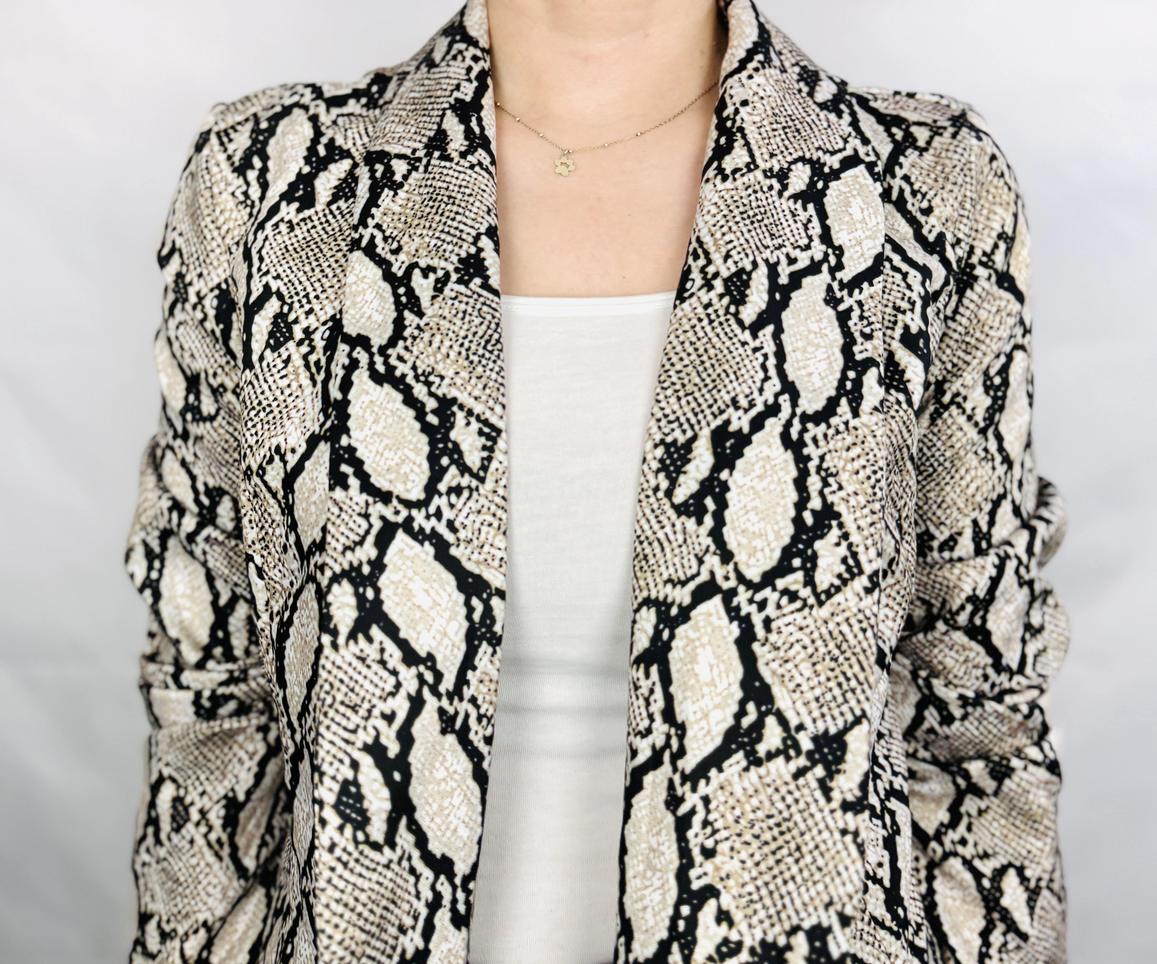 To żakiet o mocnym, modowym charakterze, który łączy klasyczną formę z nowoczesnym akcentem. Wężowy wzór w tonacjach beżu, kremu i czerni nadaje mu wyrazistej elegancji i lekko drapieżnego szyku, dzięki czemu doskonale wpisuje się w garderobę osób ceniących wyraziste, ale jednocześnie przemyślane elementy stylu. Całość sprawia wrażenie dopracowanej prostoty z nutą odważnej estetyki, idealnej zarówno do miejskich, jak i bardziej formalnych zestawień.
