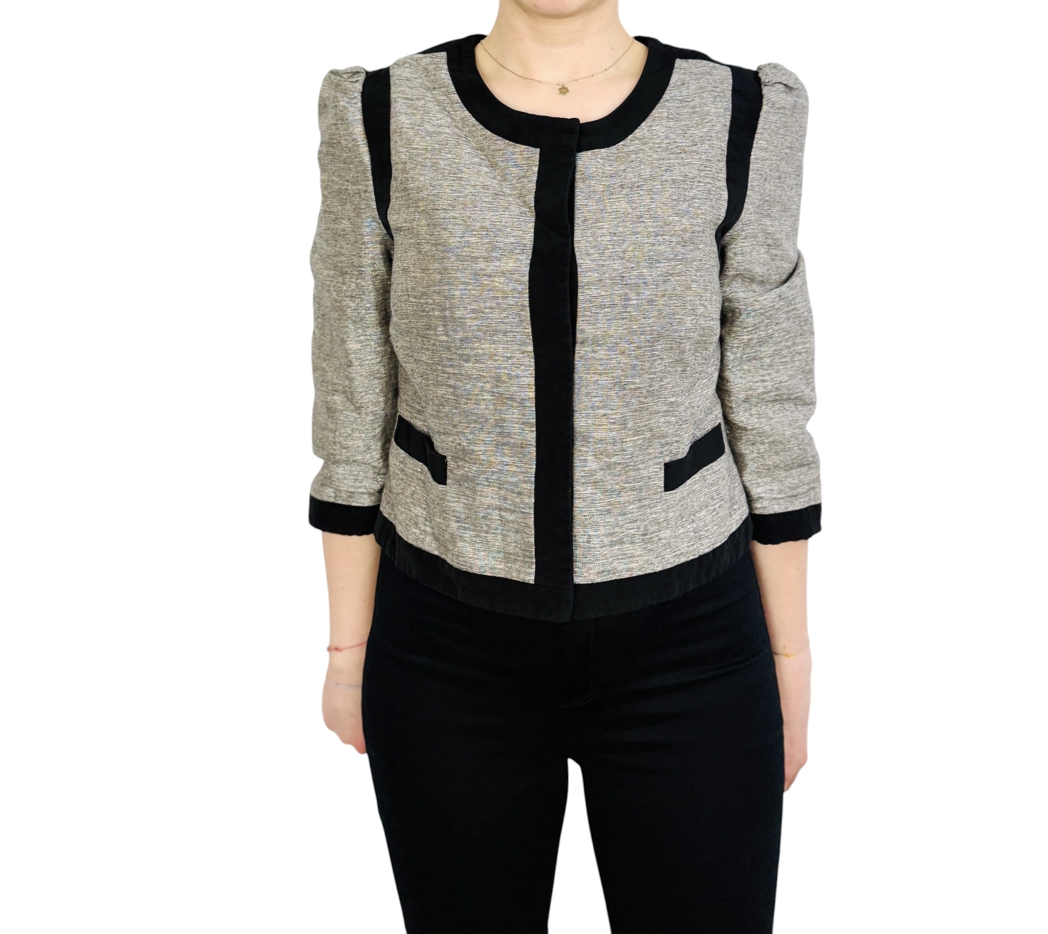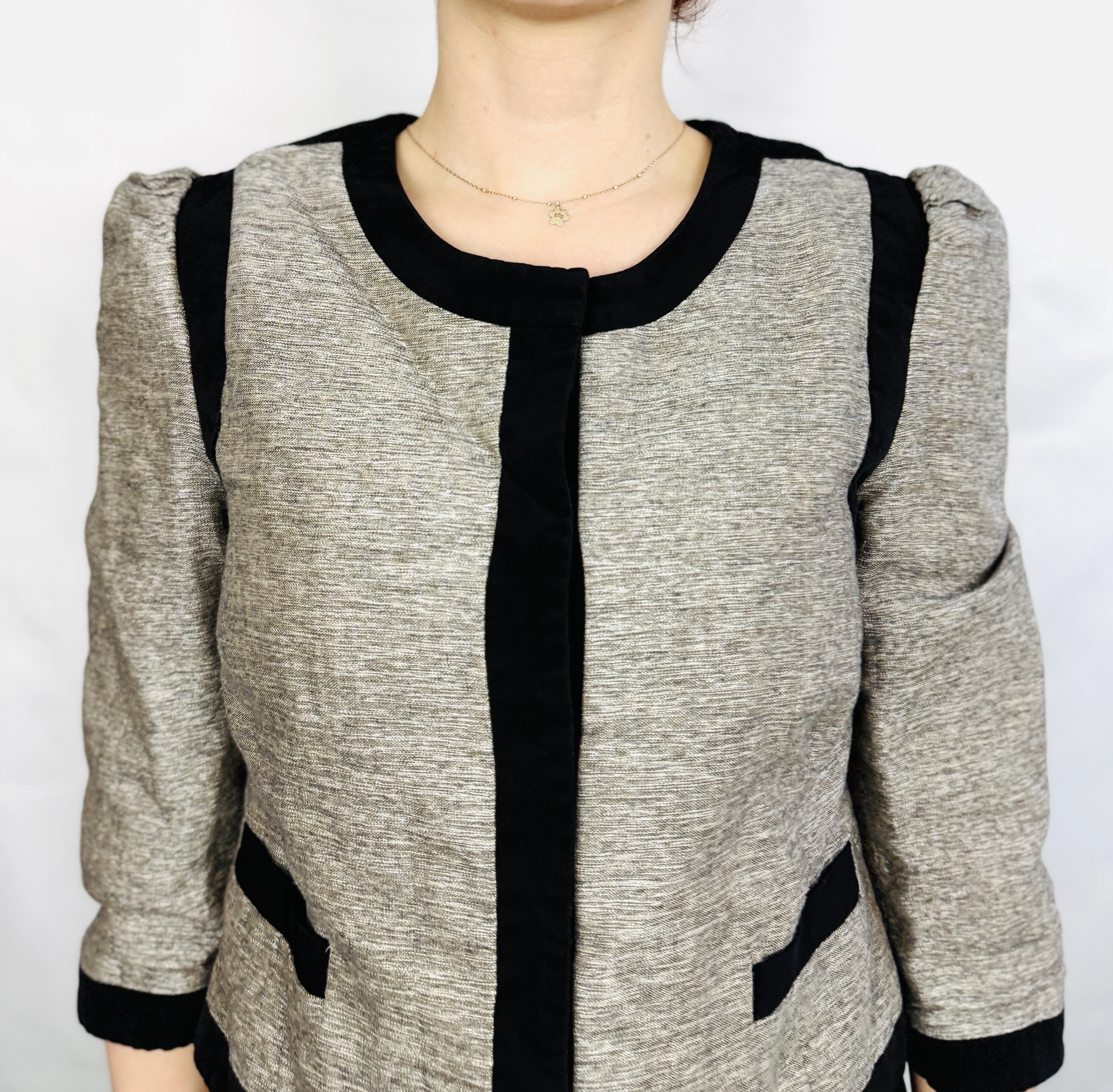 Fason żakietu charakteryzuje się prostą, pudełkową linią, która nadaje sylwetce uporządkowany i nowoczesny wygląd. Okrągły dekolt został wykończony szeroką, czarną lamówką, która pięknie obramowuje szyję i dodaje projektowi wyrazistości. Brak tradycyjnych klap sprawia, że żakiet prezentuje się minimalistycznie, a jednocześnie bardzo luksusowo. Pionowa, czarna plisa biegnąca wzdłuż linii zapięcia optycznie wysmukla sylwetkę i dzieli ją pionowo, co dodaje figurze lekkości. Długość sięgająca do bioder pozwala na zachowanie idealnych proporcji, świetnie komponując się z różnymi dołami garderoby.