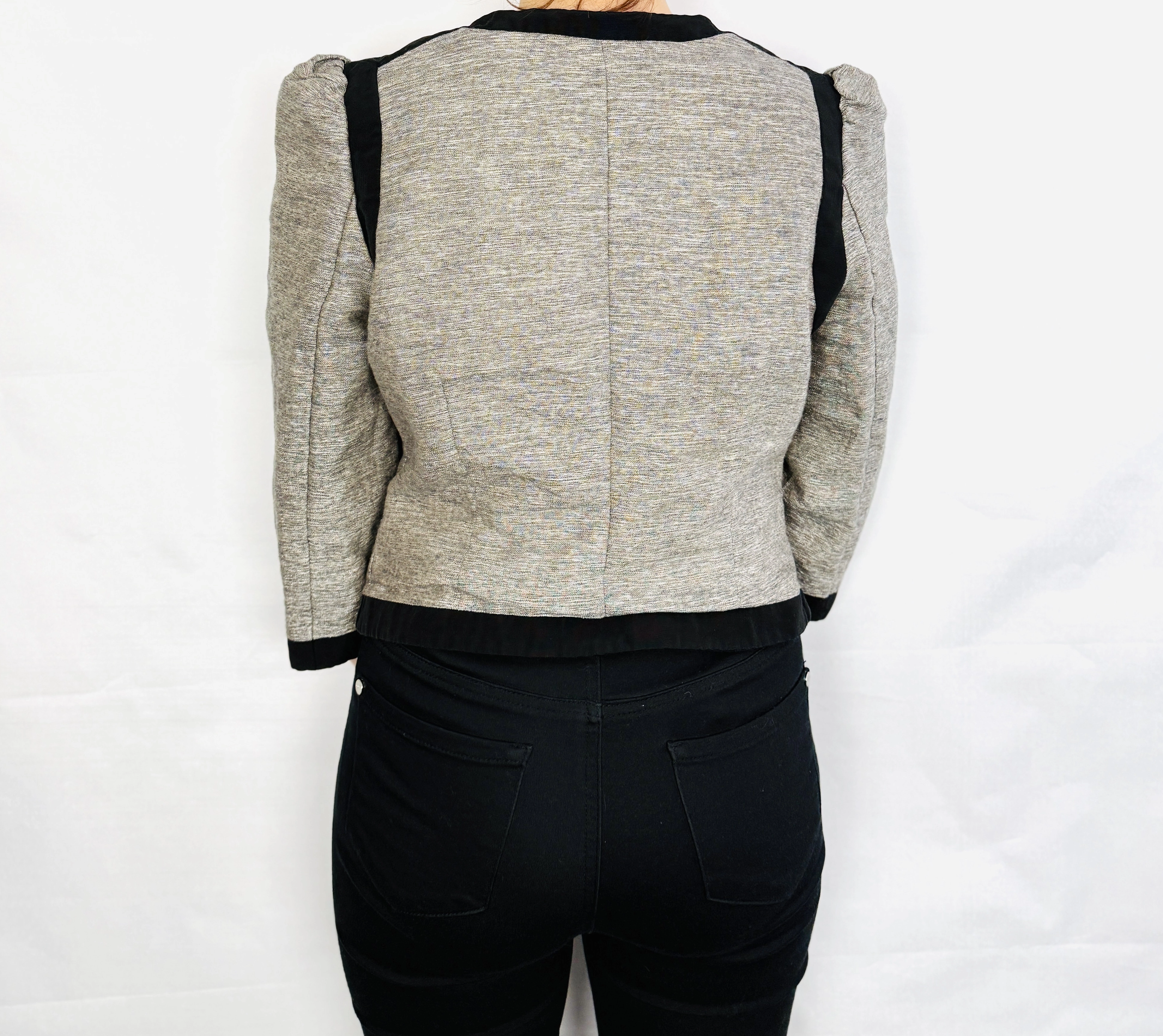 Szczególną uwagę zwracają rękawy o długości trzy czwarte, które zostały wykończone szerokimi, czarnymi mankietami. Ramiona są delikatnie zaznaczone subtelnymi bufkami, co dodaje projektowi kobiecej objętości i buduje nowoczesną linię ramion, balansując proporcje sylwetki. Materiał żakietu jest nieco grubszy i trzymający formę, o wyraźnym, melanżowym splocie, który nadaje mu głębi i sprawia, że produkt wygląda na bardzo solidny. Czarne wstawki przy dekolcie, wzdłuż zapięcia oraz przy imitacjach kieszeni na dole tworzą spójną, graficzną kompozycję, która przyciąga wzrok i podkreśla wysoką jakość wykonania.