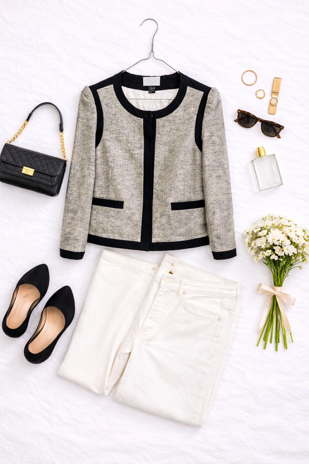 Ten beżowy żakiet to kwintesencja paryskiego szyku i ponadczasowej elegancji, która w subtelny sposób nawiązuje do estetyki retro. Melanżowa tkanina w odcieniach ciepłego beżu i szarości tworzy szlachetną bazę, którą przełamują wyraziste, czarne wykończenia. To projekt, który emanuje klasą i wyrafinowaniem, idealnie wpisując się w garderobę kobiety ceniącej ubrania z charakterem, które nigdy nie wychodzą z mody. Żakiet łączy w sobie strukturalną formę z kobiecymi detalami, tworząc całość, która jest jednocześnie profesjonalna, elegancka i niezwykle stylowa.