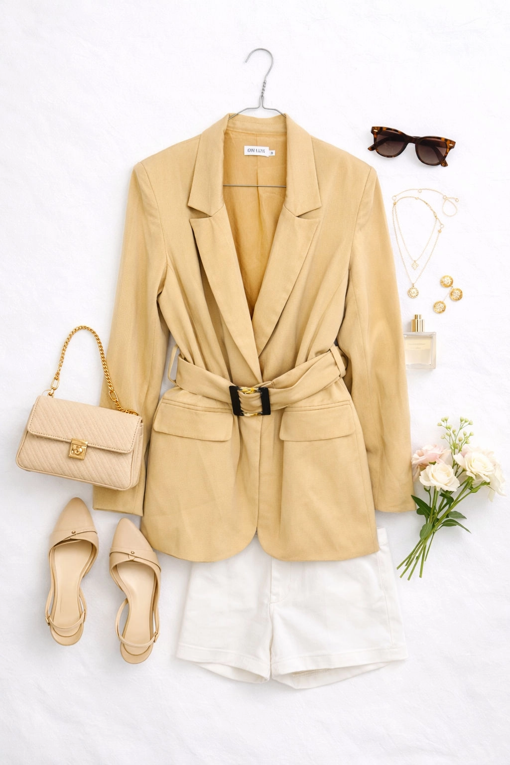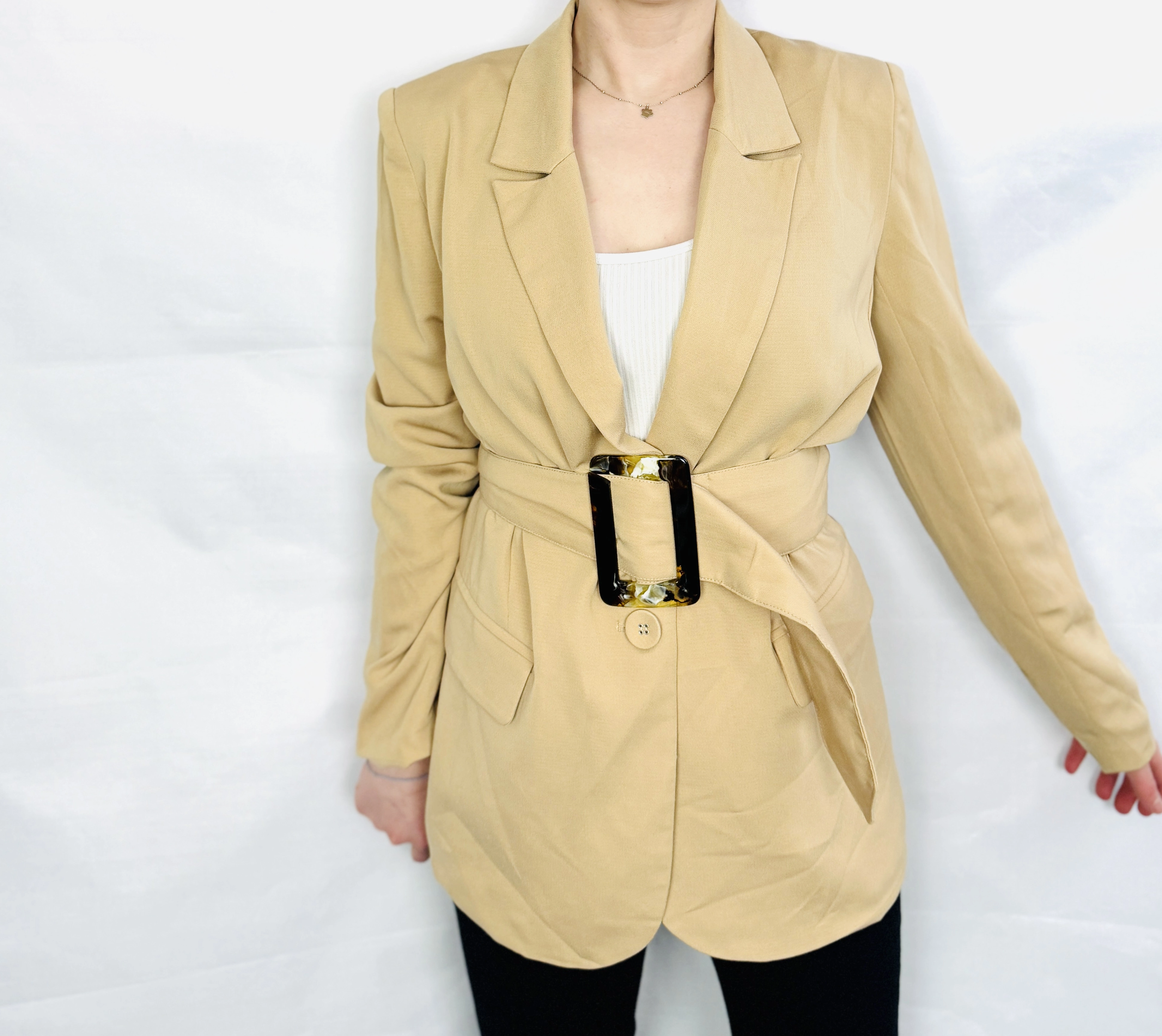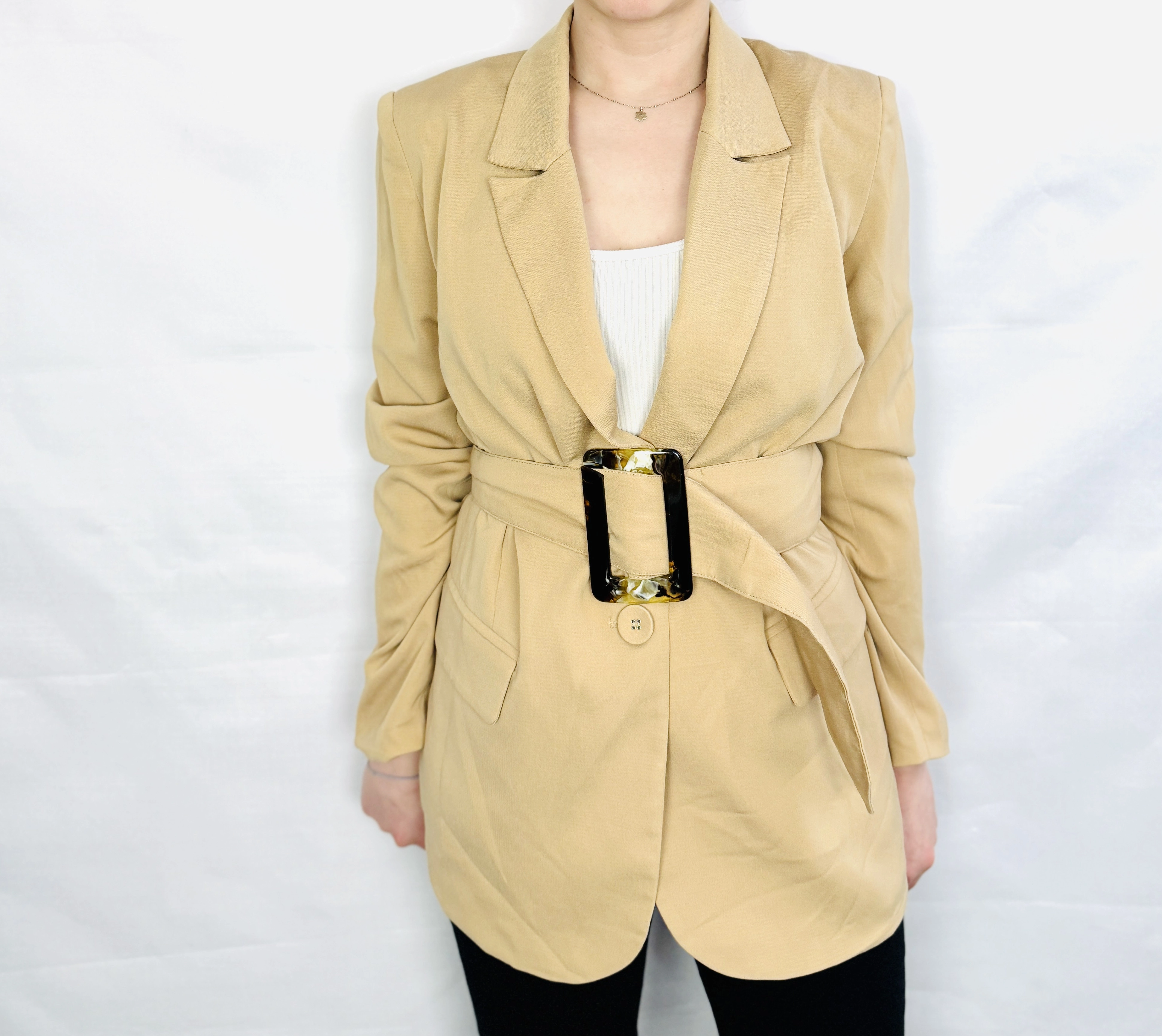 W kwestii stylizacji beżowy żakiet oferuje ogromną wszechstronność i elegancję. Na co dzień stworzy bezbłędny duet z dopasowanymi czarnymi spodniami i prostym topem, co pozwoli w pełni wyeksponować jego unikalny krój i ozdobną klamrę. Do pracy można zestawić go z białą koszulą i eleganckimi cygaretkami, tworząc look pełen profesjonalizmu. Beżowy kolor fantastycznie komponuje się z czernią, bielą, a także z wszelkimi odcieniami brązu, kremu czy granatu. Na wieczorne wyjście żakiet zaprezentuje się zjawiskowo narzucony na dopasowaną sukienkę, tworząc zestaw pełen szyku, który sprawdzi się podczas oficjalnych kolacji czy uroczystości rodzinnych.