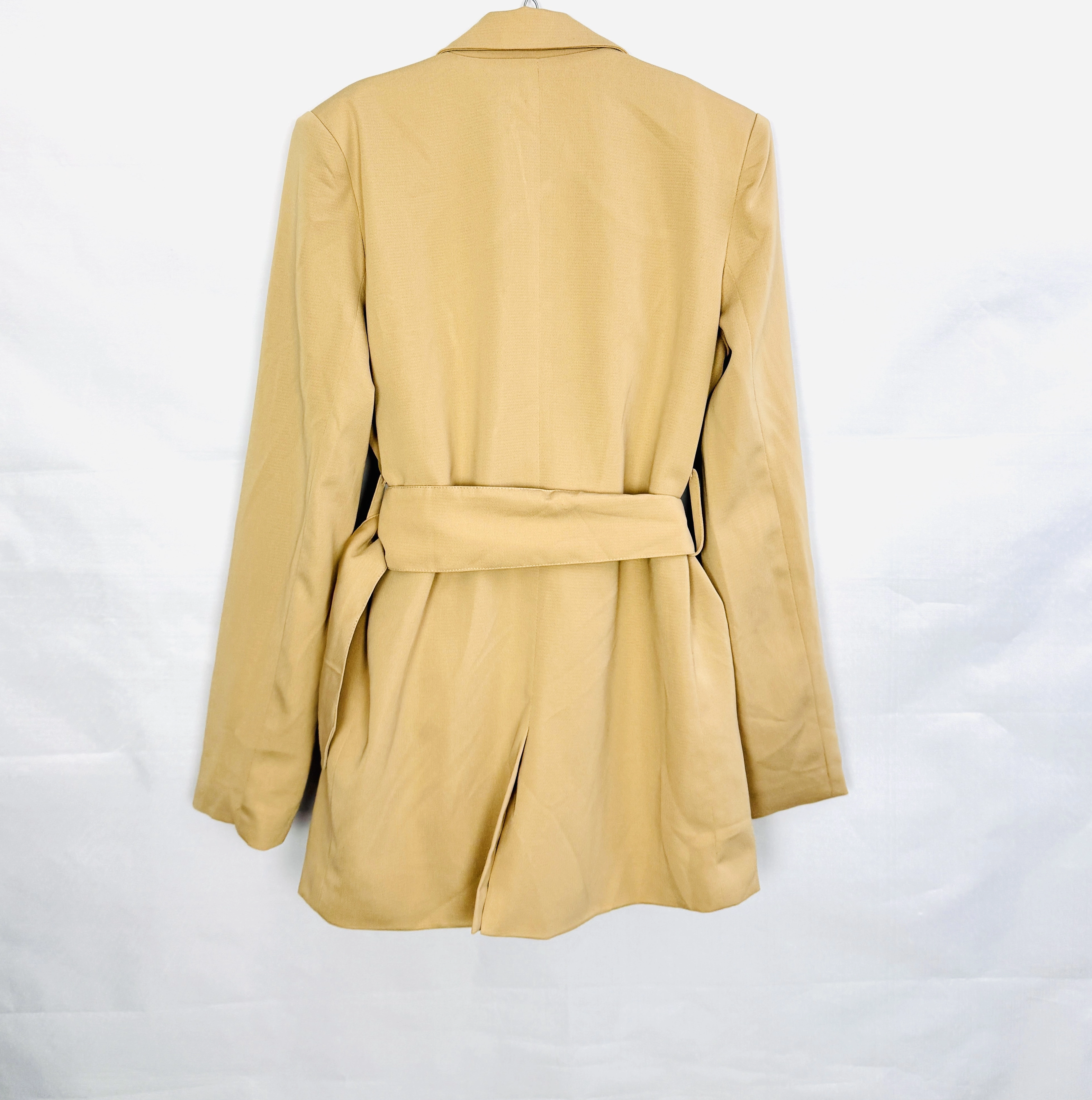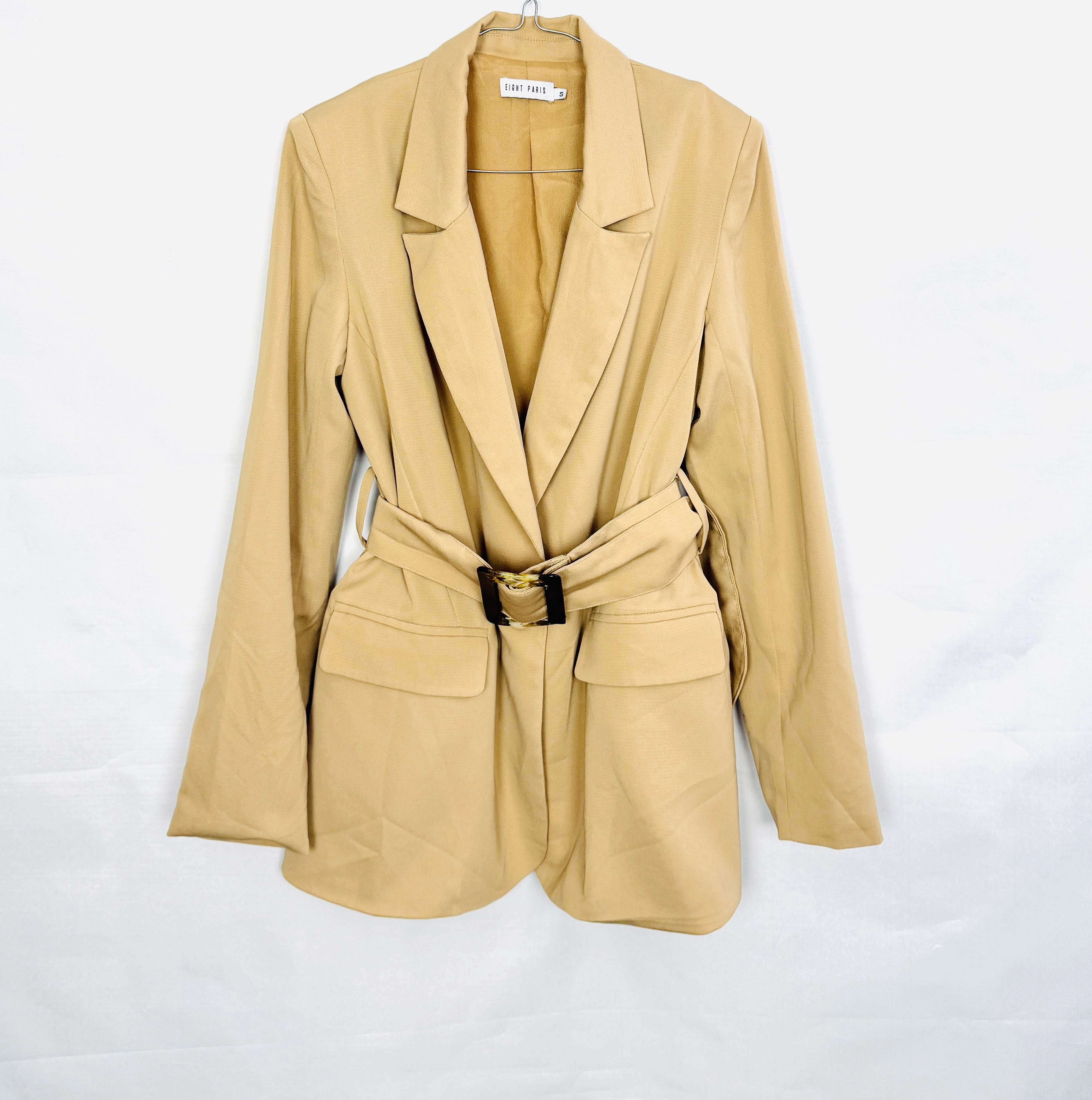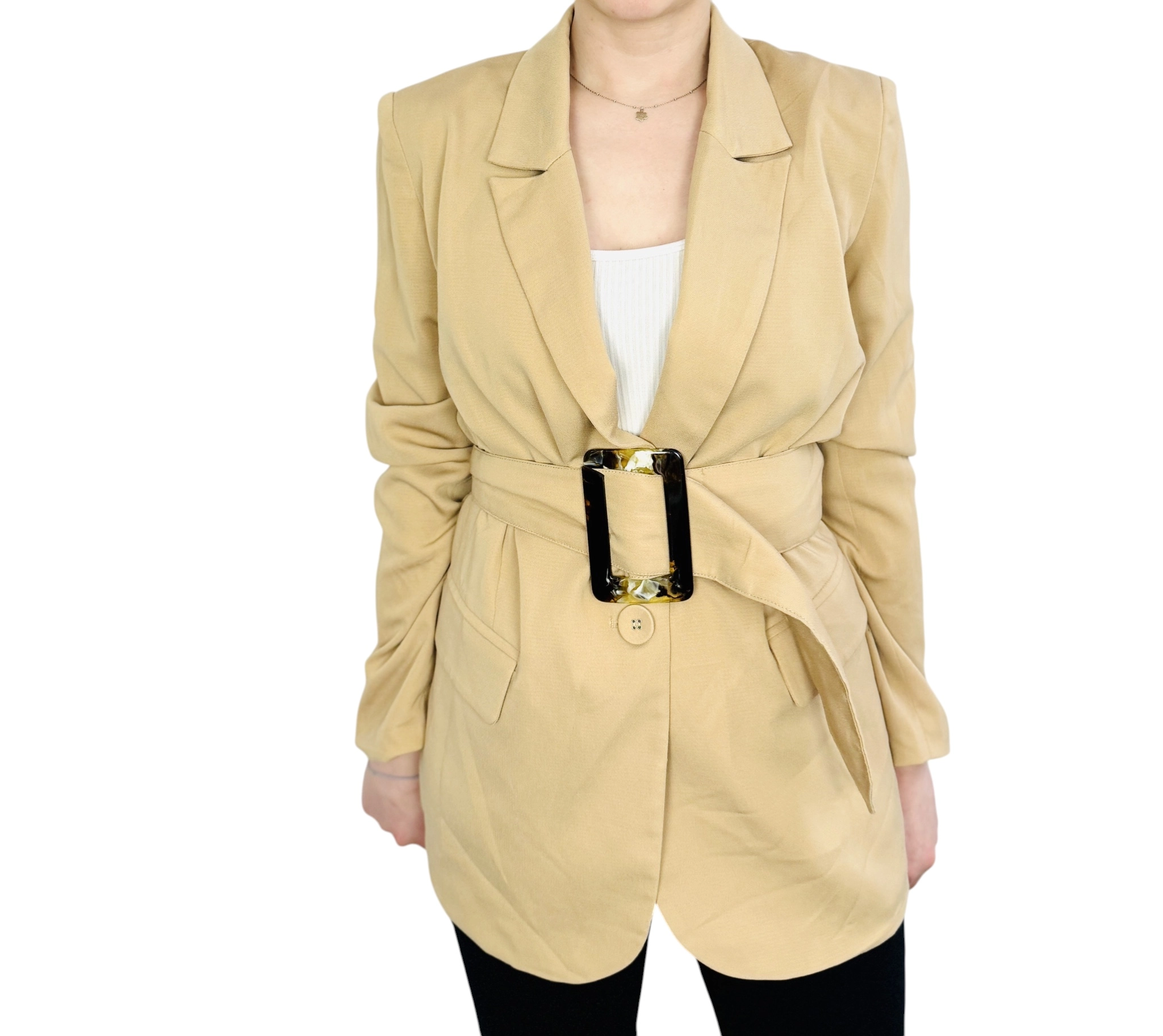 Ten beżowy żakiet to kwintesencja nowoczesnej elegancji, która w mistrzowski sposób łączy klasyczny biurowy szyk z najnowszymi trendami podkreślającymi kobiecą sylwetkę. Jasny, piaskowy odcień tkaniny nadaje całości szlachetnego wyrazu i sprawia, że ubranie staje się niezwykle uniwersalną bazą dla wielu stylizacji. To projekt, który emanuje profesjonalizmem, a jednocześnie zachowuje lekkość i świeżość, dzięki czemu sprawdzi się w sytuacjach wymagających nienagannego wyglądu, jak i podczas mniej formalnych spotkań. Żakiet wprowadza do garderoby powiew luksusu i sprawia, że każda kobieta poczuje się w nim pewnie i stylowo.