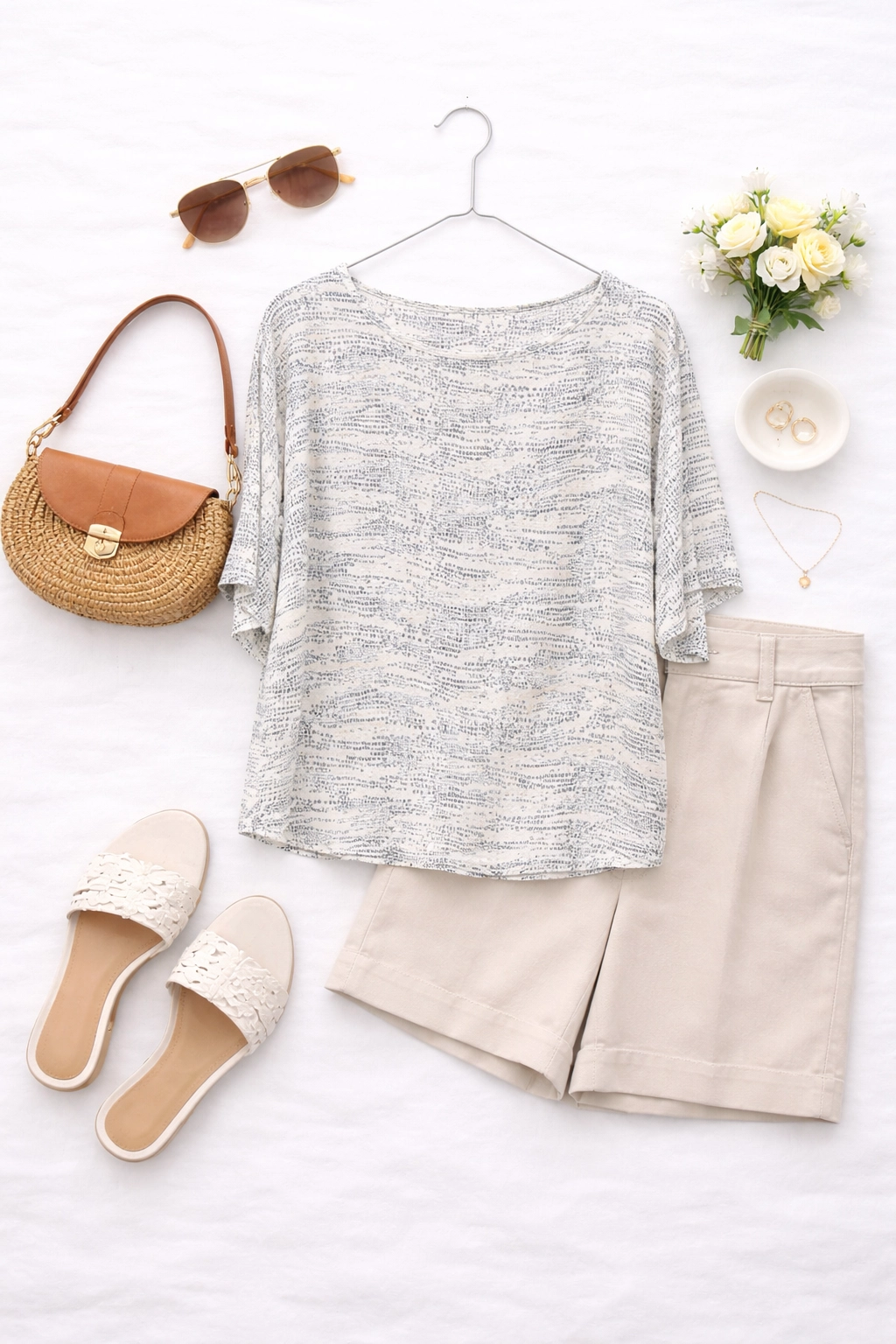 Krój korzystnie wpływa na proporcje sylwetki: luźniejsza linia tułowia dyskretnie maskuje okolice brzucha i bioder, a prosty dekolt optycznie równoważy górę ciała. Krótsze rękawy odsłaniają przedramiona, co może optycznie wysmuklać linię ramion, podczas gdy długość do bioder pozwala na swobodne zakładanie bluzki zarówno na spodnie o wysokim stanie, jak i do spódnicy. Ten fason dobrze sprawdzi się u sylwetek prostokąt i gruszka, którym doda lekkości i subtelnego kształtu.