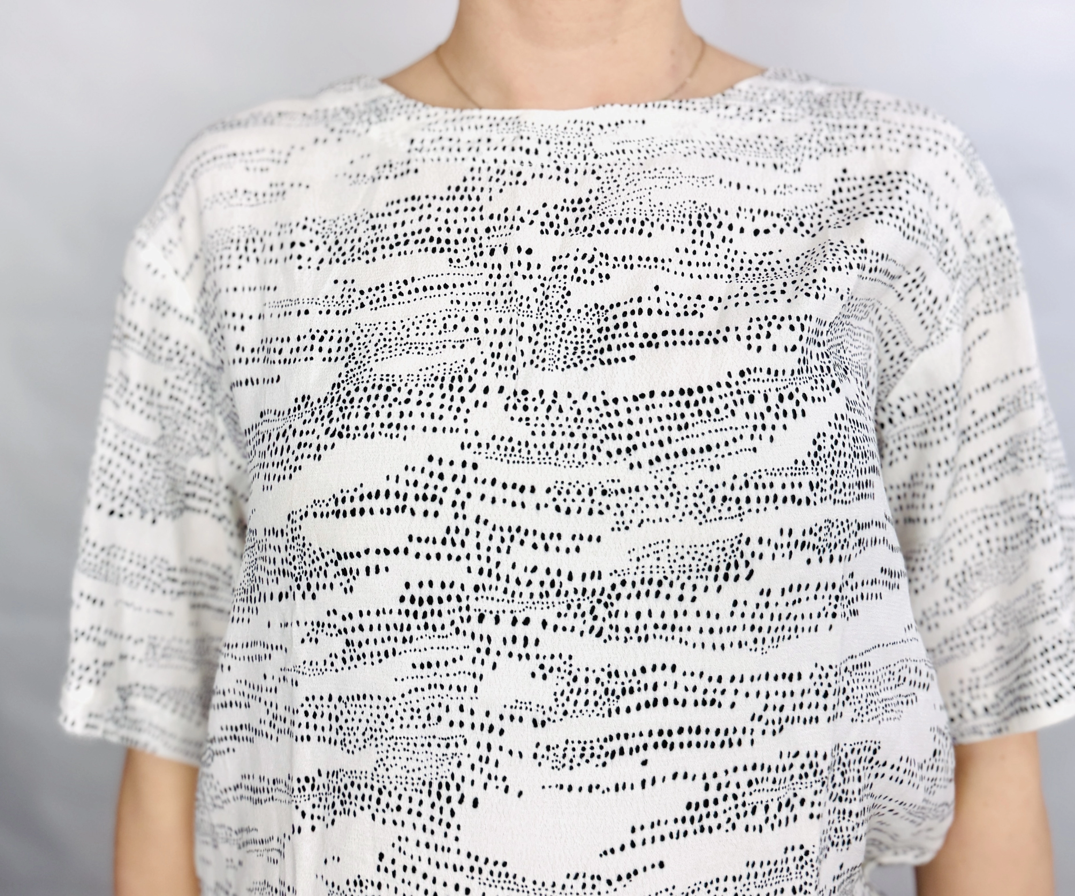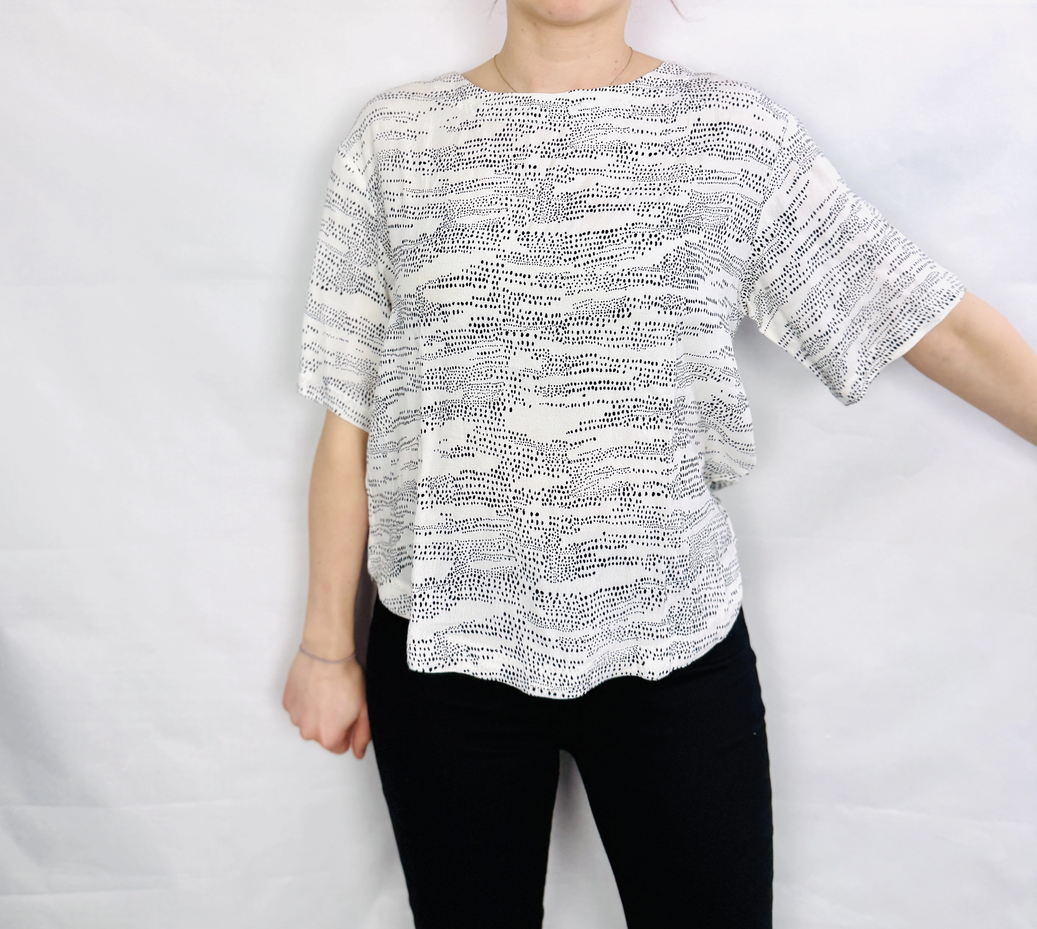 Krój bluzki jest luźny i swobodny, o prostokątnej linii tułowia, dzięki czemu góra delikatnie opływa sylwetkę i daje poczucie wygody. Dekolt ma łagodną, okrągłą formę osadzoną blisko szyi, co nadaje projektowi uporządkowanego i klasycznego wyrazu. Rękawy są krótkie, sięgające mniej więcej do połowy ramienia, prowadzone w szerokiej, swobodnej linii, co dodaje bluzce lekkości i pozwala na naturalny ruch. Długość tułowia kończy się w okolicy bioder, co czyni model uniwersalnym wobec wielu fasonów spodni i spódnic.