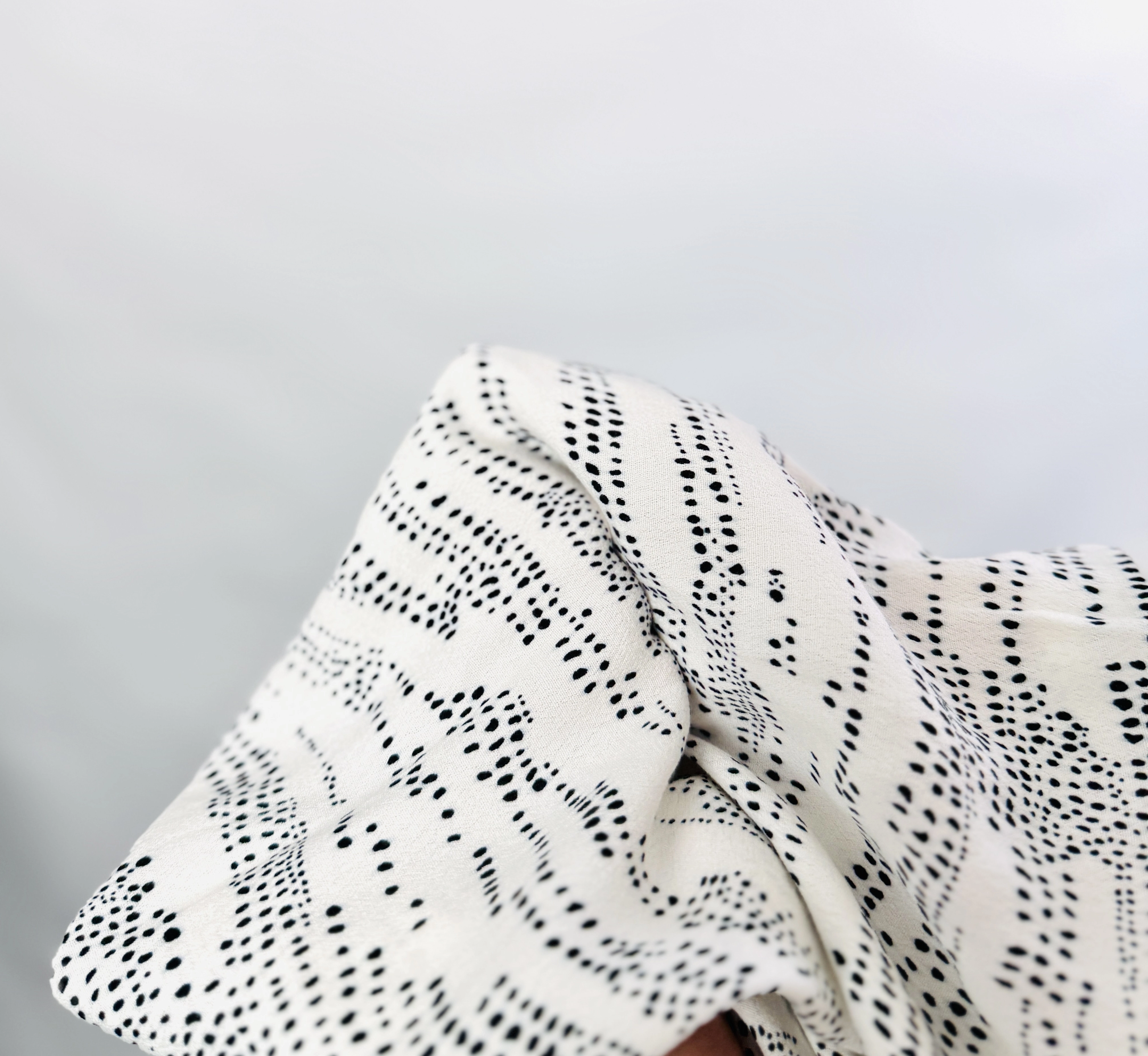 Wzór to drobne, punktowe i liniowe formy rozmieszczone nieregularnie, tworzące subtelny, organiczny rytm na całej powierzchni tkaniny. Materiał wygląda na delikatnie lejący i miękko układający się, z subtelną fakturą, która potęguje wrażenie płynności i lekkości. Powierzchnia tkaniny daje efekt gładkości z nieco matowym finiszem, co sprawia, że wzór zachowuje elegancki charakter, nie przytłaczając formy. Wykończenia brzegu są dyskretne i schludne, podkreślając minimalistyczny charakter projektu.