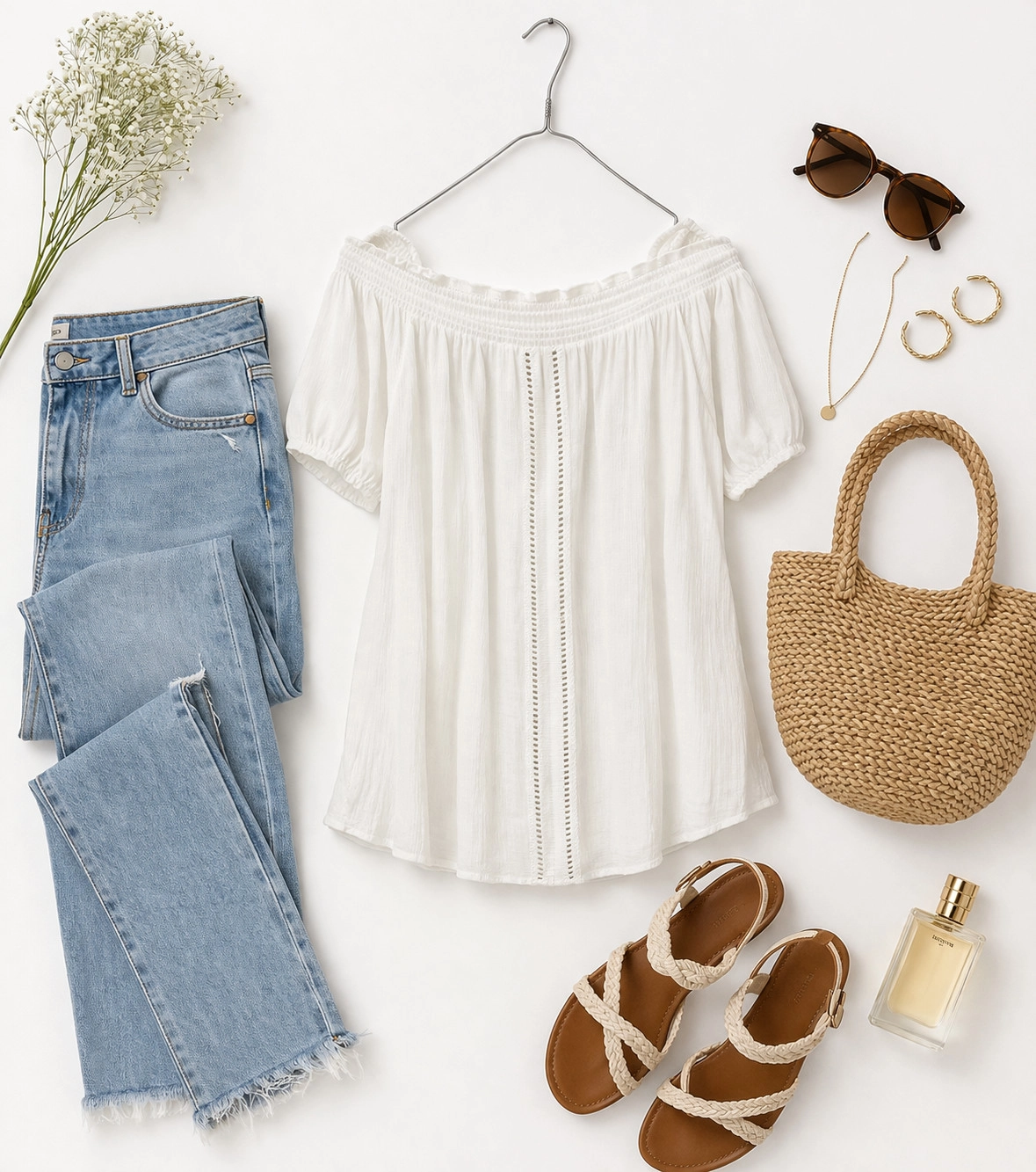 Fason bluzki wyróżnia się szerokim, elastycznym dekoltem typu hiszpanka, który delikatnie odsłania ramiona, nadając sylwetce lekkości i subtelnej zmysłowości. Dekolt wykończony jest delikatną falbanką, która miękko otula szyję i ramiona, tworząc romantyczny efekt. Krótkie rękawy mają luźny krój, co dodatkowo podkreśla swobodny charakter ubrania. Dół bluzki jest prosty i sięga do linii bioder, pozwalając na różnorodne stylizacje – zarówno luźne, jak i wpuszczone do spodni.