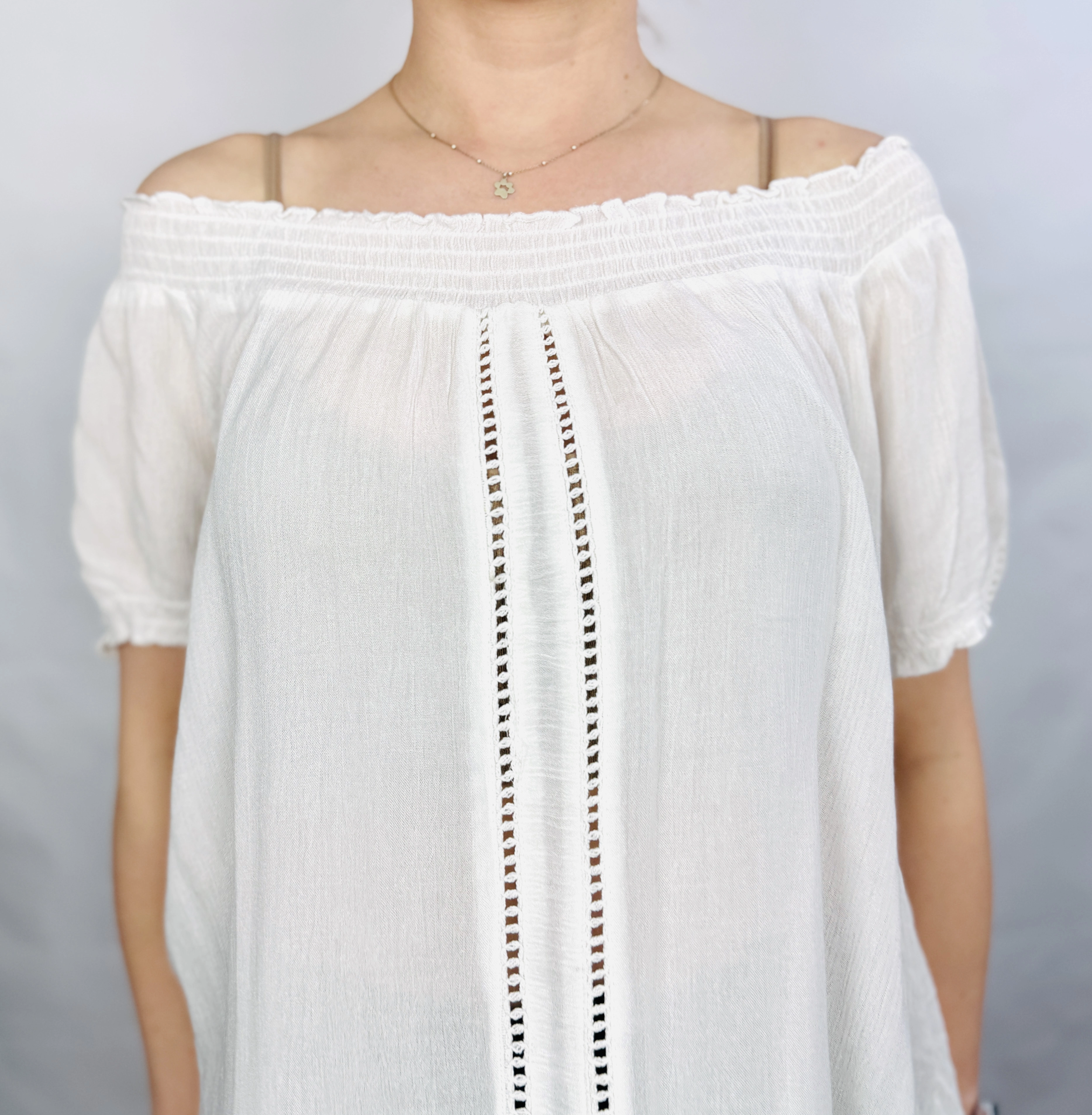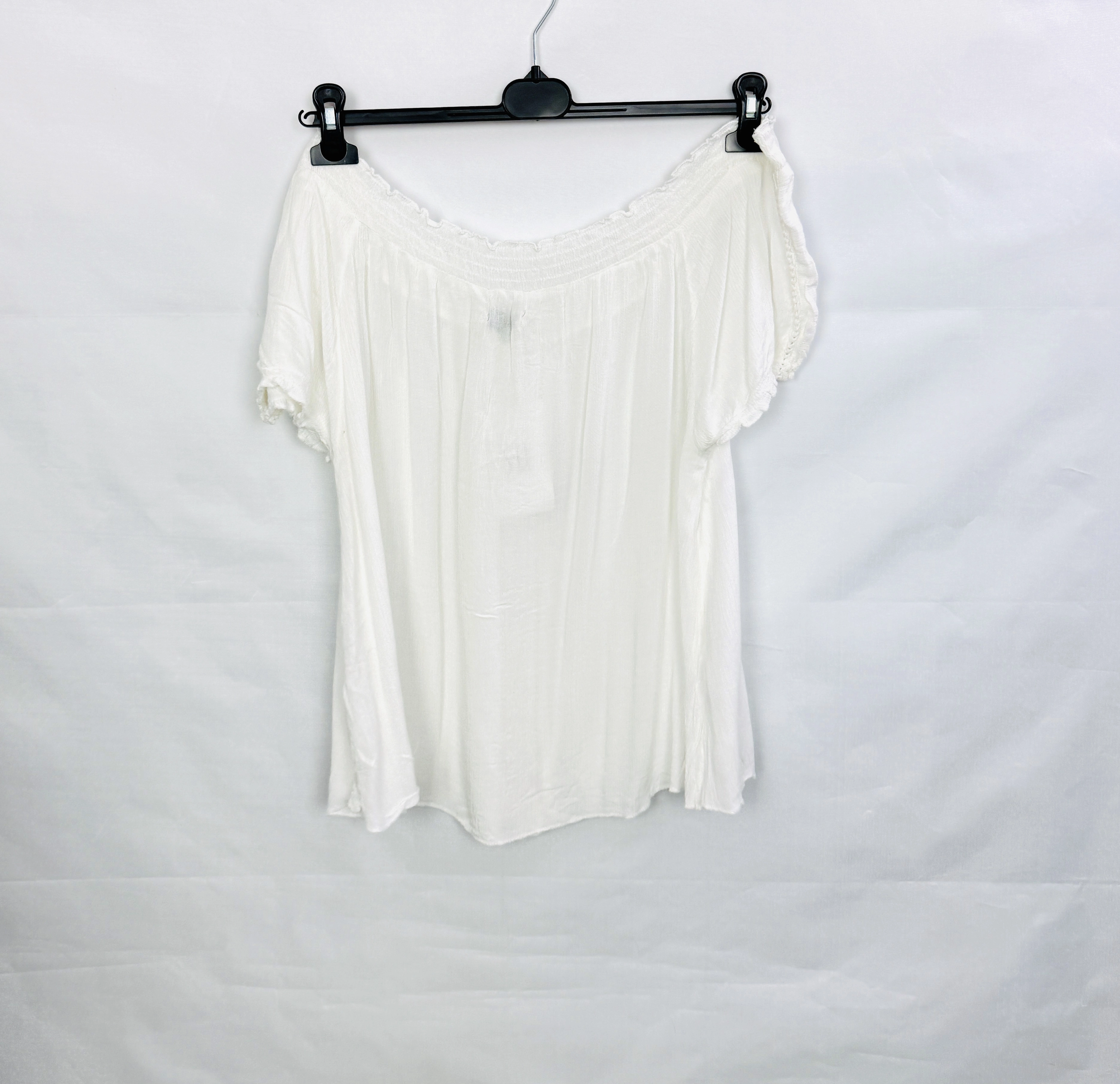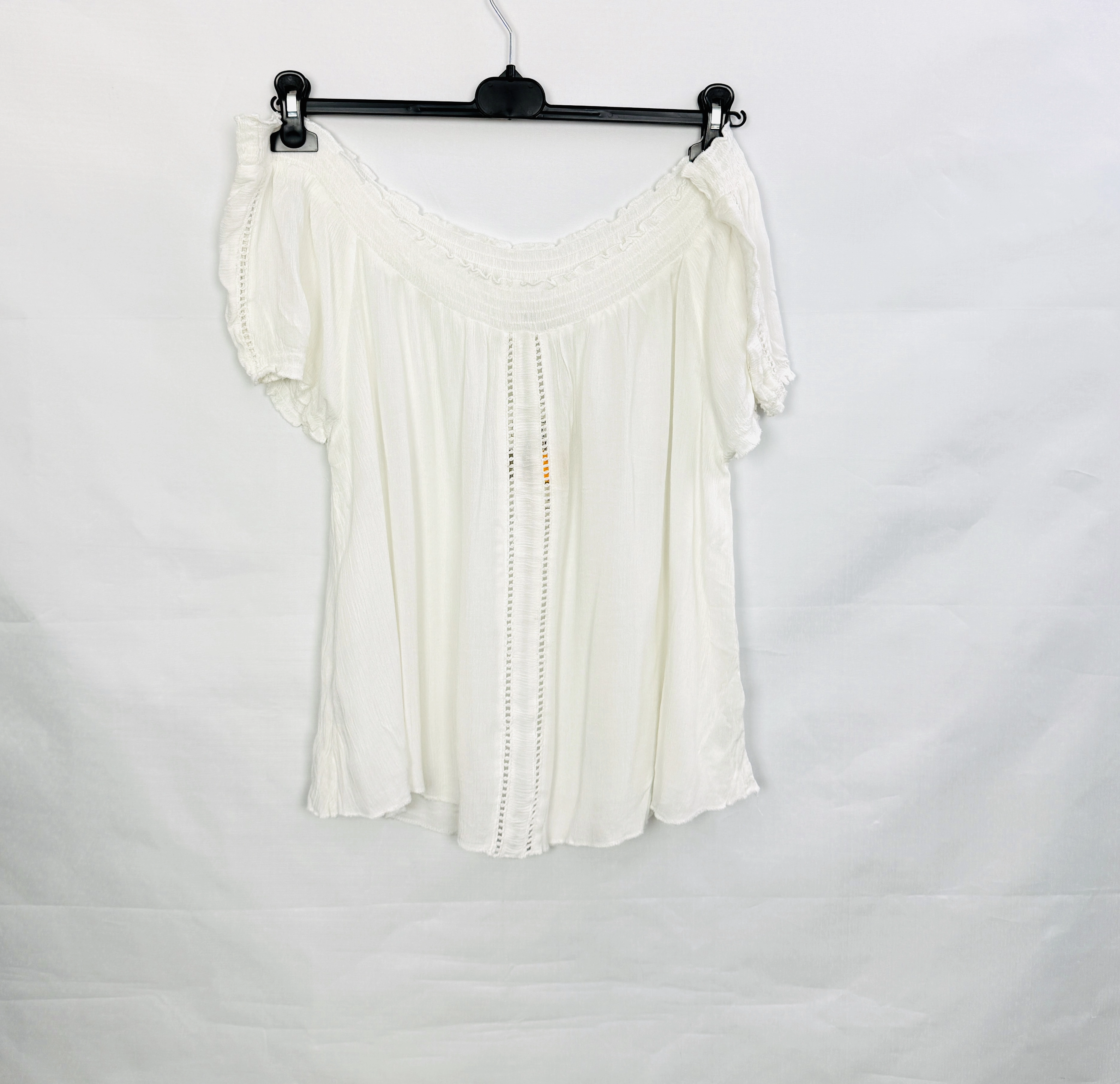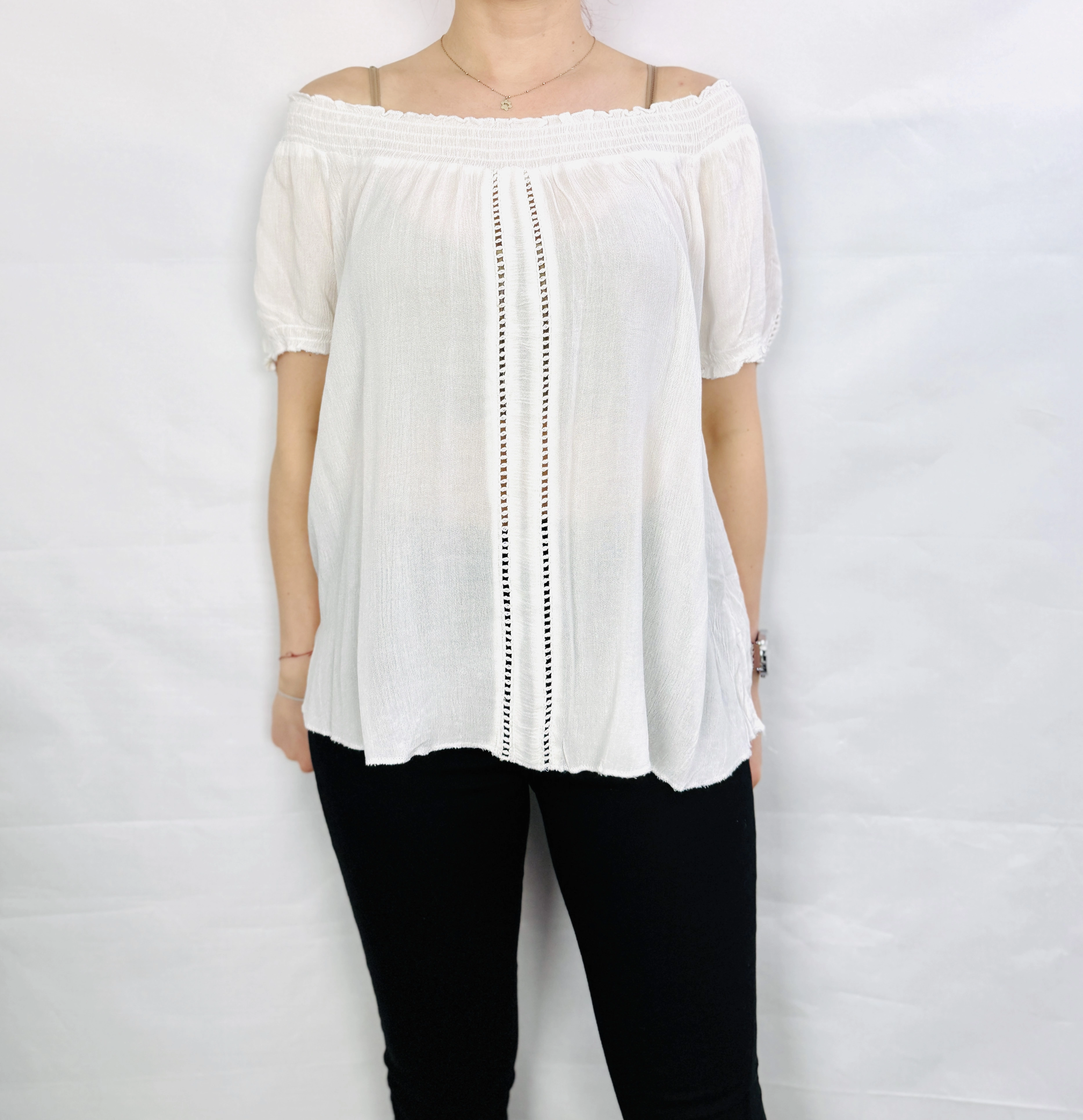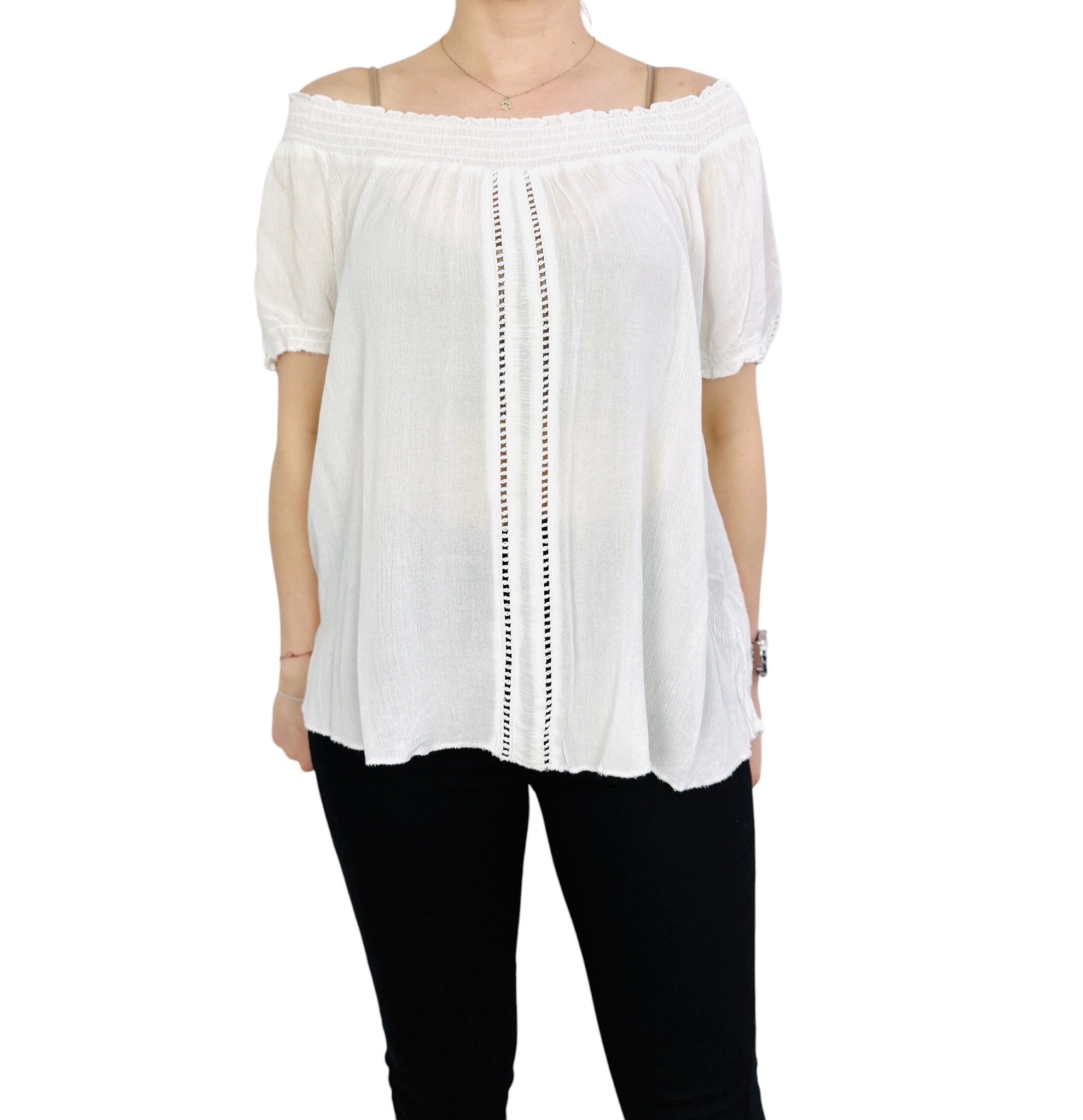 Biała cienka bluzka hiszpanka z ażurowym zdobieniem M 38