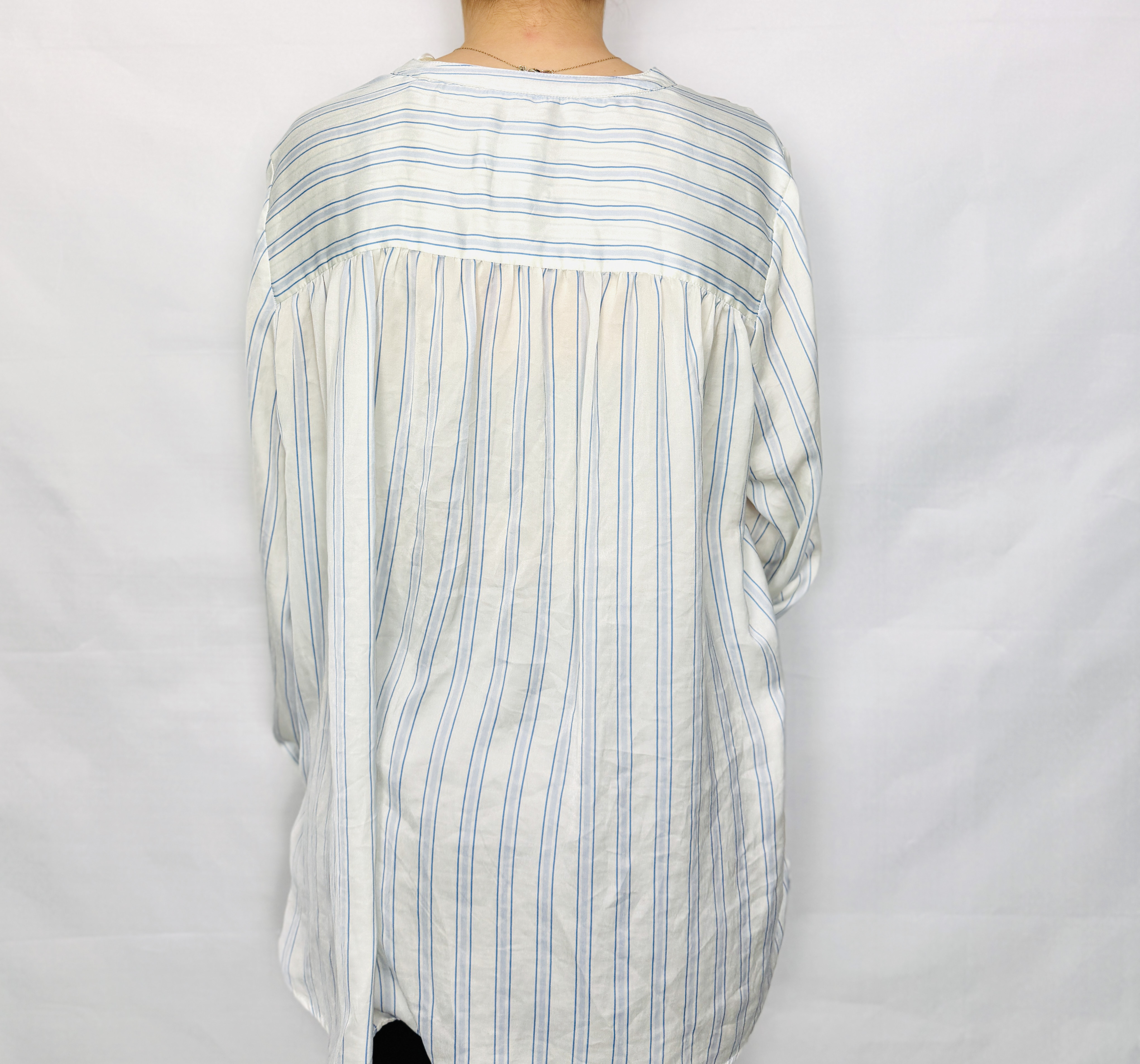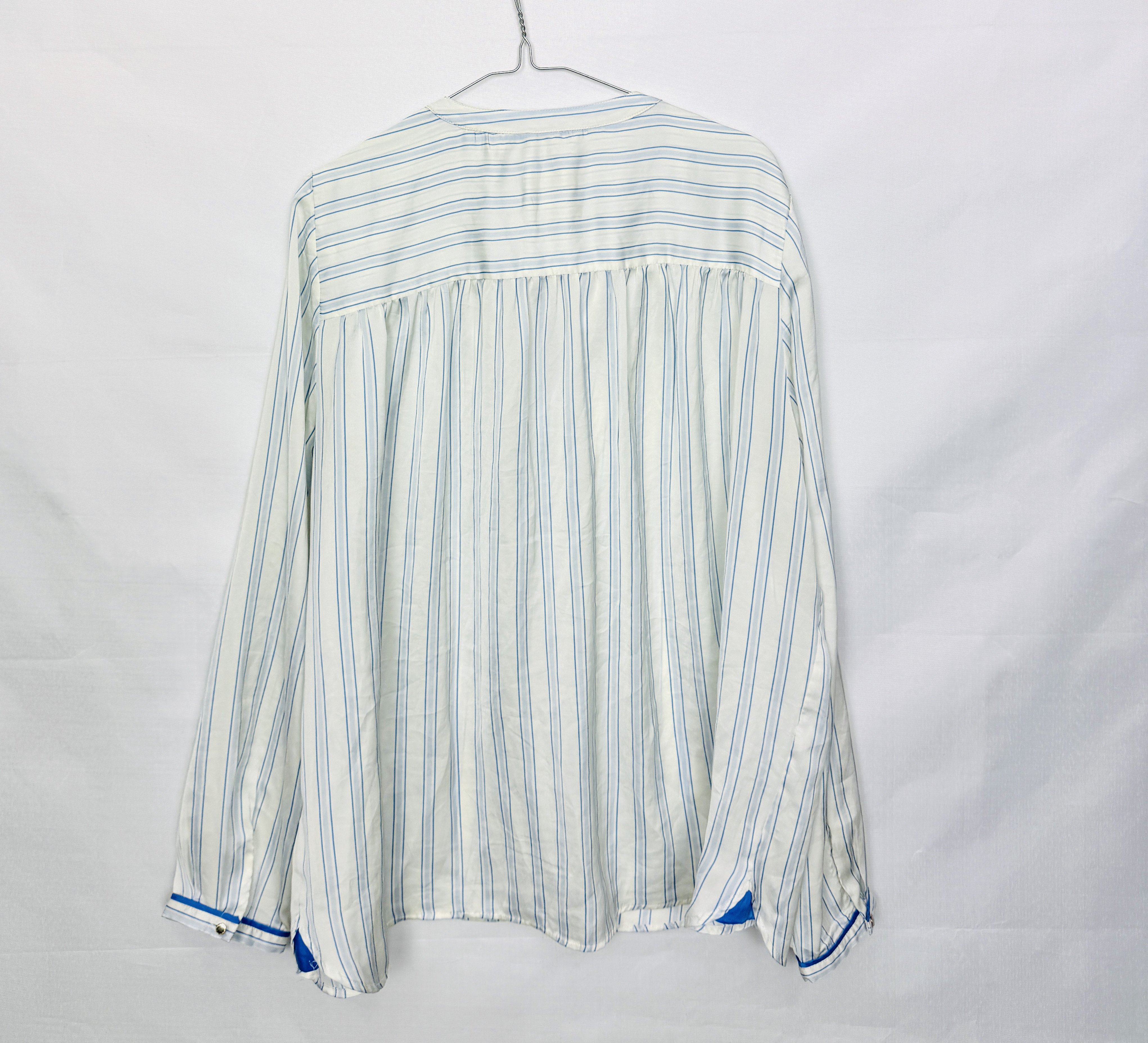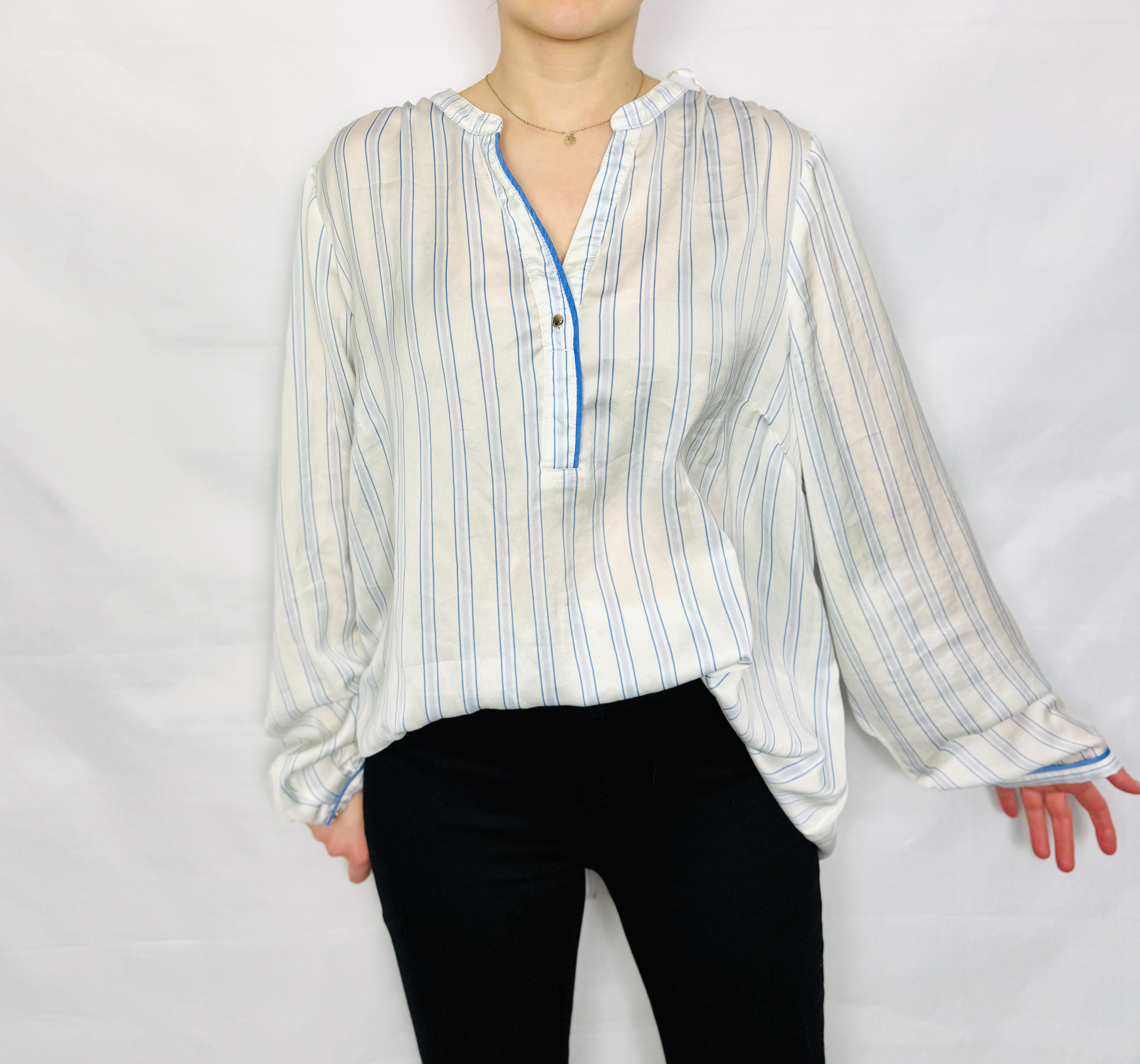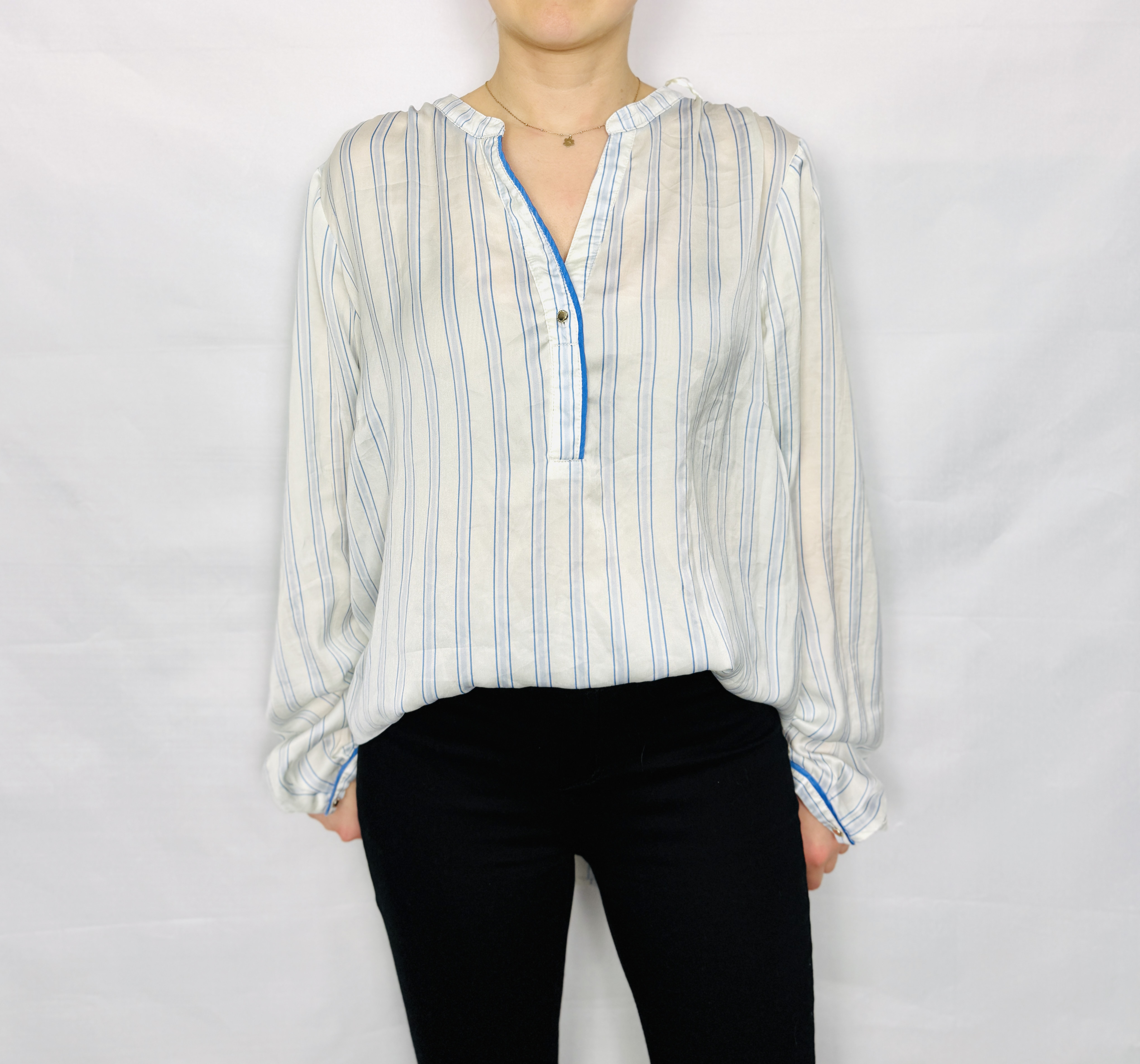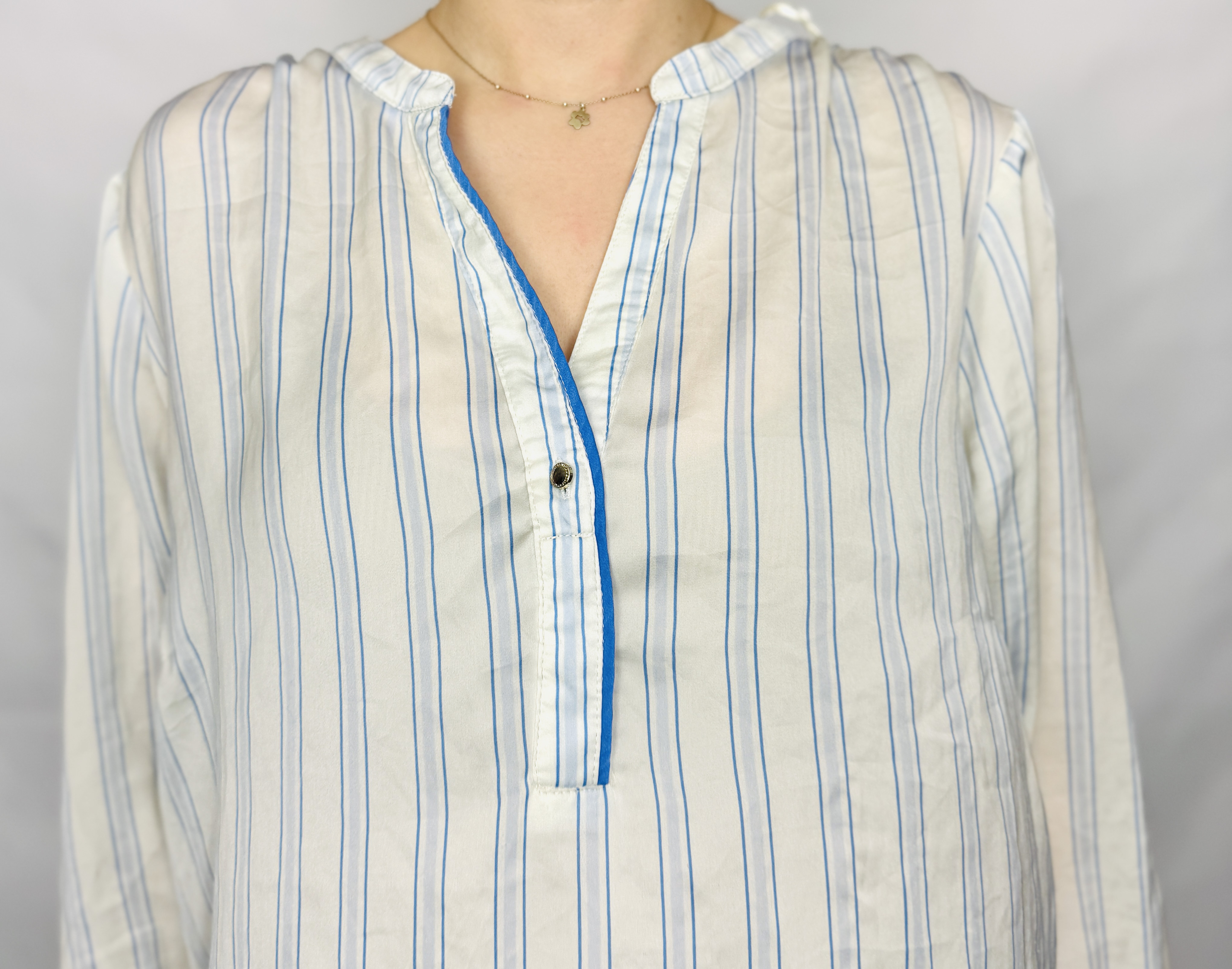 Krój jest luźniejszy, o lekko pudełkowej, swobodnej sylwetce, dzięki czemu zapewnia komfort i swobodę ruchu. Dekolt tworzy subtelna stójka z delikatnym marszczeniem oraz szersze wycięcie w kształcie litery V, wykończone kontrastową, błękitną lamówką przy listwie zapinanej pojedynczym guzikiem — to dyskretny detal, który dopełnia całość i przyciąga oko. Rękawy są długie i szeroko skrojone, z delikatnym mankietem ozdobionym tym samym jasnoniebieskim akcentem, co plisa; ich lekko bufiasty kształt dodaje romantycznej miękkości i tworzy przyjemny ruch podczas noszenia. Długość sięga okolic bioder, co pozwala na noszenie bluzki wpuszczonej w spodnie lub lekko wyłożonej, zachowując naturalną, nieskrępowaną linię.