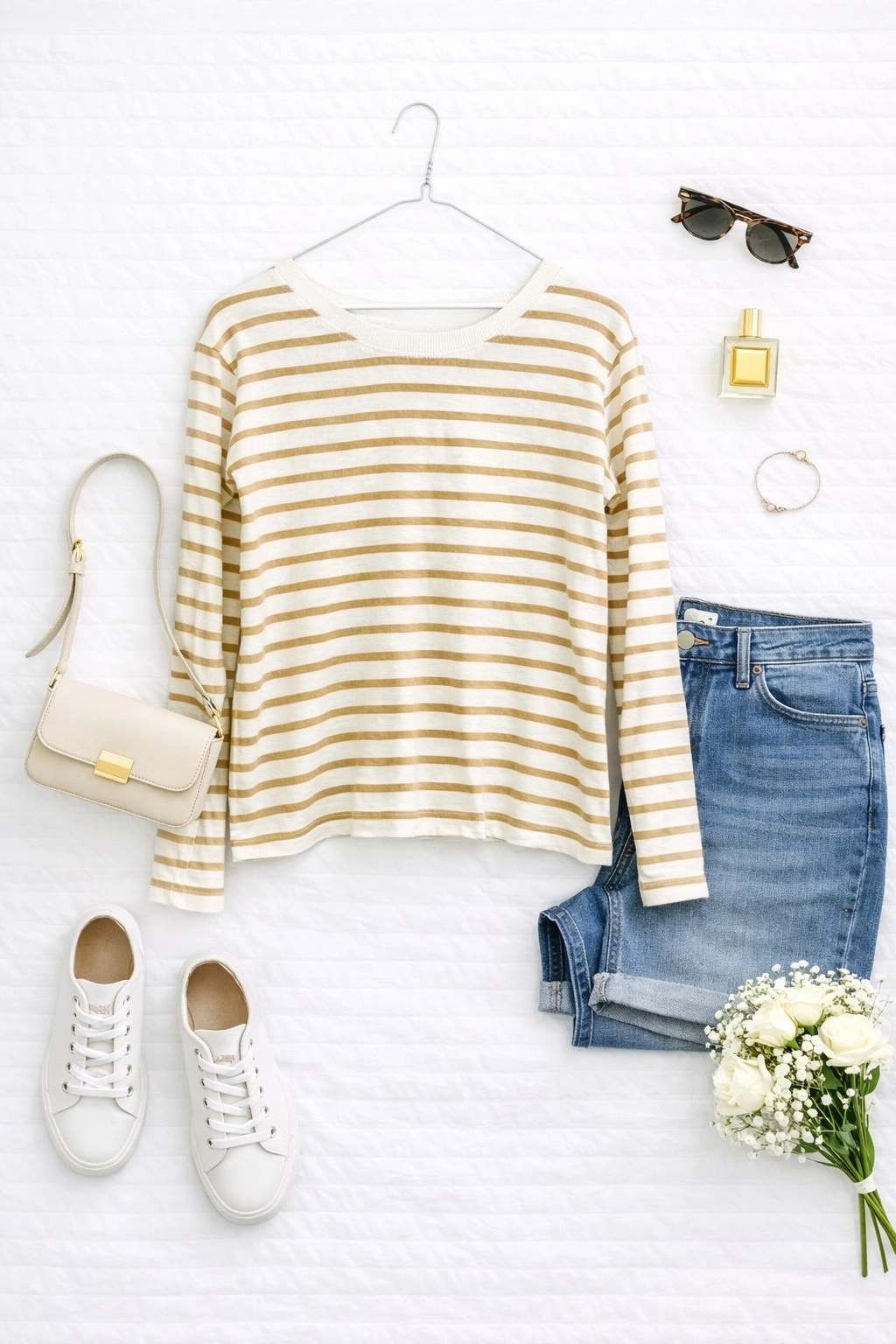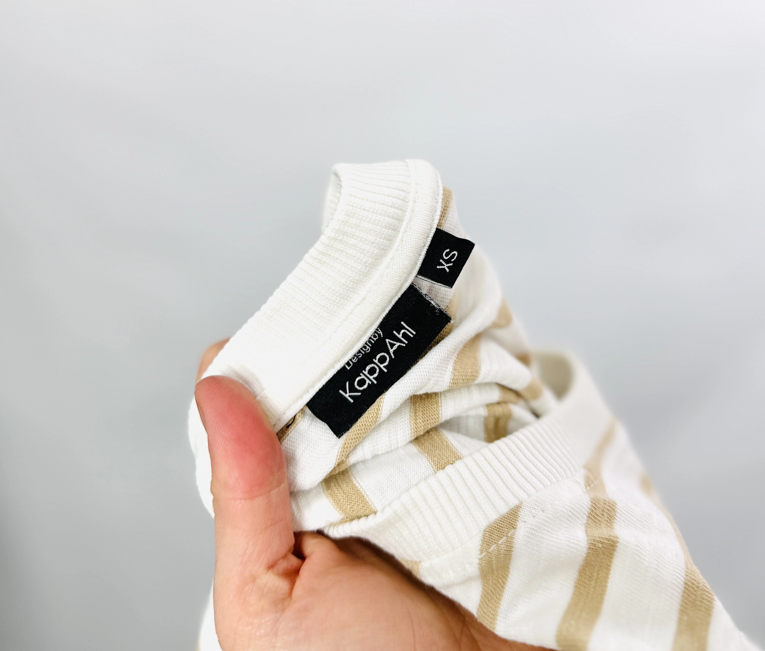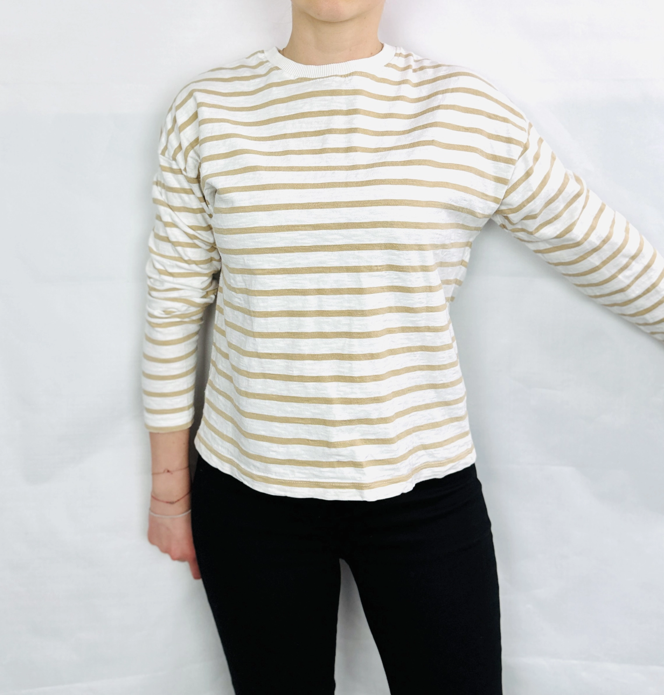 Długość bluzki sięga do bioder, co czyni ją niezwykle praktyczną i łatwą do stylizowania z różnymi fasonami spodni, spódnic czy szortów. Doskonale komponuje się zarówno z klasycznymi jeansami, jak i eleganckimi cygaretkami czy spódnicami ołówkowymi, tworząc stylizacje na wiele okazji – od codziennych spacerów, przez spotkania w pracy, aż po bardziej swobodne wyjścia ze znajomymi. Beżowo biały wzór pasków pozwala na łatwe łączenie z niemal każdą barwą, co daje nieograniczone możliwości tworzenia modnych zestawów.