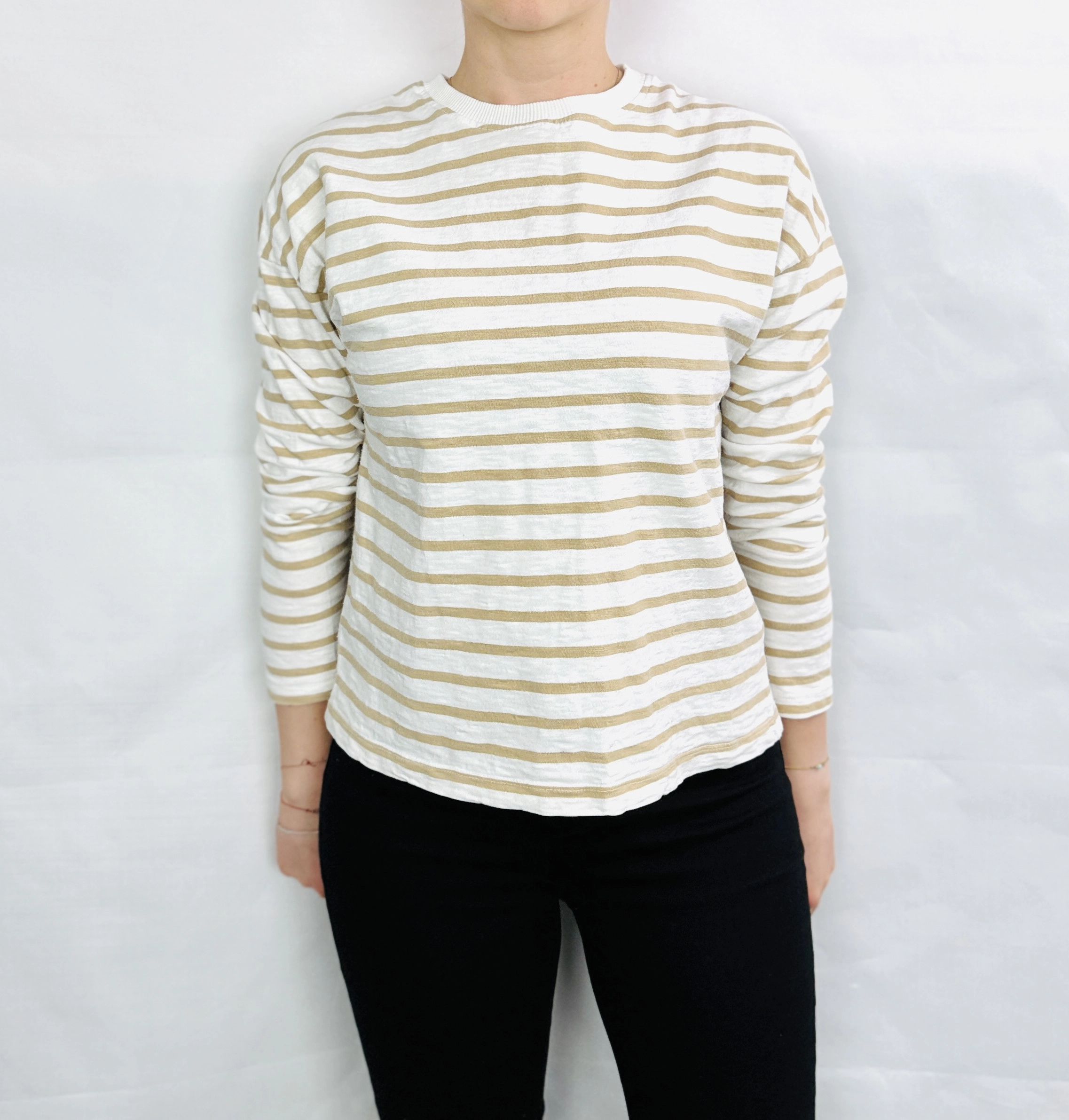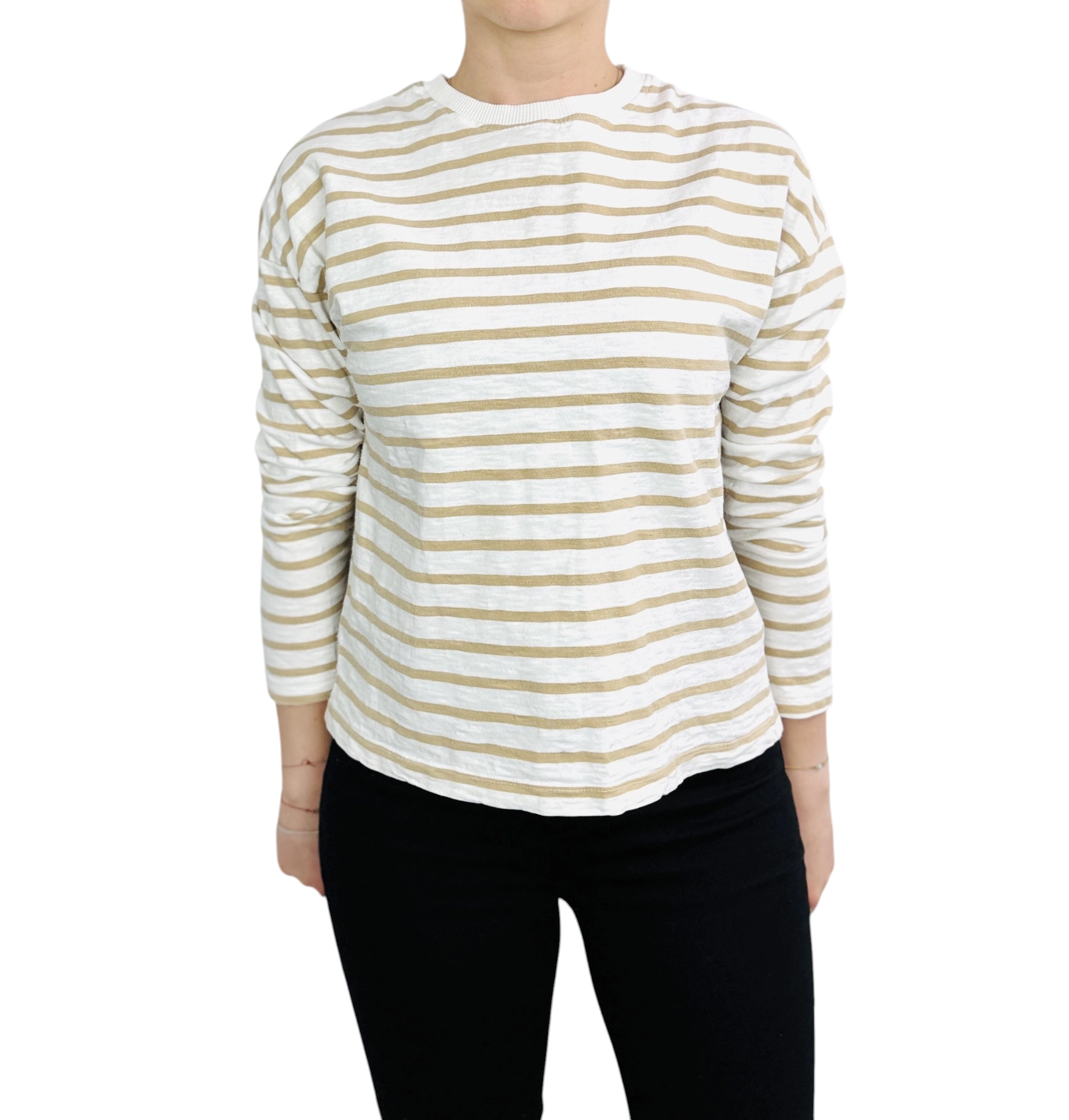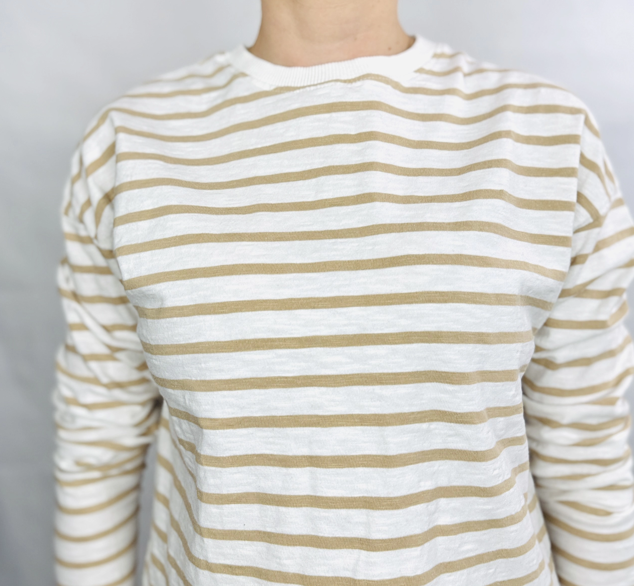 Ta biało beżowa bluzka to klasyka w nowoczesnym wydaniu, która łączy w sobie prostotę z subtelną elegancją i kobiecym wdziękiem. Delikatne, poziome paski w ciepłym odcieniu beżu na tle czystej bieli tworzą harmonijną i uniwersalną kompozycję, która doskonale wpisuje się w codzienne stylizacje, dodając im lekkości i świeżości. To ubranie, które emanuje naturalnością i ponadczasowym stylem, idealne dla kobiet ceniących sobie wygodę i modny wygląd.