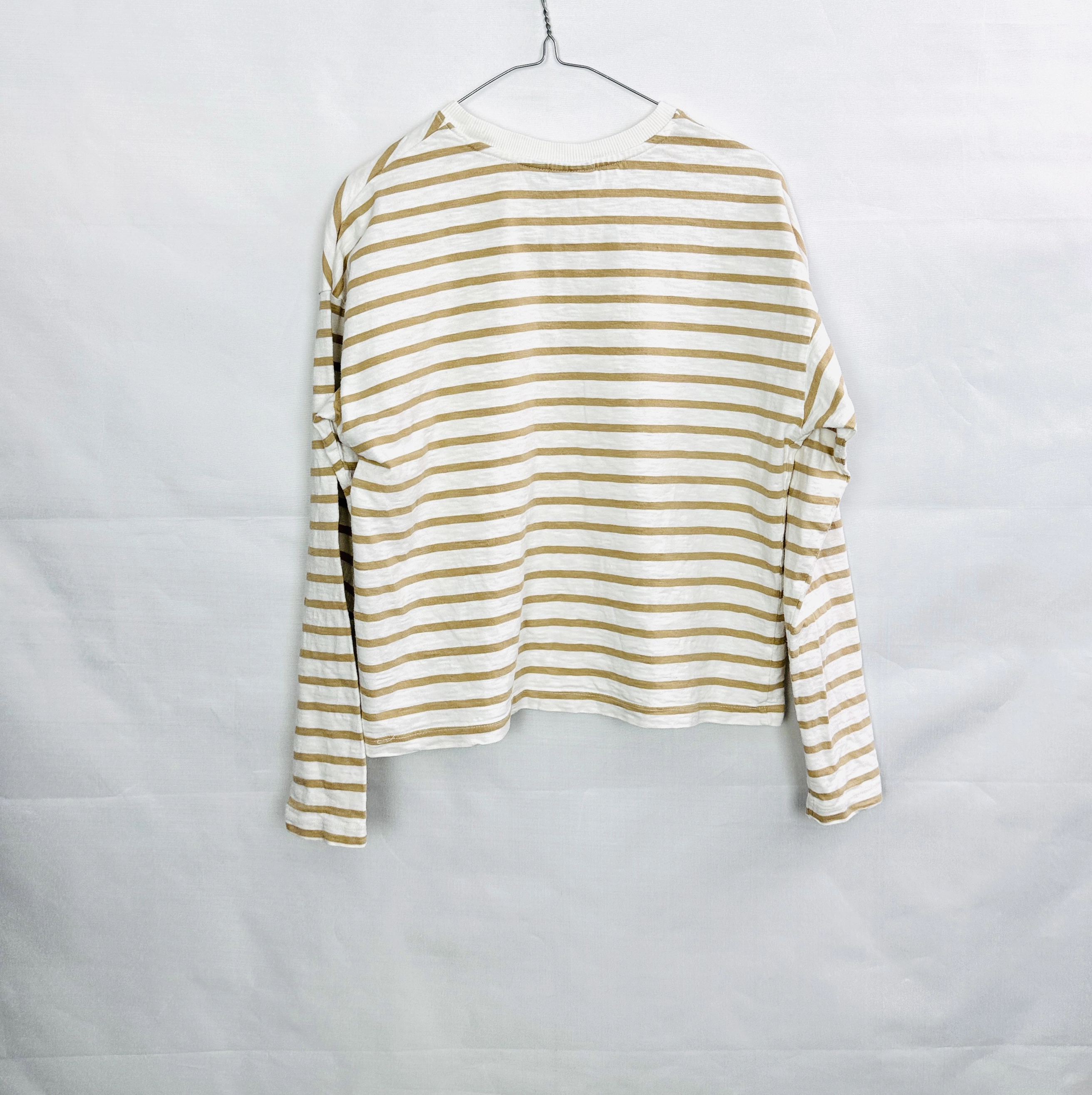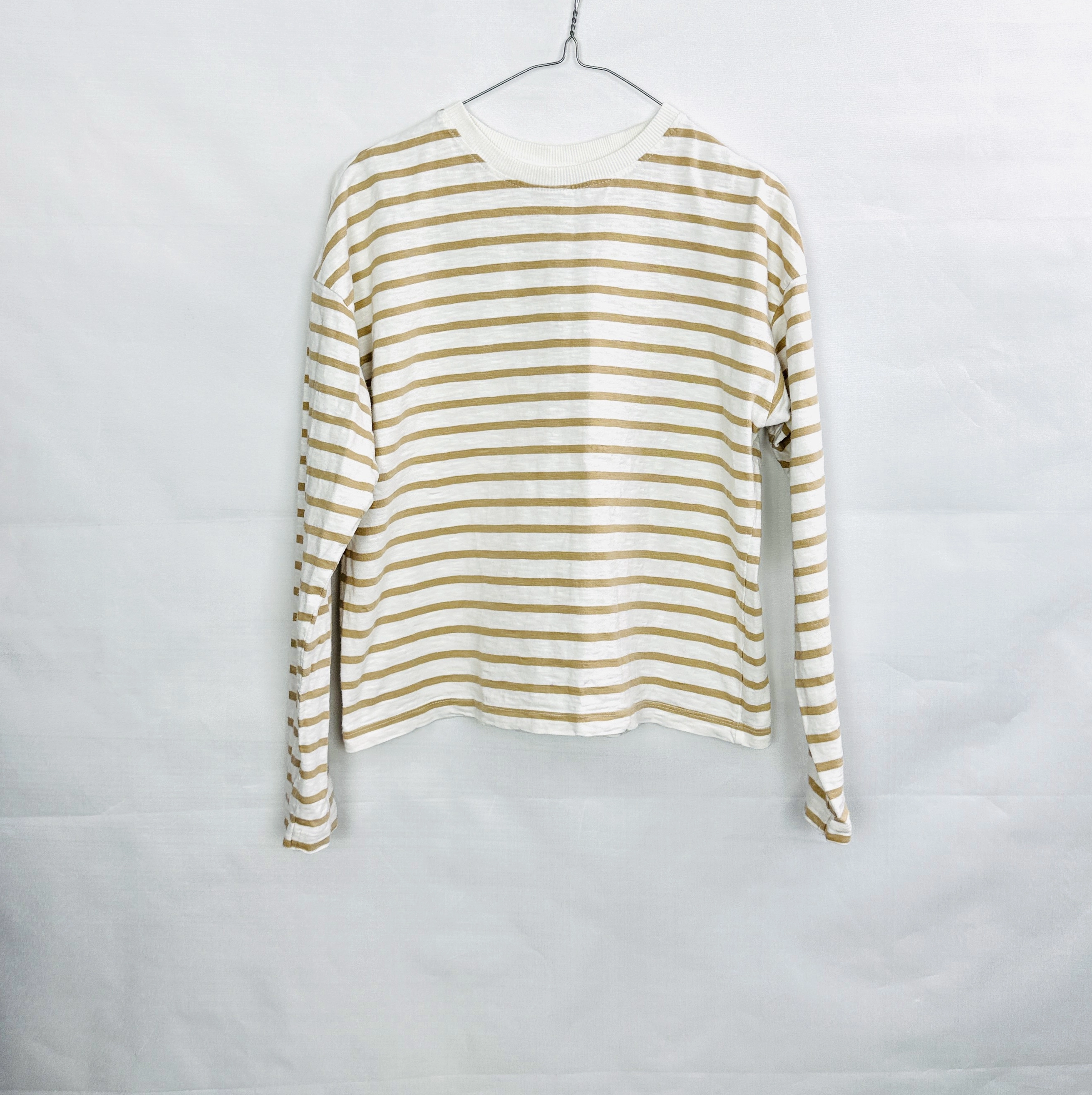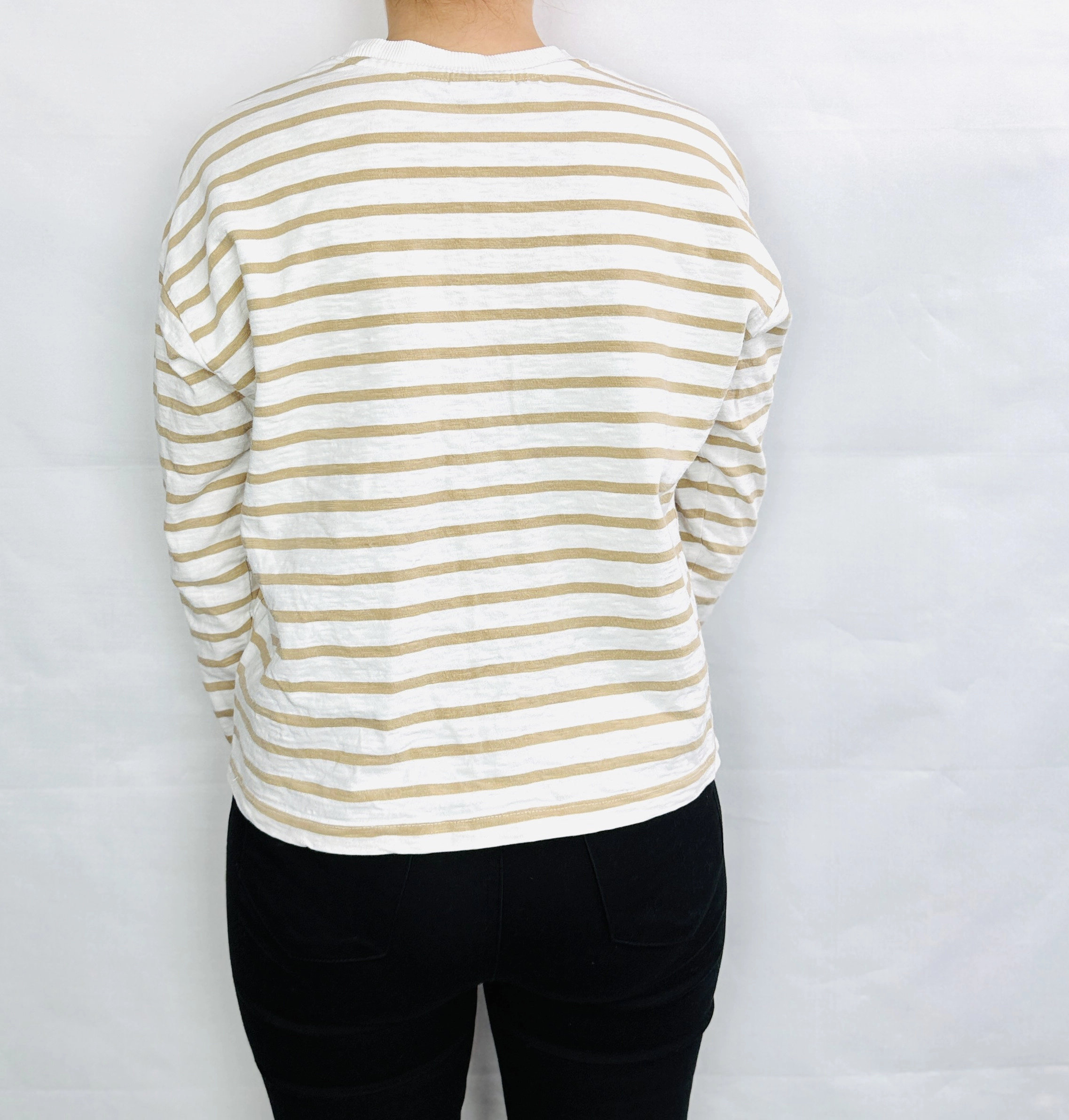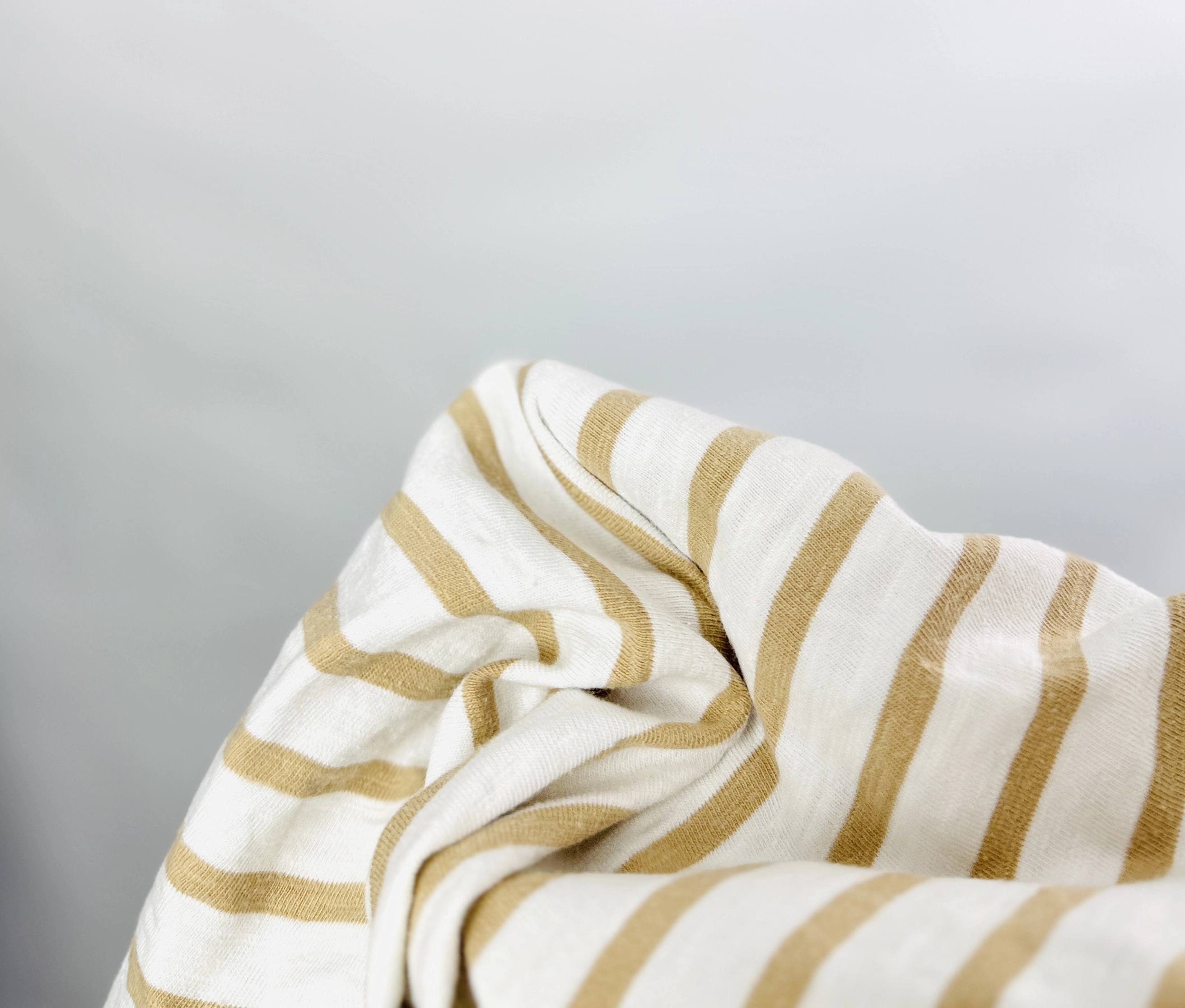 Ta biało beżowa bluzka to klasyka w nowoczesnym wydaniu, która łączy w sobie prostotę z subtelną elegancją i kobiecym wdziękiem. Delikatne, poziome paski w ciepłym odcieniu beżu na tle czystej bieli tworzą harmonijną i uniwersalną kompozycję, która doskonale wpisuje się w codzienne stylizacje, dodając im lekkości i świeżości. To ubranie, które emanuje naturalnością i ponadczasowym stylem, idealne dla kobiet ceniących sobie wygodę i modny wygląd.