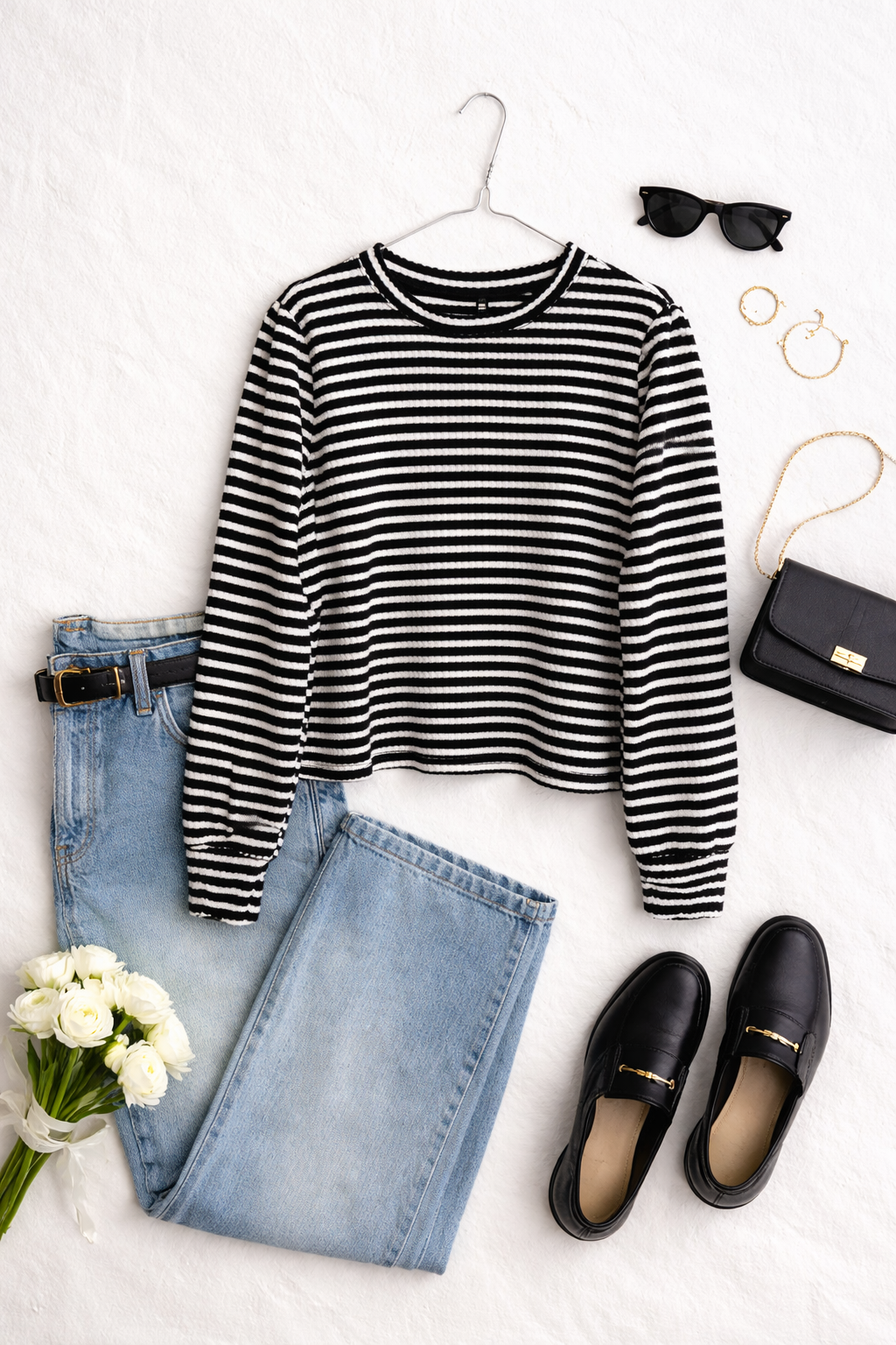 Krój wpływa na proporcje sylwetki: pudełkowa linia dyskretnie maskuje okolice talii i bioder, a poziome pasy przyciągają wzrok, tworząc wrażenie harmonijnego poszerzenia, które warto zrównoważyć dopasowanym dołem. Bluza dobrze komponuje się z sylwetkami prostokąt i gruszka, którym doda miękkiego zarysu, a przy odpowiednim doborze spodni pomoże osiągnąć zrównoważone proporcje. Dzięki długości do bioder model łatwo łączy się zarówno z wysokim stanem, jak i z bardziej klasycznymi spódnicami.