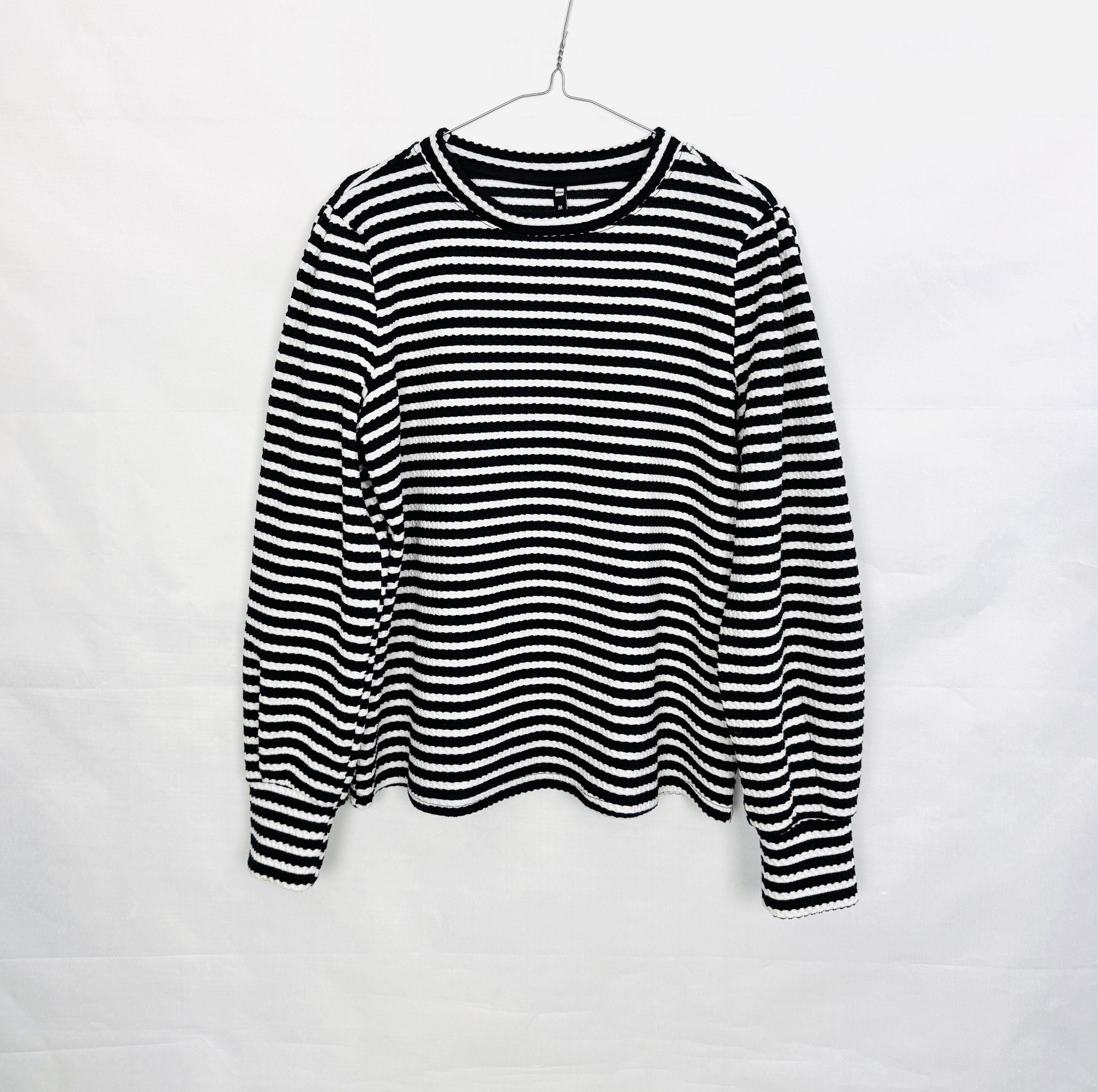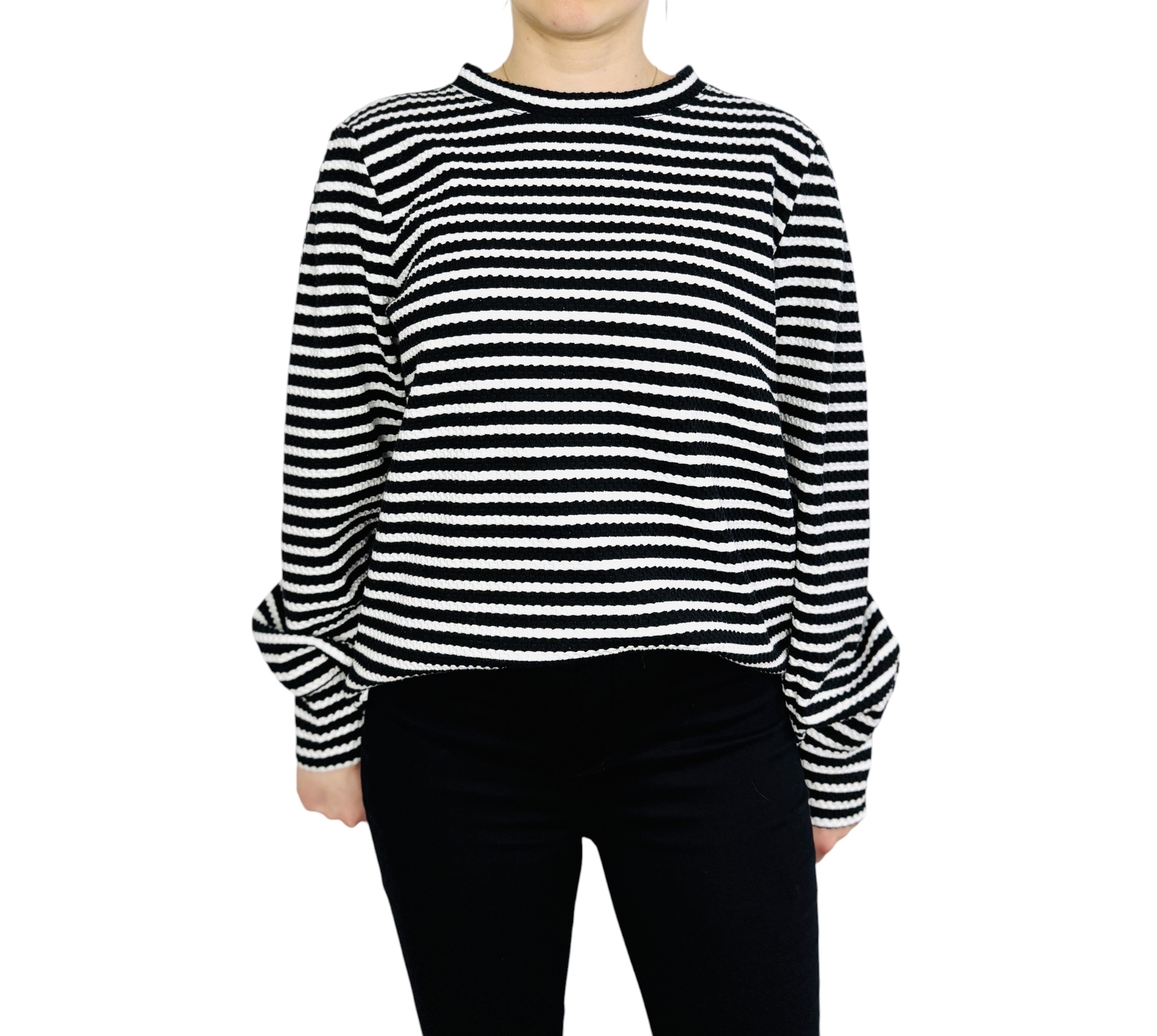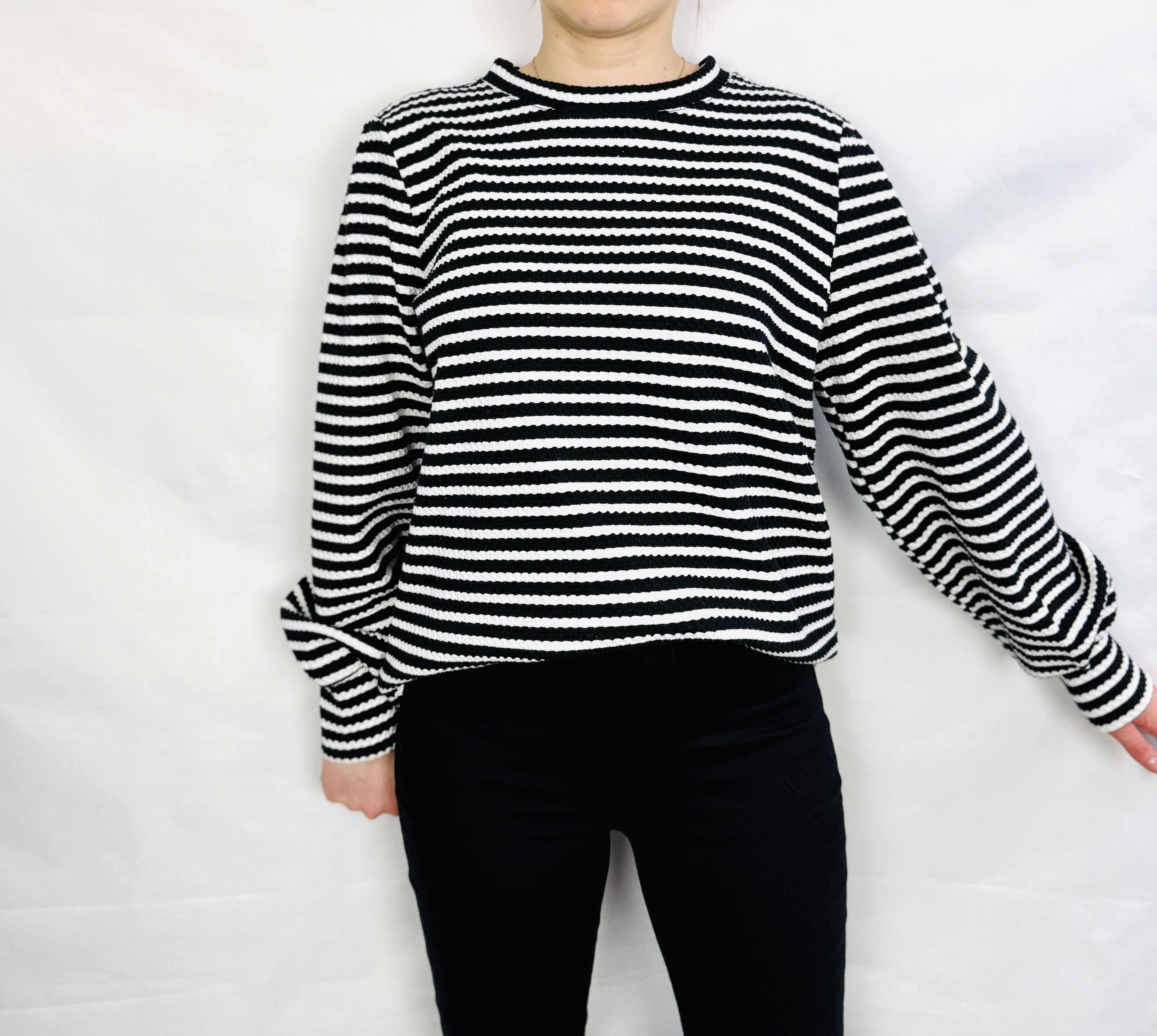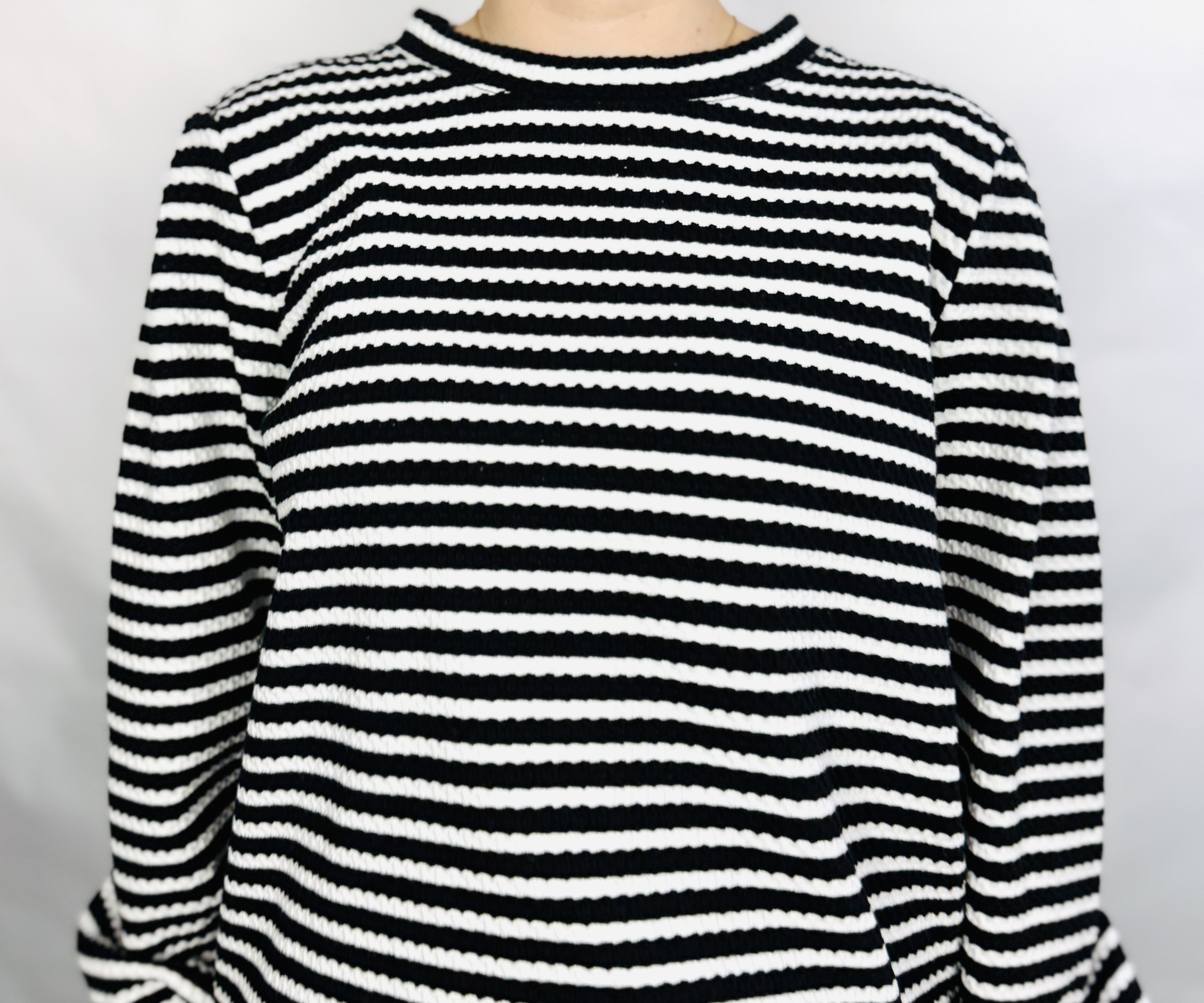 Dzianina prezentuje się jako miękko pleciona, o wyraźnej, prążkowanej fakturze, która dodaje bluzie głębi i przyjemnego w dotyku wyrazu. Materiał wygląda na nieco grubszy i otulający, co zapewnia komfort i utrzymanie formy, a jednocześnie nie jest ciężki; powierzchnia zachowuje gładkość z delikatnym, matowym finiszem. Paski tworzą optyczny rytm — regularne naprzemienne pasma podkreślają geometryczny charakter projektu i nadają mu zdecydowanego, lecz harmonijnego wydźwięku.