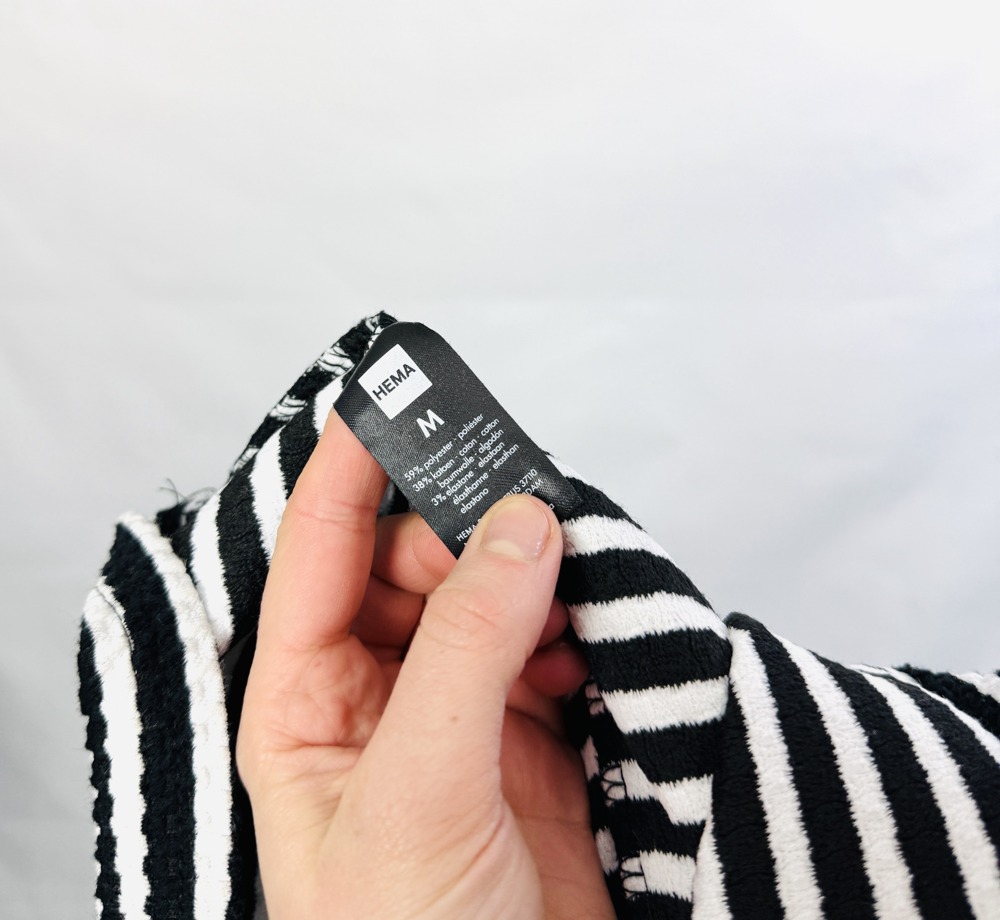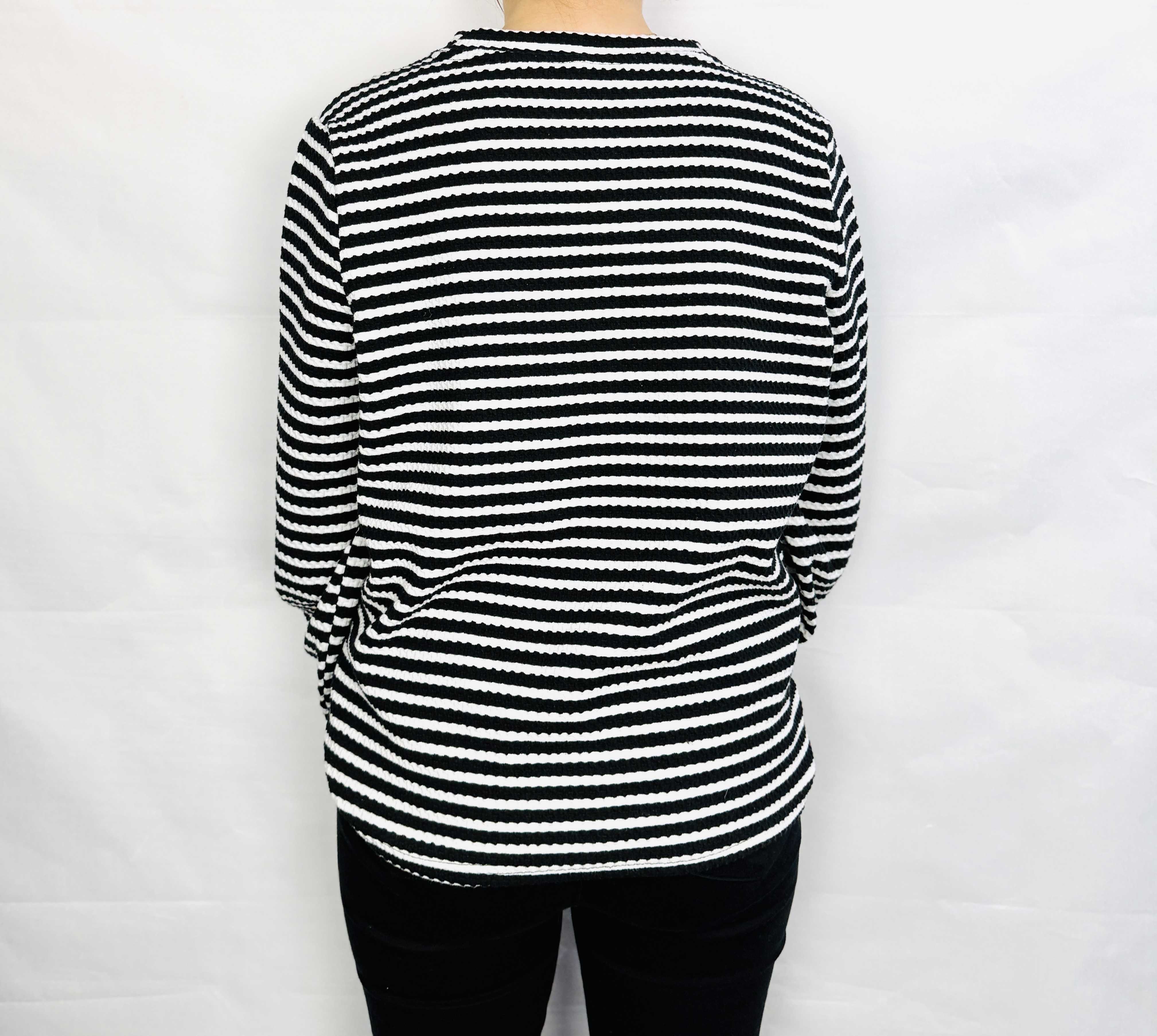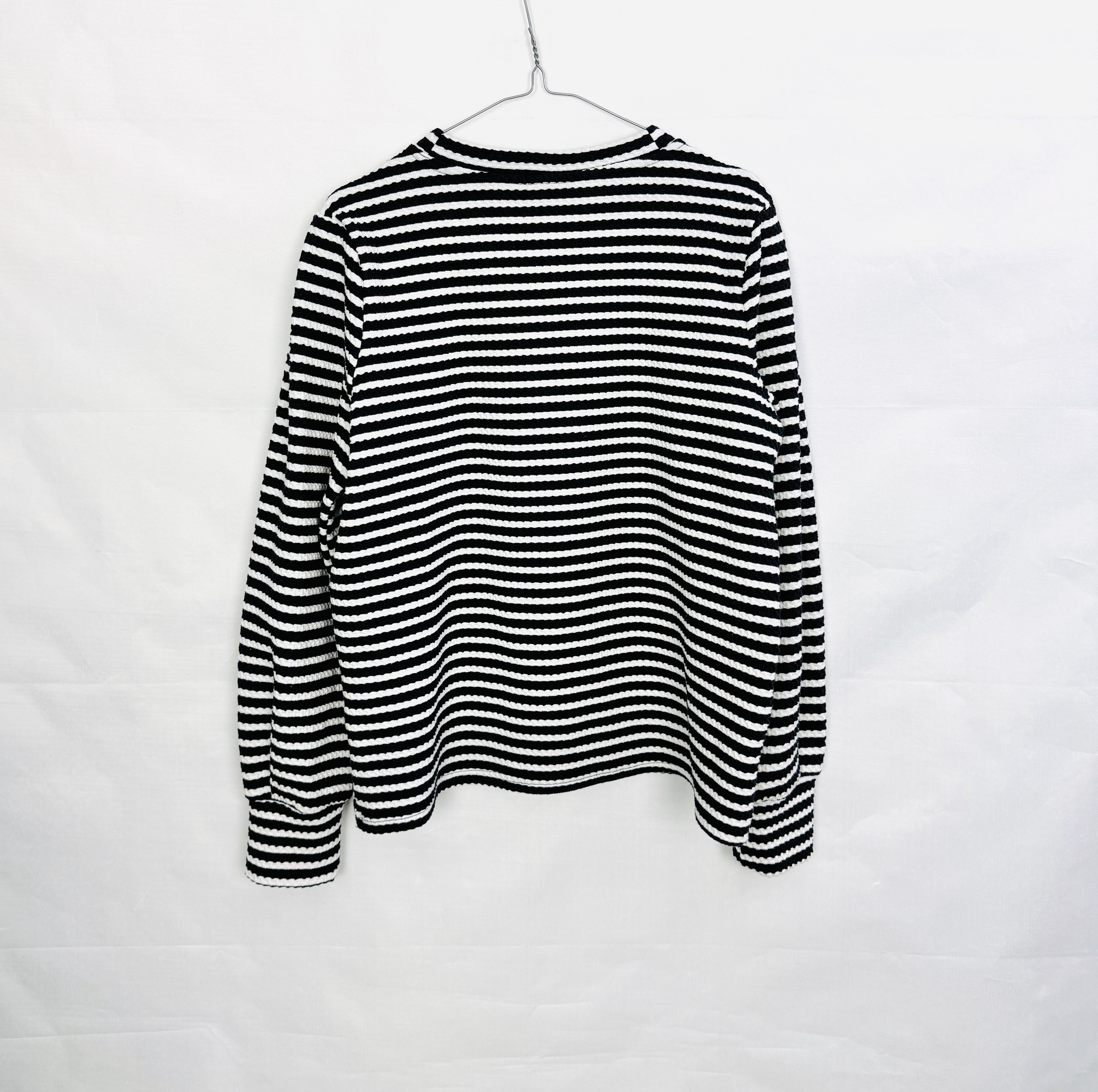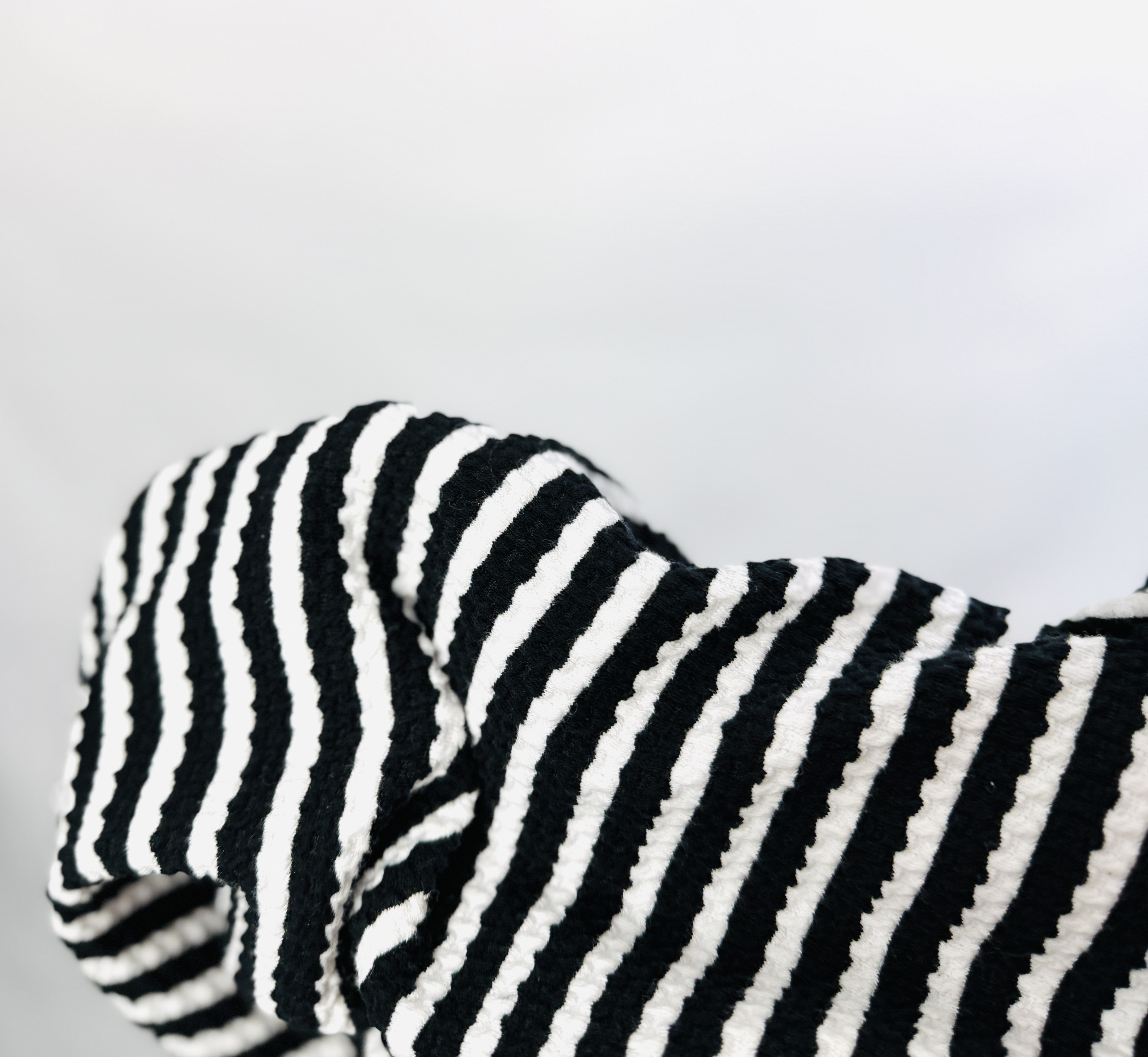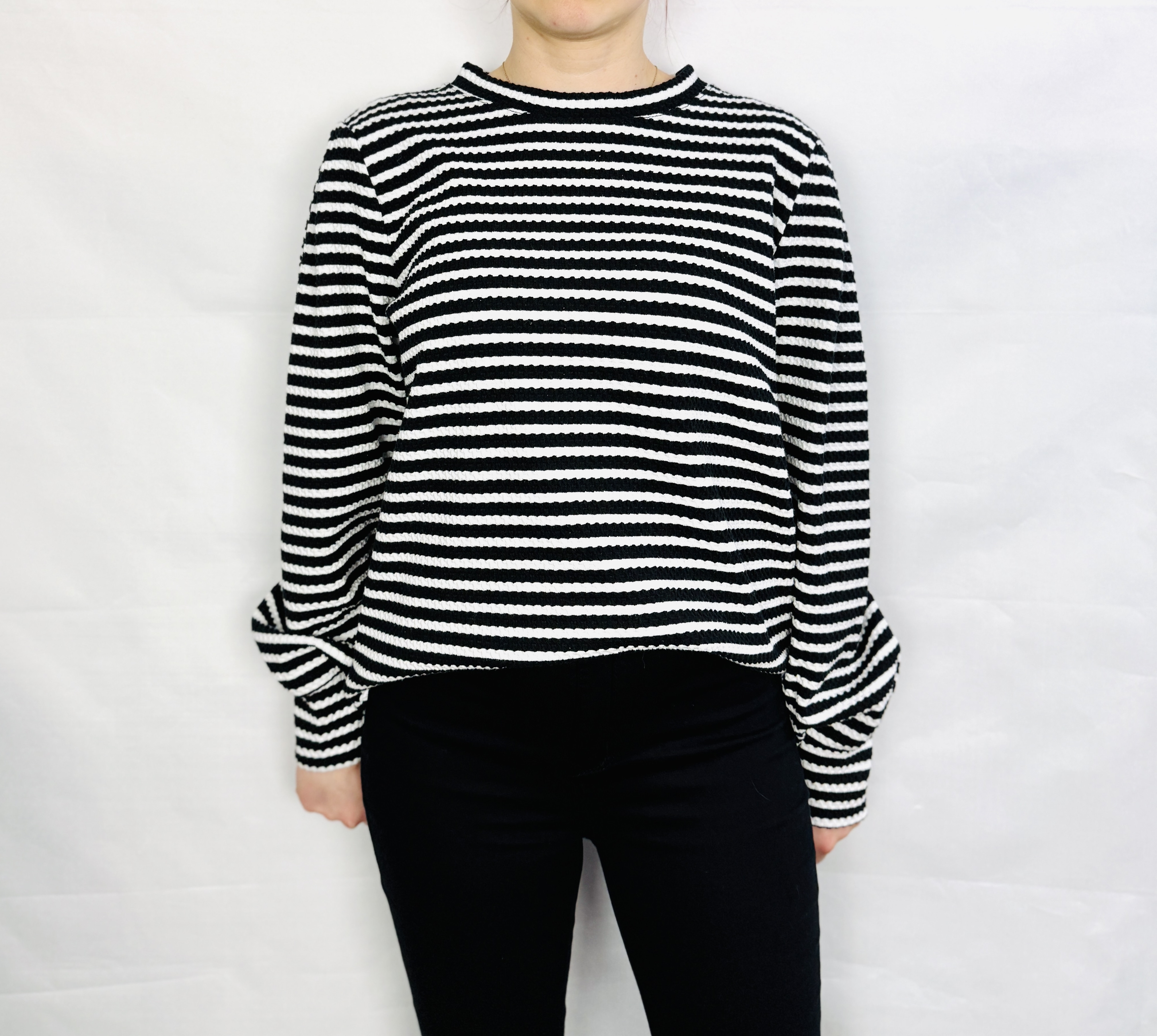 Dzianina prezentuje się jako miękko pleciona, o wyraźnej, prążkowanej fakturze, która dodaje bluzie głębi i przyjemnego w dotyku wyrazu. Materiał wygląda na nieco grubszy i otulający, co zapewnia komfort i utrzymanie formy, a jednocześnie nie jest ciężki; powierzchnia zachowuje gładkość z delikatnym, matowym finiszem. Paski tworzą optyczny rytm — regularne naprzemienne pasma podkreślają geometryczny charakter projektu i nadają mu zdecydowanego, lecz harmonijnego wydźwięku.