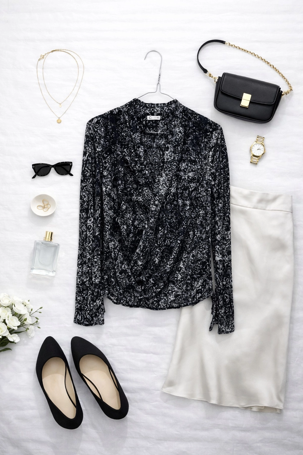Krój kopertowy z dekoltem w serek wspaniale wpływa na modelowanie sylwetki, oferując wizualne wysmuklenie góry oraz piękne podkreślenie linii biustu. Drapowanie w okolicy pasa działa jak nastrojowy retusz, skutecznie maskując ewentualne niedoskonałości w okolicach brzucha i bioder, co czyni tę bluzkę idealnym wyborem dla sylwetki typu jabłko lub klepsydra. Pionowa linia dekoltu w połączeniu z ciemnym tłem optycznie wydłuża tors, nadając postaci zgrabny i harmonijny wygląd. Bluzka dodaje postawie gracji i lekkości, sprawiając, że cała sylwetka prezentuje się proporcjonalnie i niezwykle kobieco w każdej sytuacji.