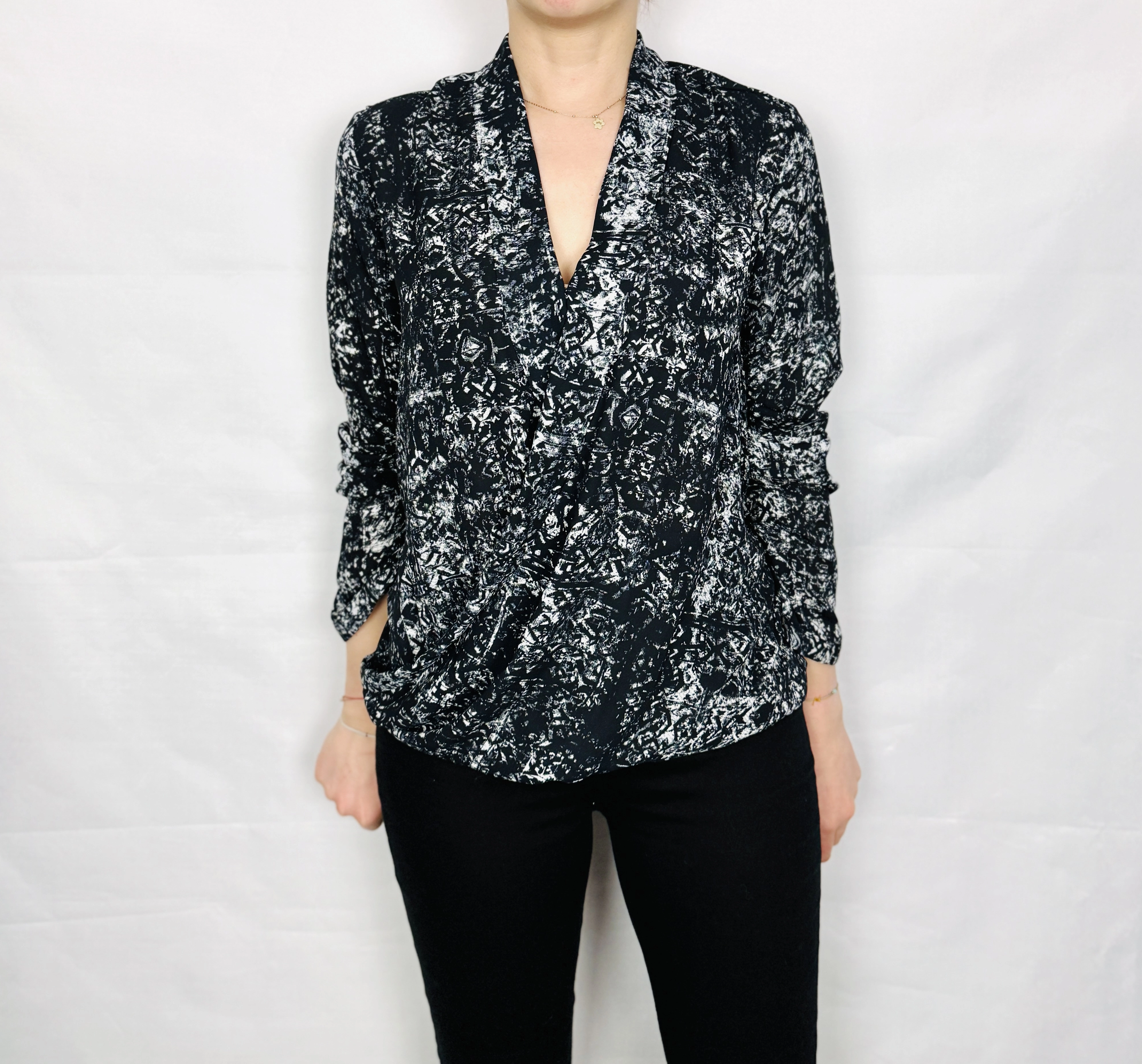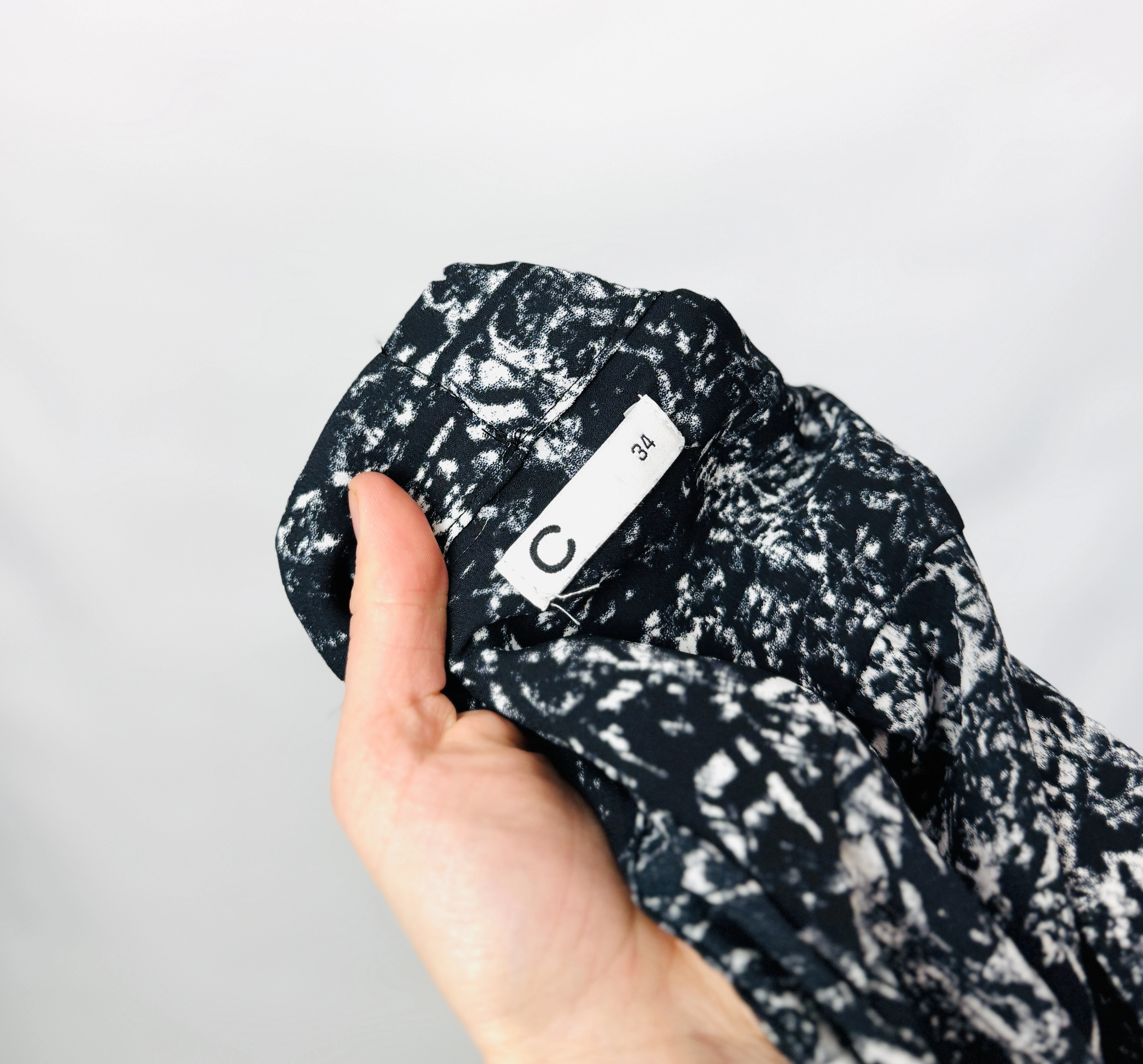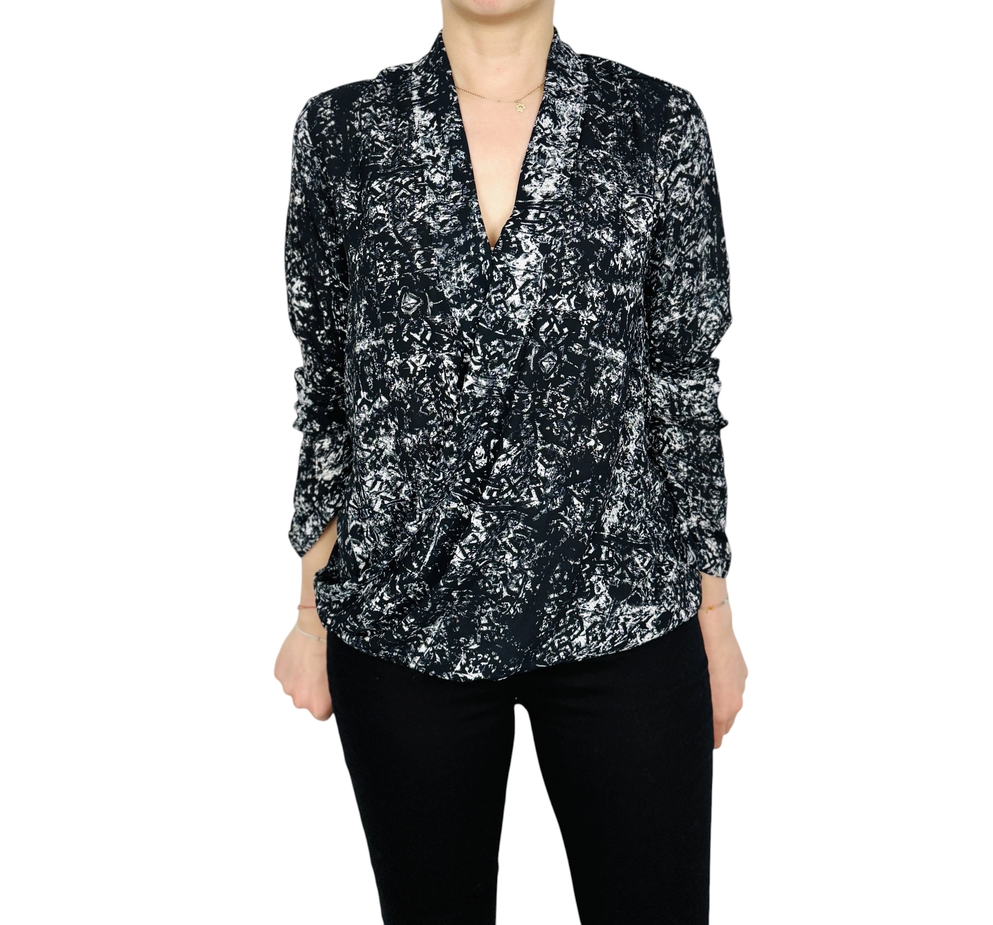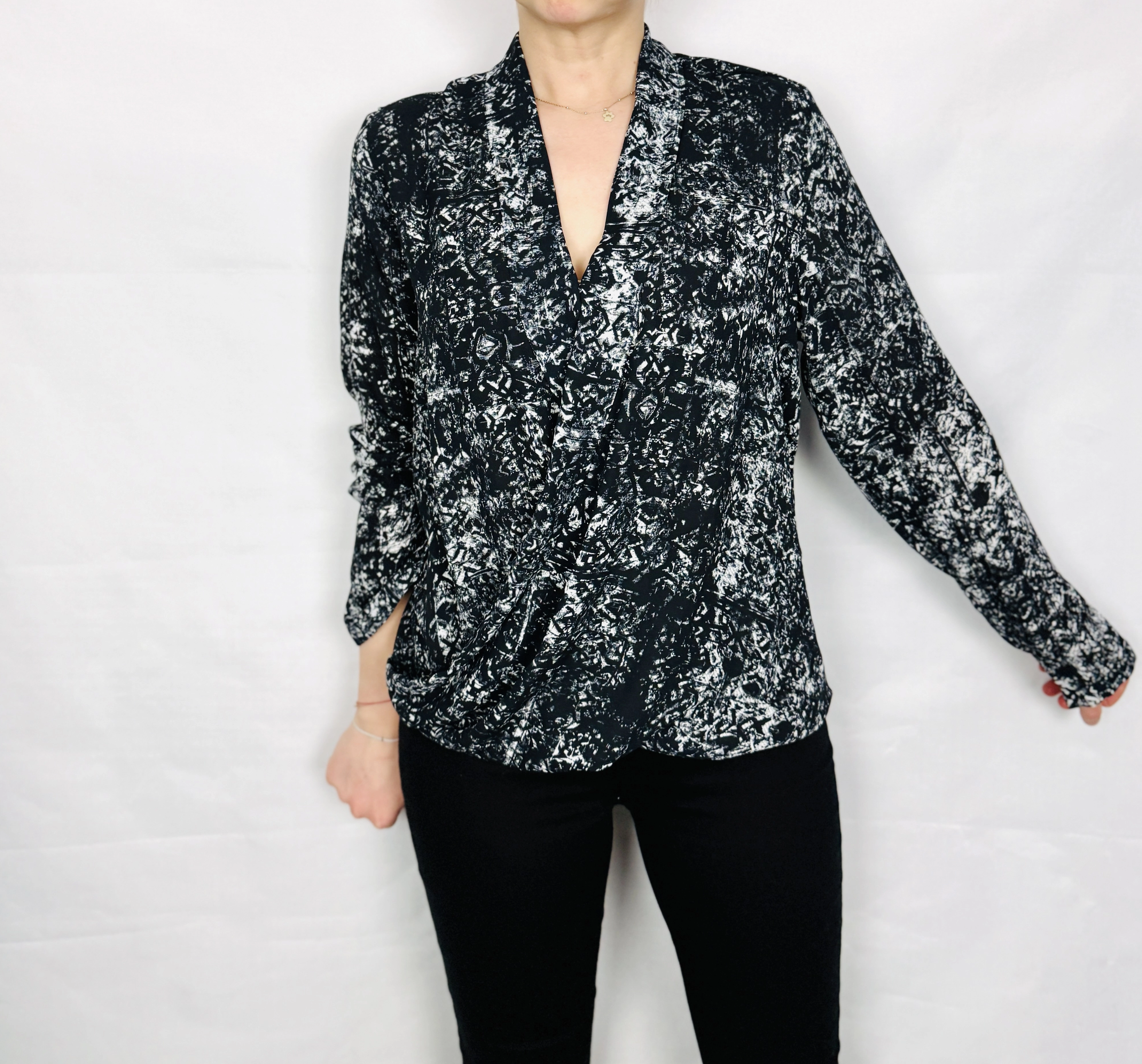 Ta bluzka to kwintesencja nowoczesnej elegancji przełamanej artystycznym nieładem. Kontrastowe połączenie głębokiej czerni z jasnymi, nieregularnymi plamami tworzy nastrojowy, niemal malarski wzór, który od razu przyciąga wzrok i nadaje stylizacji wyrazistego charakteru. To idealna propozycja dla kobiet, które szukają ubrań oryginalnych, a jednocześnie łatwych w stylizowaniu. Bluzka emanuje pewnością siebie i kreatywnością, świetnie odnajdując się zarówno w surowych, miejskich zestawach, jak i w bardziej swobodnych, kobiecych interpretacjach mody biurowej. Jej dynamiczny deseń sprawia, że nawet najprostsze zestawienie nabiera unikalnego sznytu i artystycznej głębi.