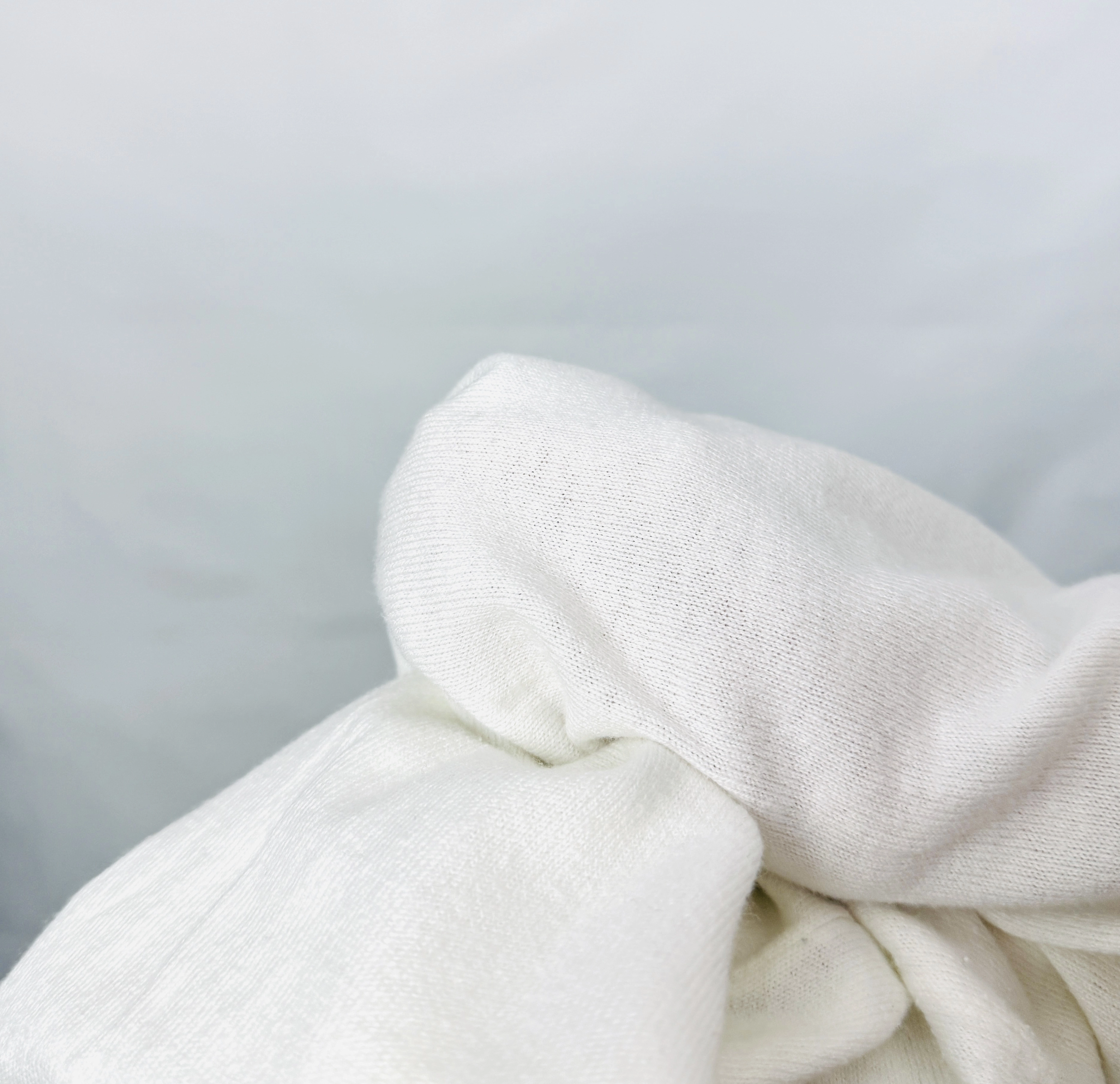 Materiał, z którego wykonano sweterek, jest miękki, elastyczny i delikatnie lejący, co zapewnia wygodę i przyjemne uczucie otulenia. Tkanina ma gładką, matową powierzchnię, która podkreśla pastelowy odcień bieli i sprawia, że ubranie wygląda świeżo i schludnie. Sweterek miękko układa się na sylwetce, nie dodając zbędnej objętości, a jednocześnie otula ciało, tworząc efekt przytulnej otuliny.