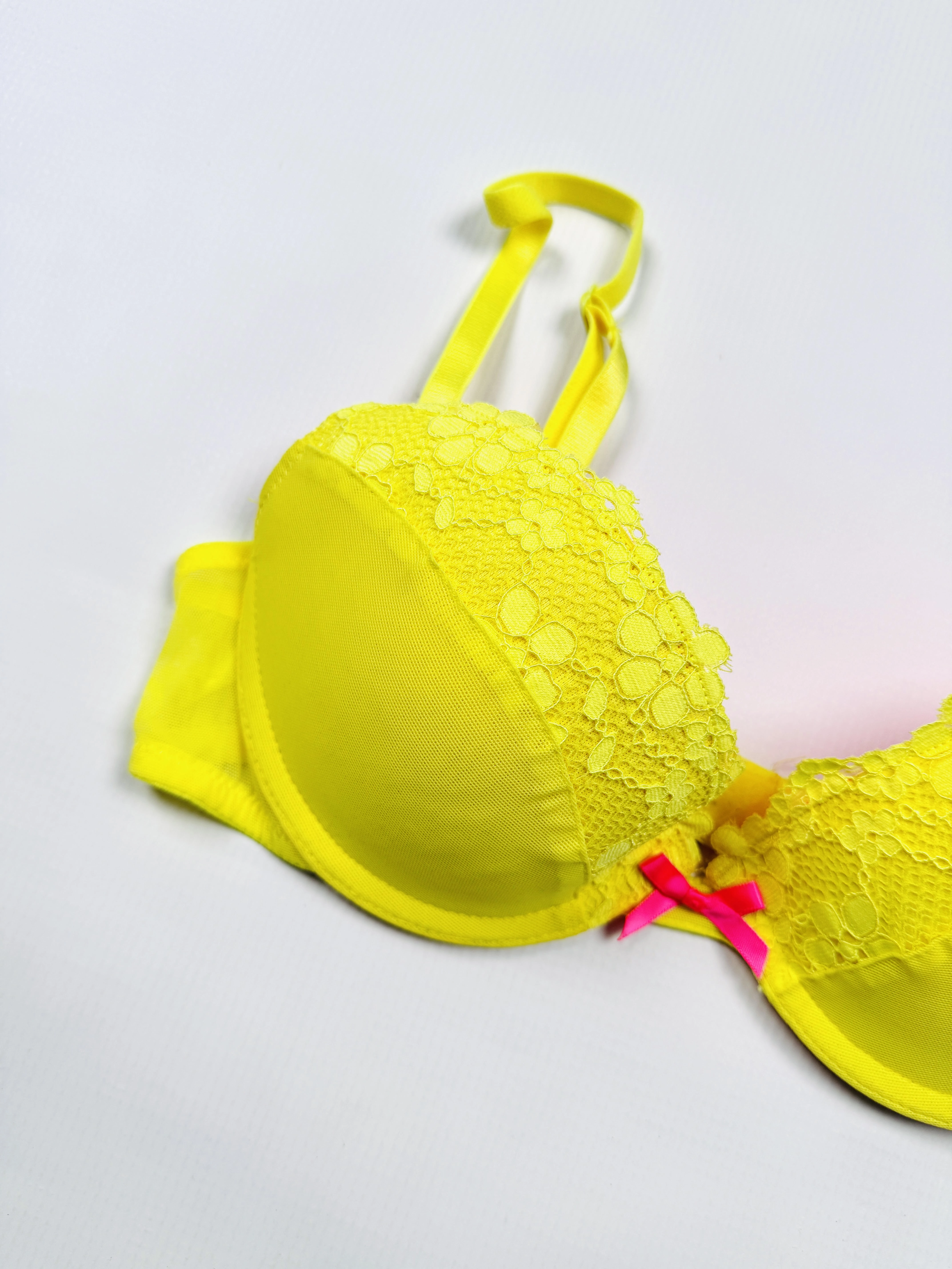 Biustonosz ma fiszbiny, w miseczkach ma wypełnienie oraz dodatkowe grubsze wypełnienie w ich dolnej części.