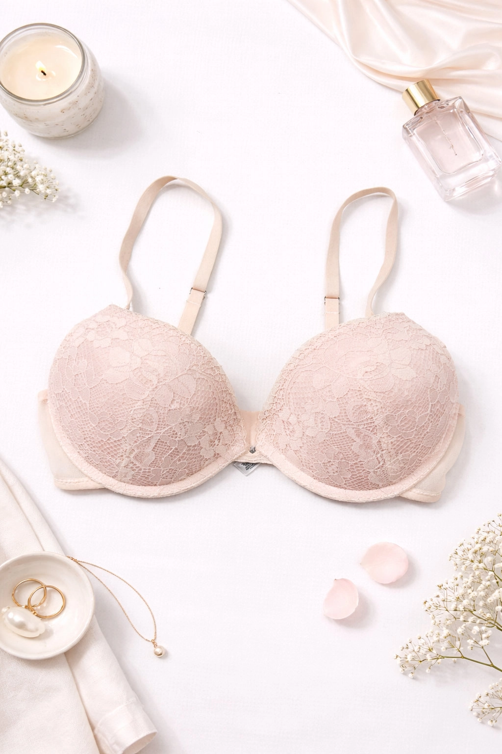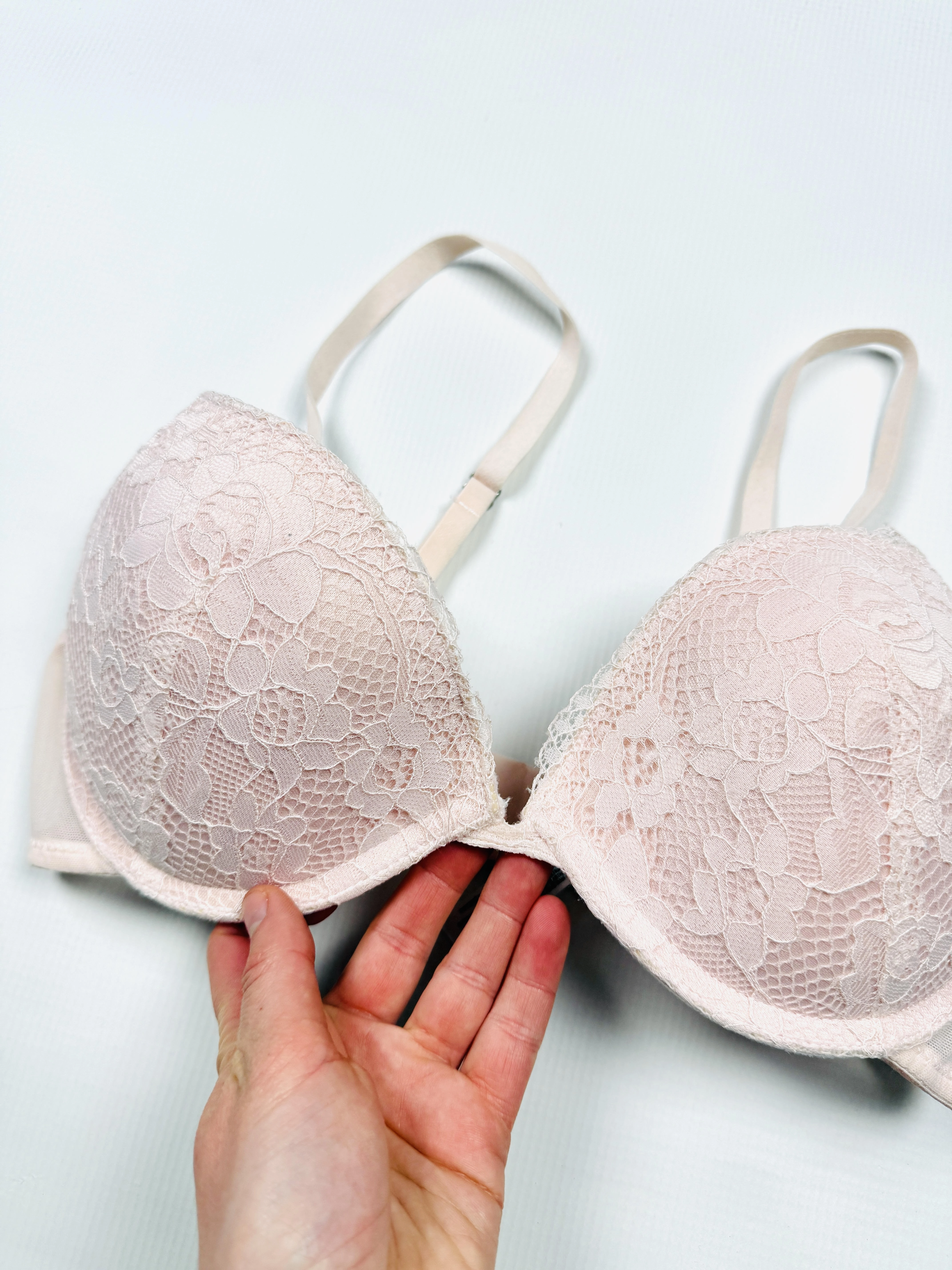 Biustonosz ma fiszbiny, w miseczkach ma wypełnienie oraz dodatkowe grubsze wypełnienie w ich dolnej części.
