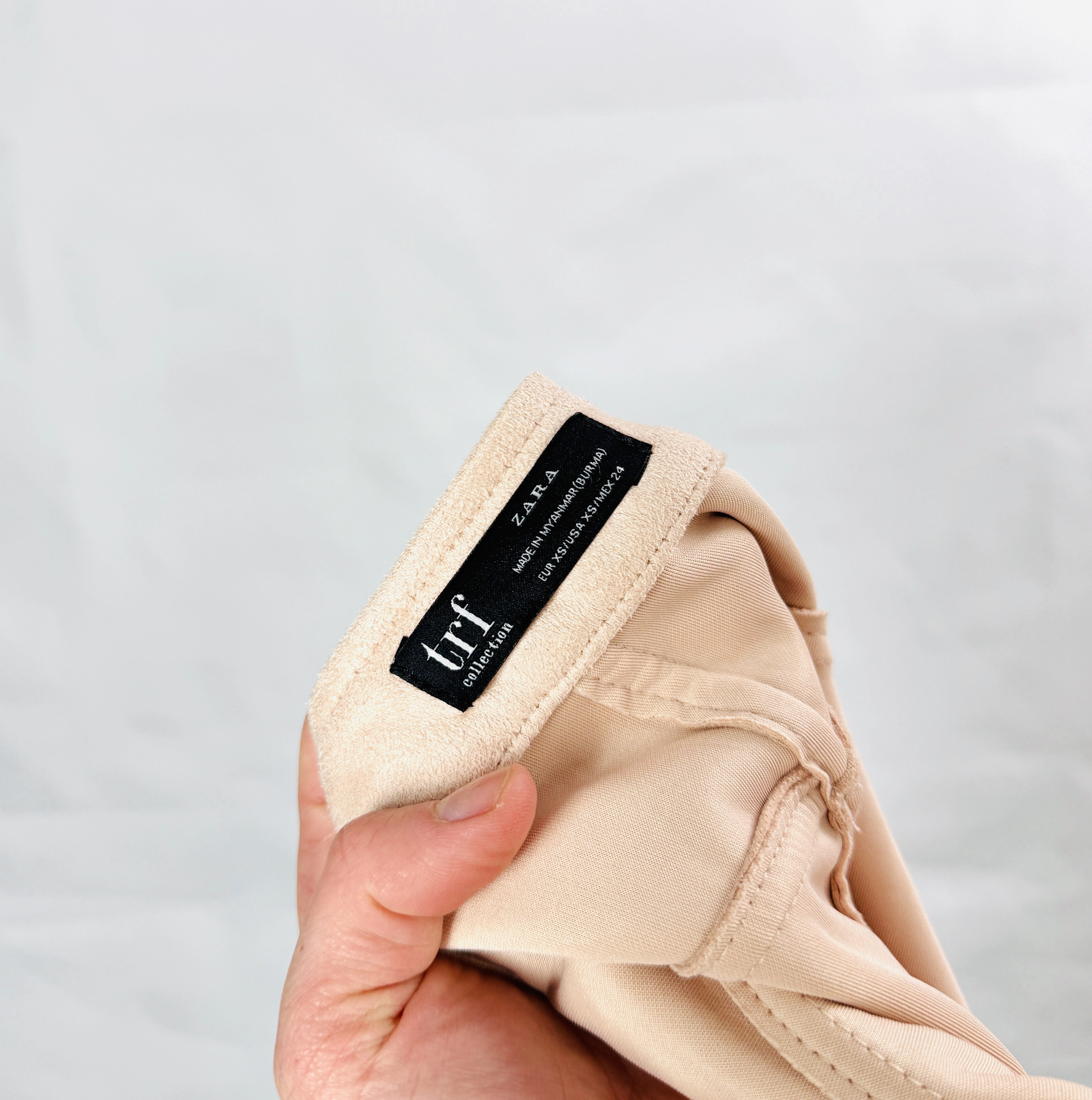 Materiał, z którego wykonano spódnicę, jest miękki i nieco grubszy, o charakterystycznej dla zamszu, matowej i aksamitnej strukturze, która pięknie pochłania światło i dodaje ubraniu szlachetności. Tkanina jest przyjemna w dotyku i elastyczna, dzięki czemu spódnica doskonale pracuje razem z ciałem i nie krępuje ruchów. Dzięki swojej gęstości materiał trzyma formę i zapewnia estetyczny wygląd przez cały dzień. Bladoróżowy kolor jest jednolity i bardzo subtelny, co sprawia, że całość prezentuje się niezwykle luksusowo i nowocześnie, stanowiąc doskonały fundament dla wielu różnorodnych zestawień kolorystycznych.