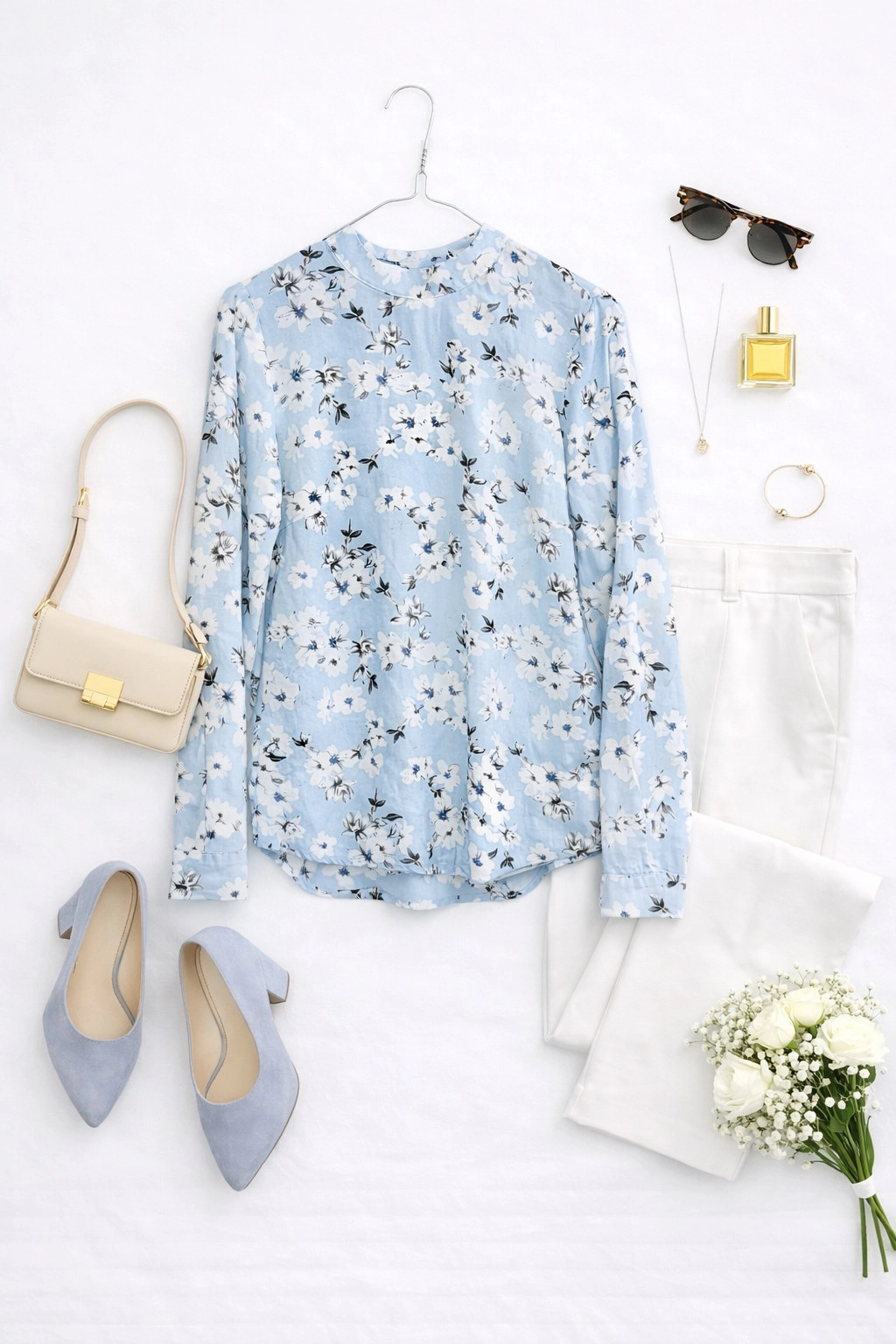 Długość bluzki sięga do bioder, co czyni ją niezwykle praktyczną i łatwą do stylizowania z różnorodnymi elementami garderoby. Doskonale komponuje się zarówno z klasycznymi jeansami, jak i eleganckimi spódnicami czy spodniami o prostym kroju, tworząc stylizacje na wiele okazji – od codziennych spacerów, przez wyjścia do pracy, aż po bardziej formalne wydarzenia. Błękitny kolor z kwiatowym wzorem pozwala na łatwe łączenie z neutralnymi barwami, takimi jak biel, szarość czy beż, ale także z pastelami i delikatnymi akcentami w kolorze mięty czy różu, co daje szerokie możliwości stylizacyjne.